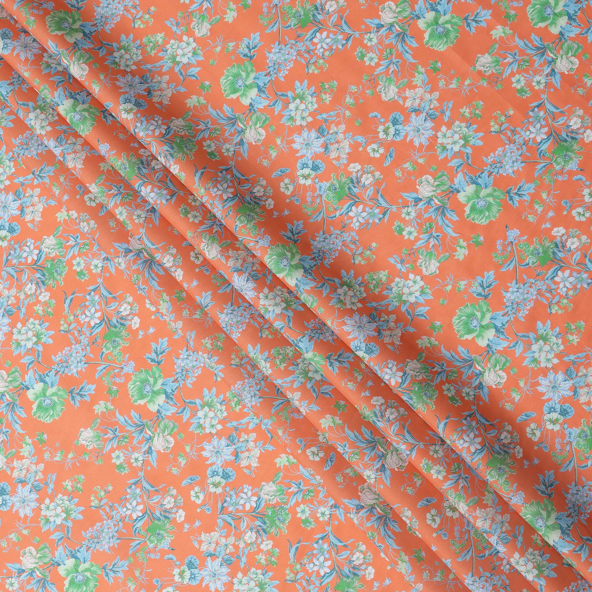Premium Peach Base with Green and Blue Floral Print Pure Cotton Lawn Fabric with fine texture