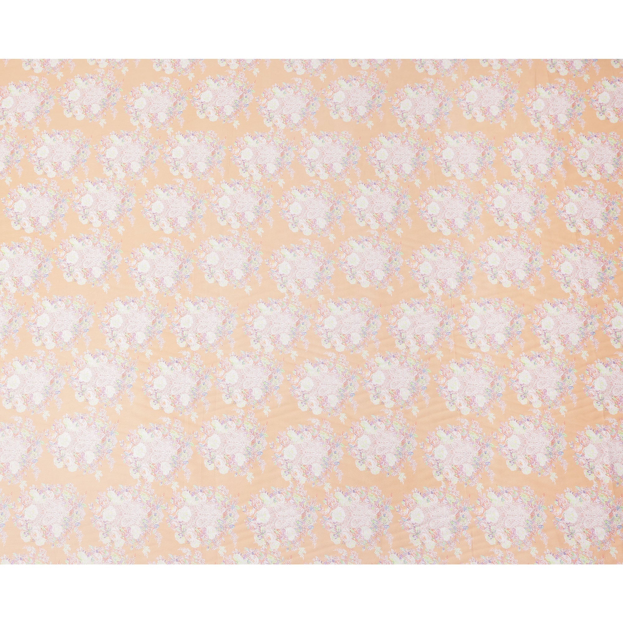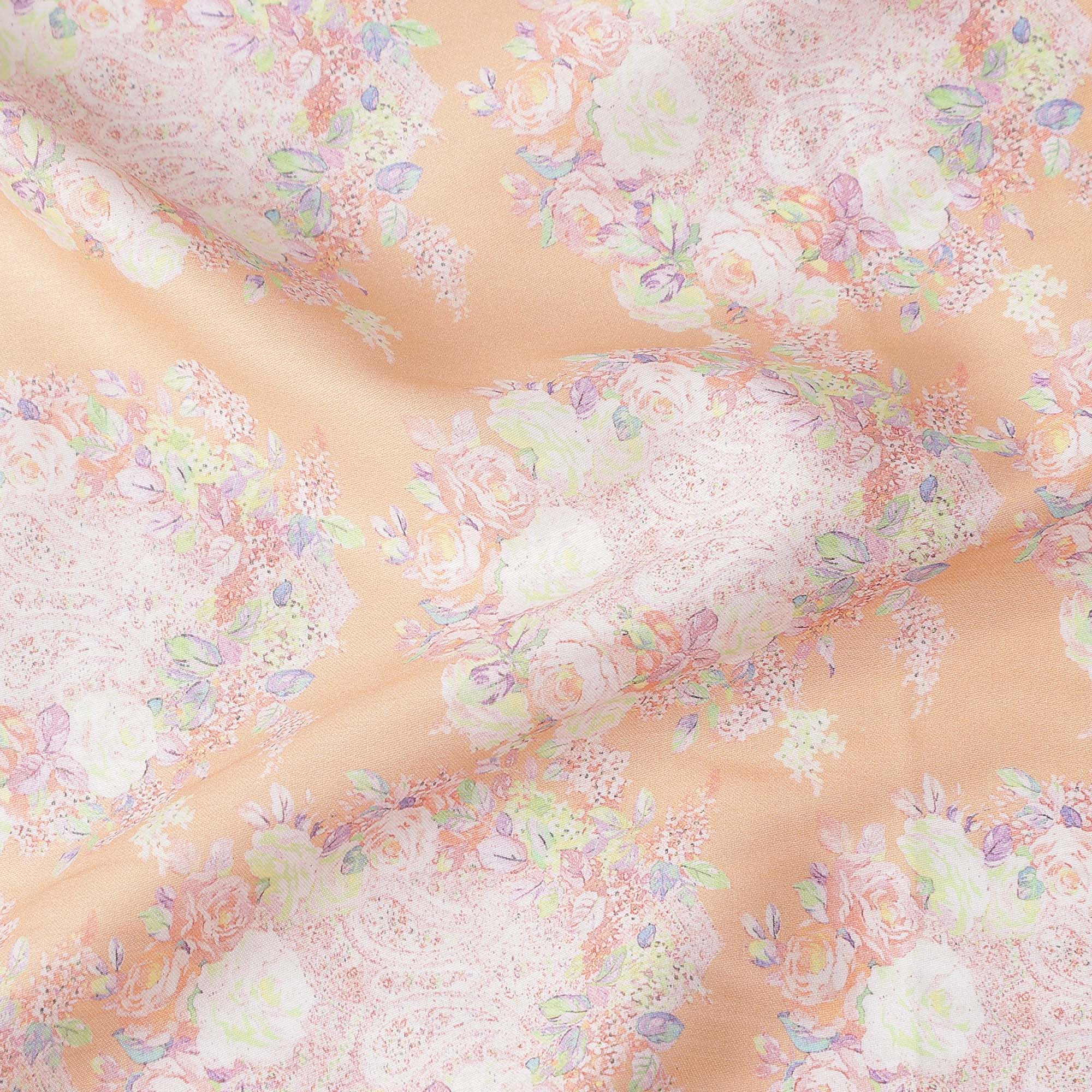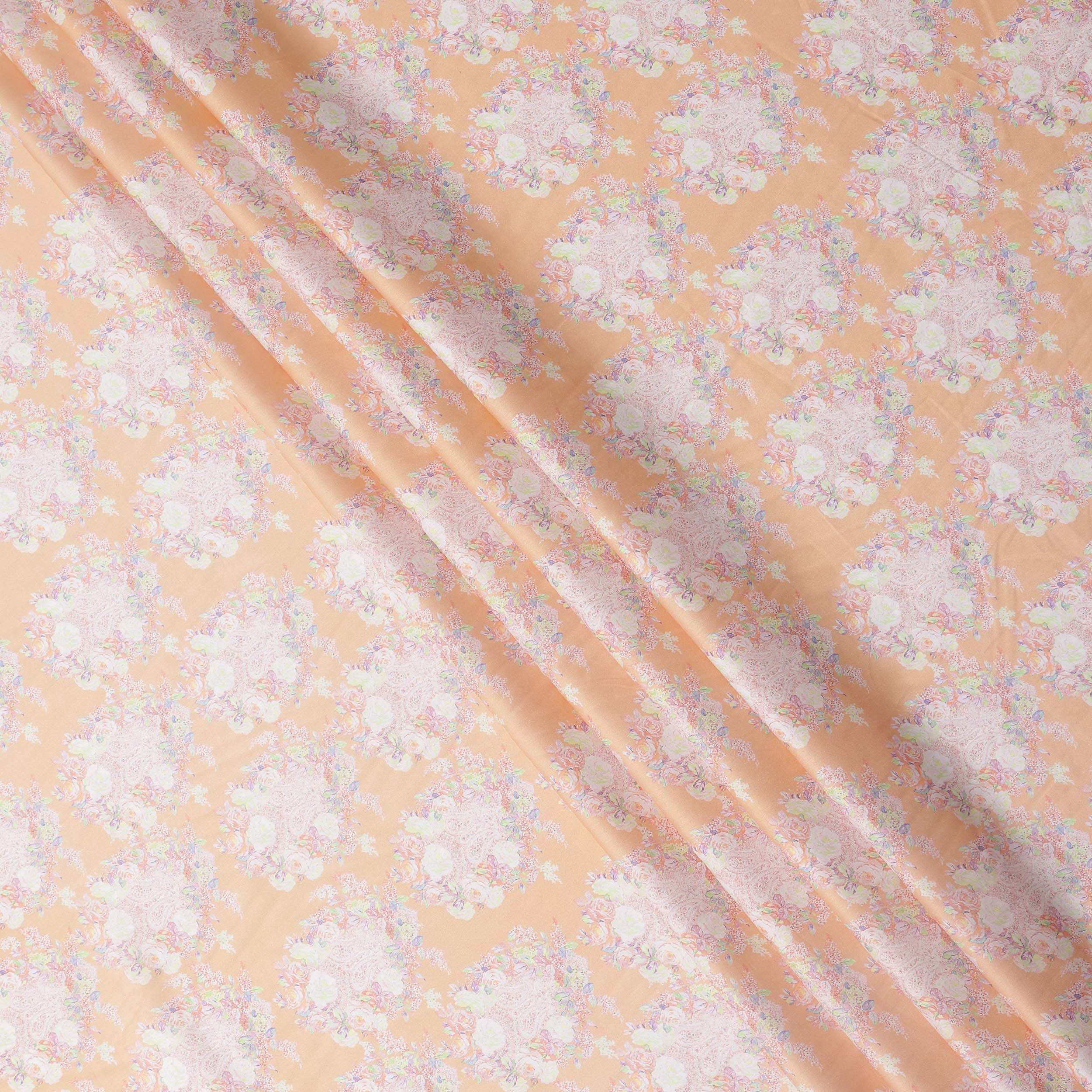 Peach Base with White and Pastel Floral Print Pure Cotton Satin Fabric, 140 Cms Width, Made in India-D26023