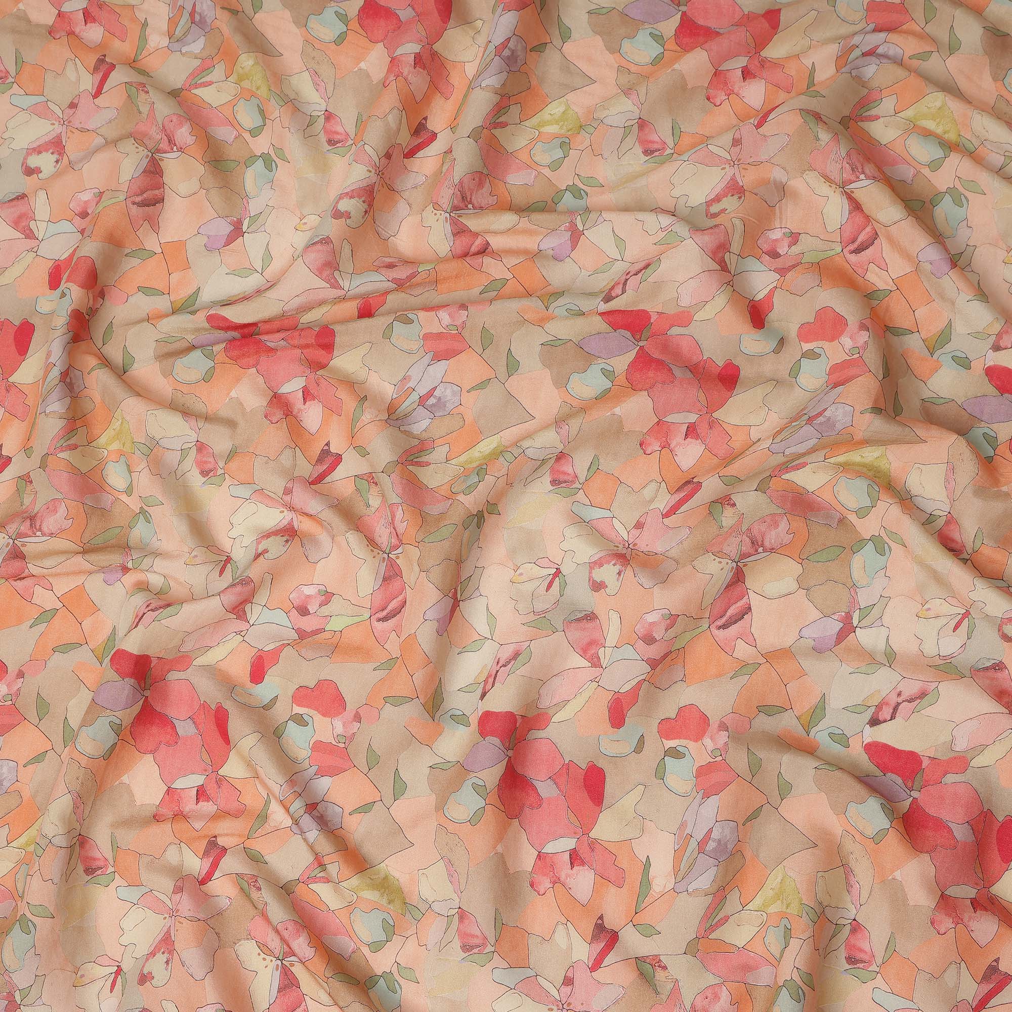 Peach beige base with abstract pastel floral print creates a fresh and artistic look suitable for stylish garments.