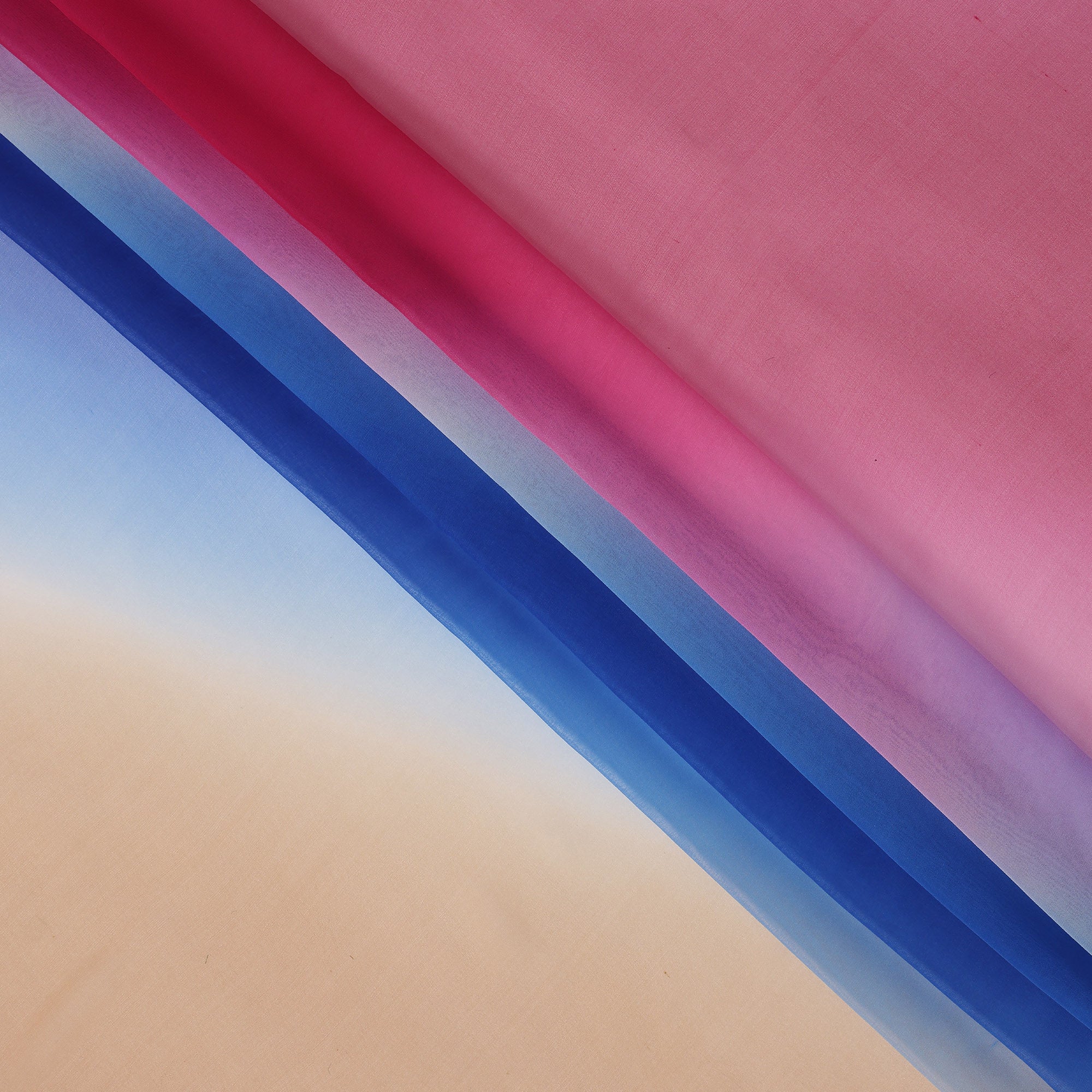 Peach, blue, and pink silk georgette fabric with diagonal ombre print