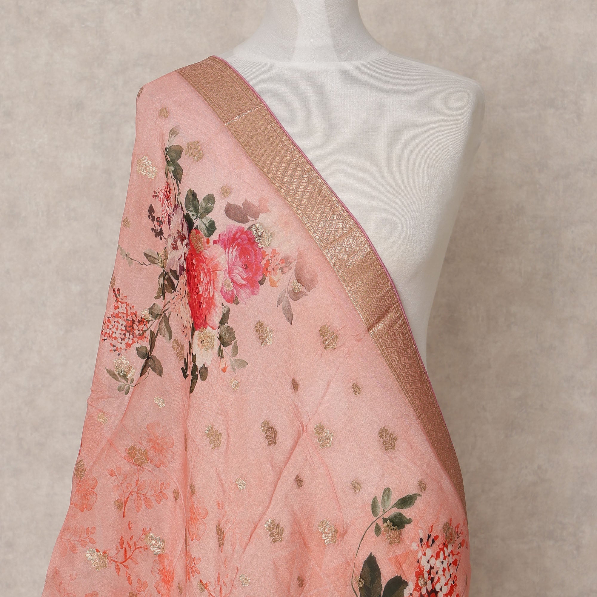 Peach Floral Digital Print Zari Border Premium Tussar Silk Dupatta, 225X85 Cms, Made in India-D25776