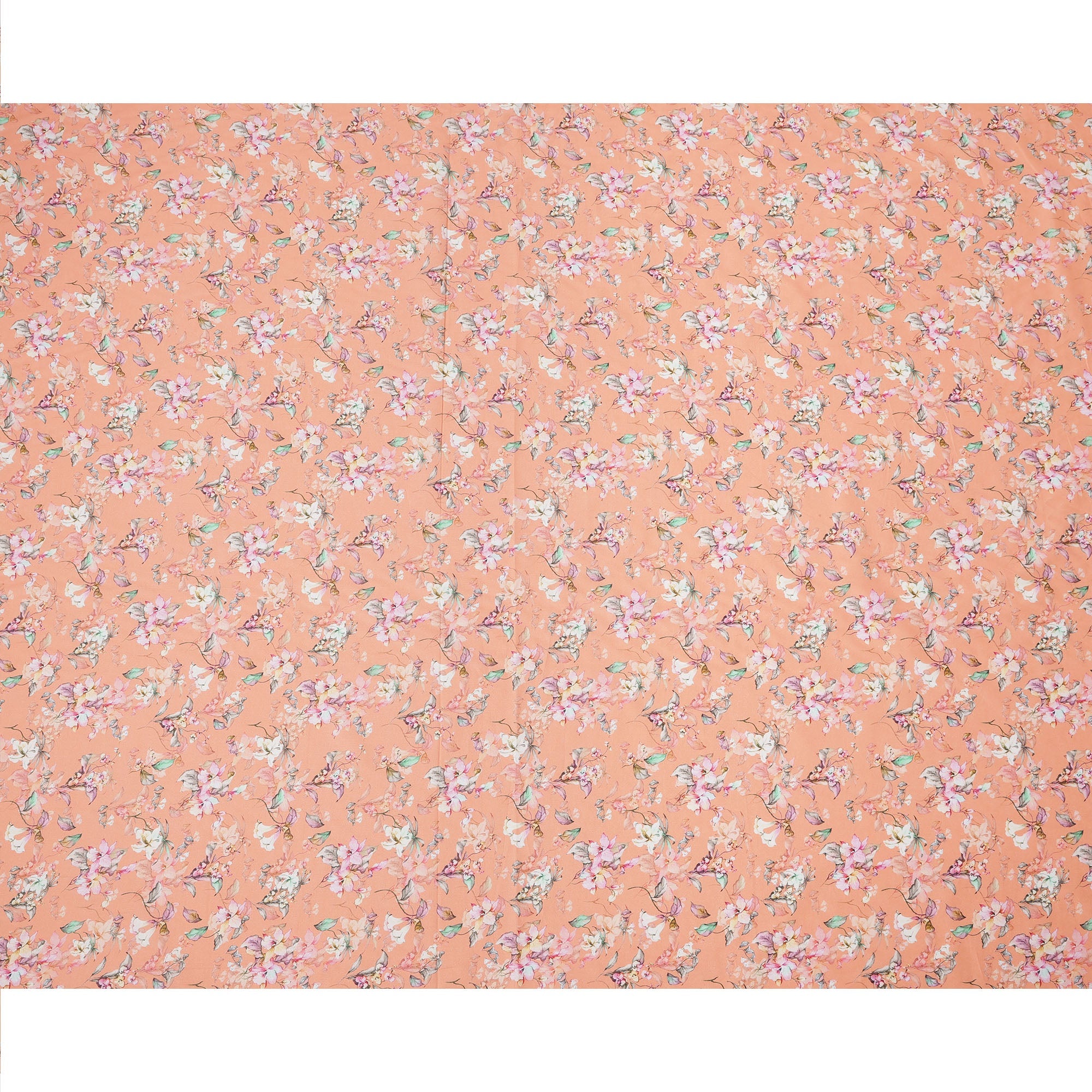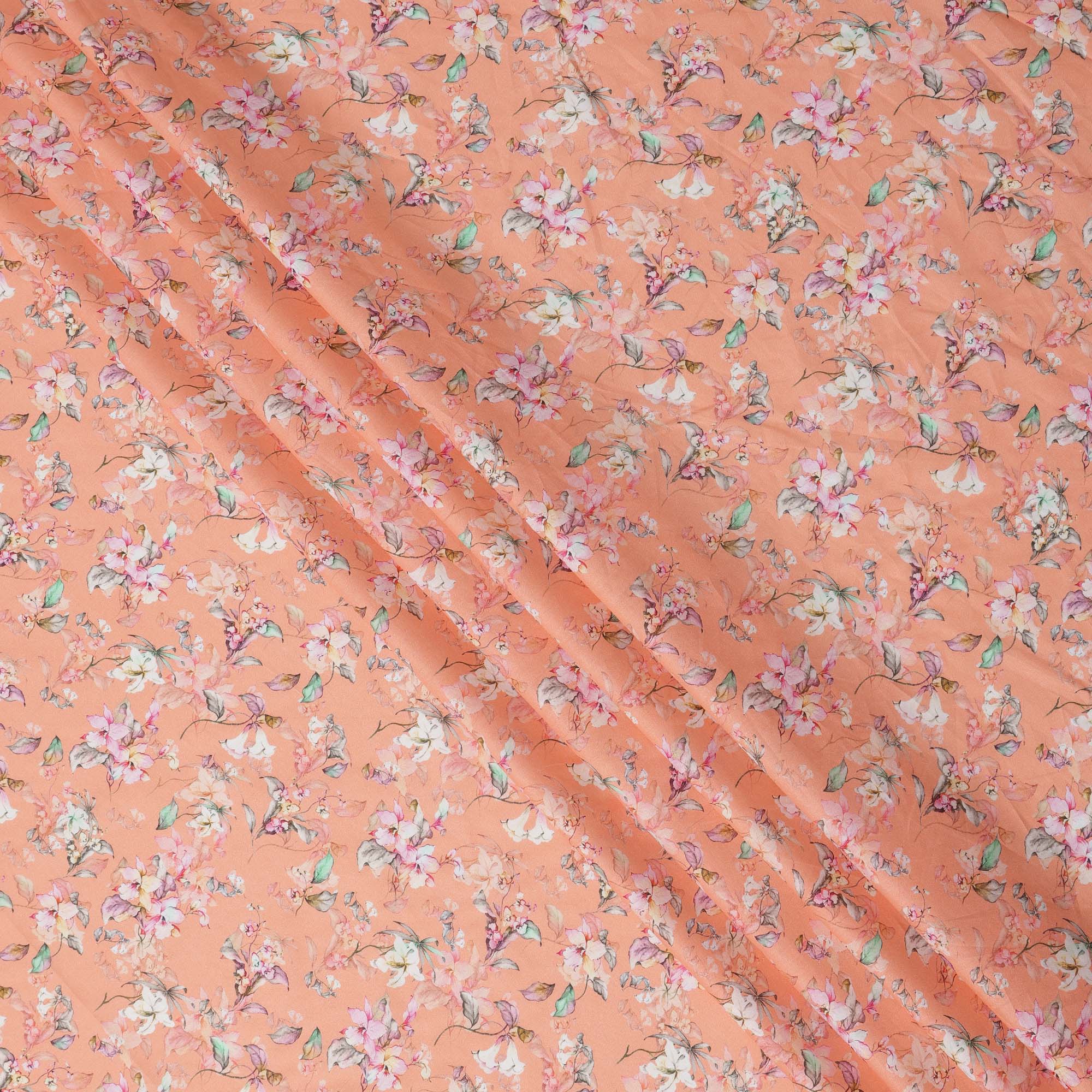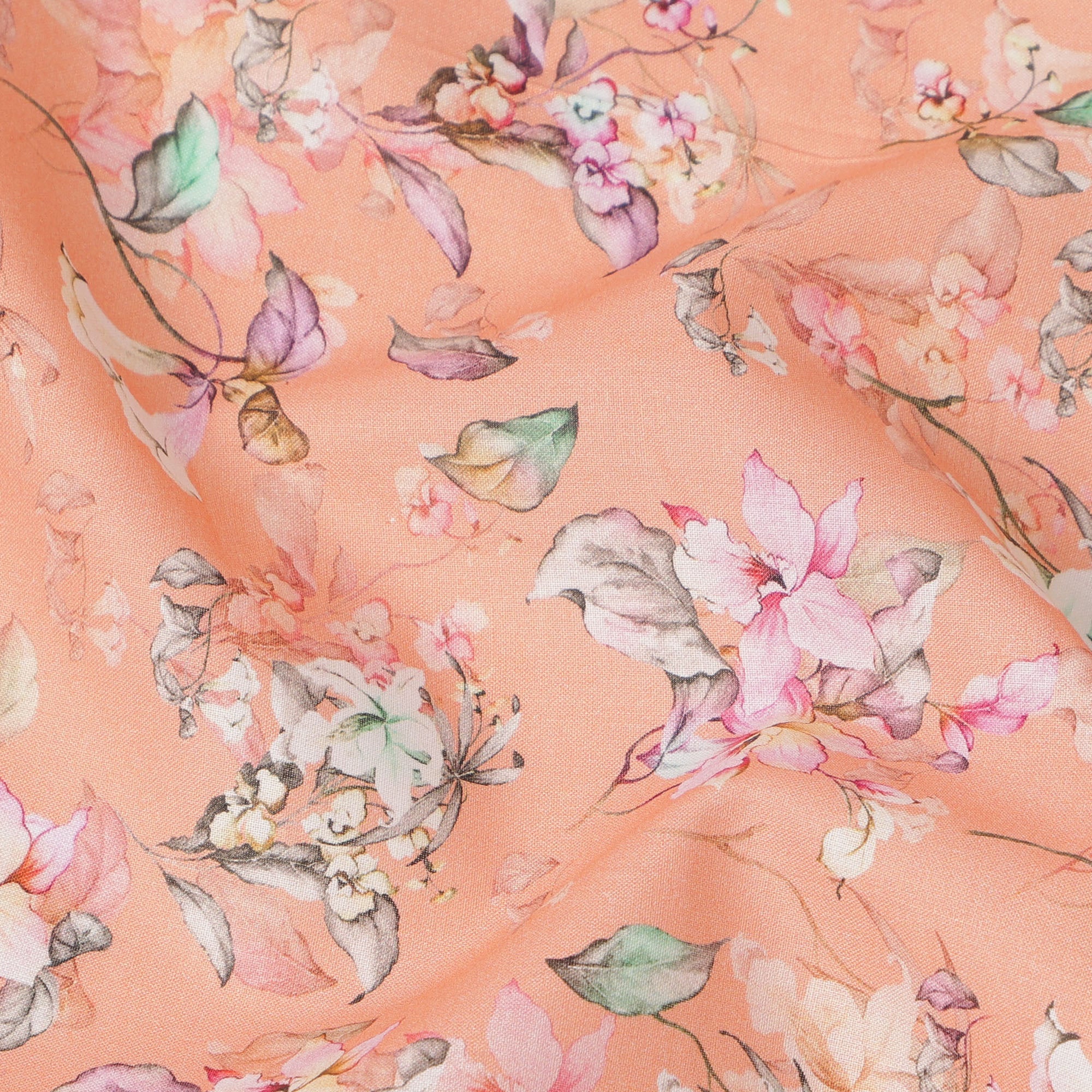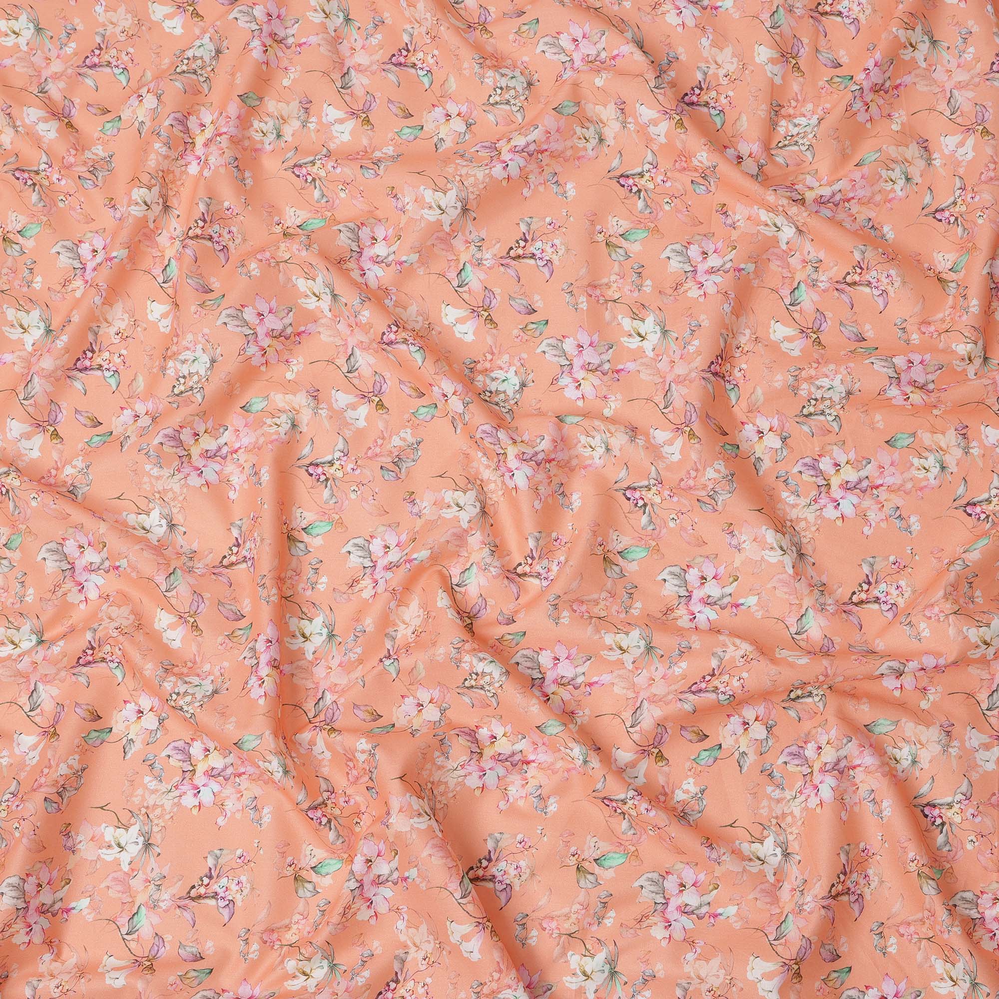 Peach cotton lawn fabric with elegant floral design in pink, white, and lilac tones