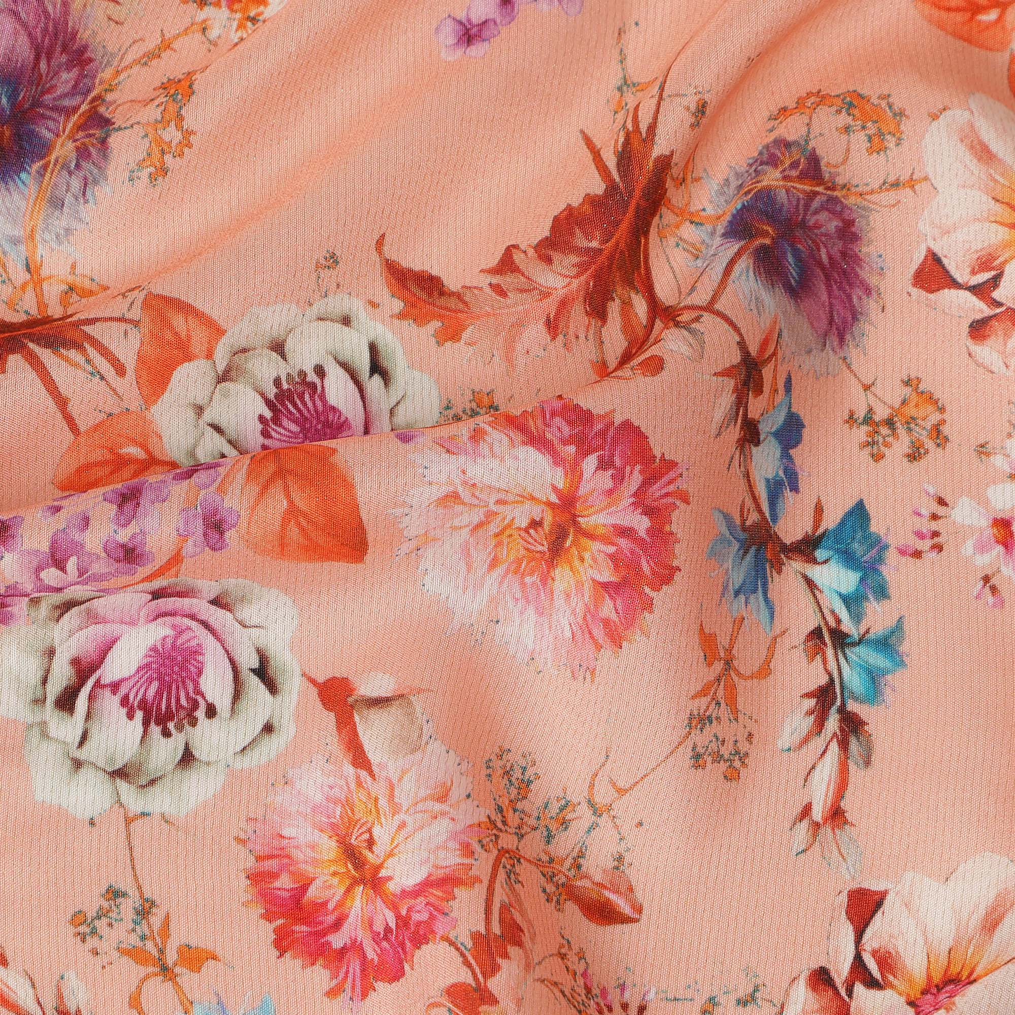 This peach floral printed viscose crepe fabric features a beautifully detailed multicolor botanical design blooming across a soft peach base,... Read more Read more