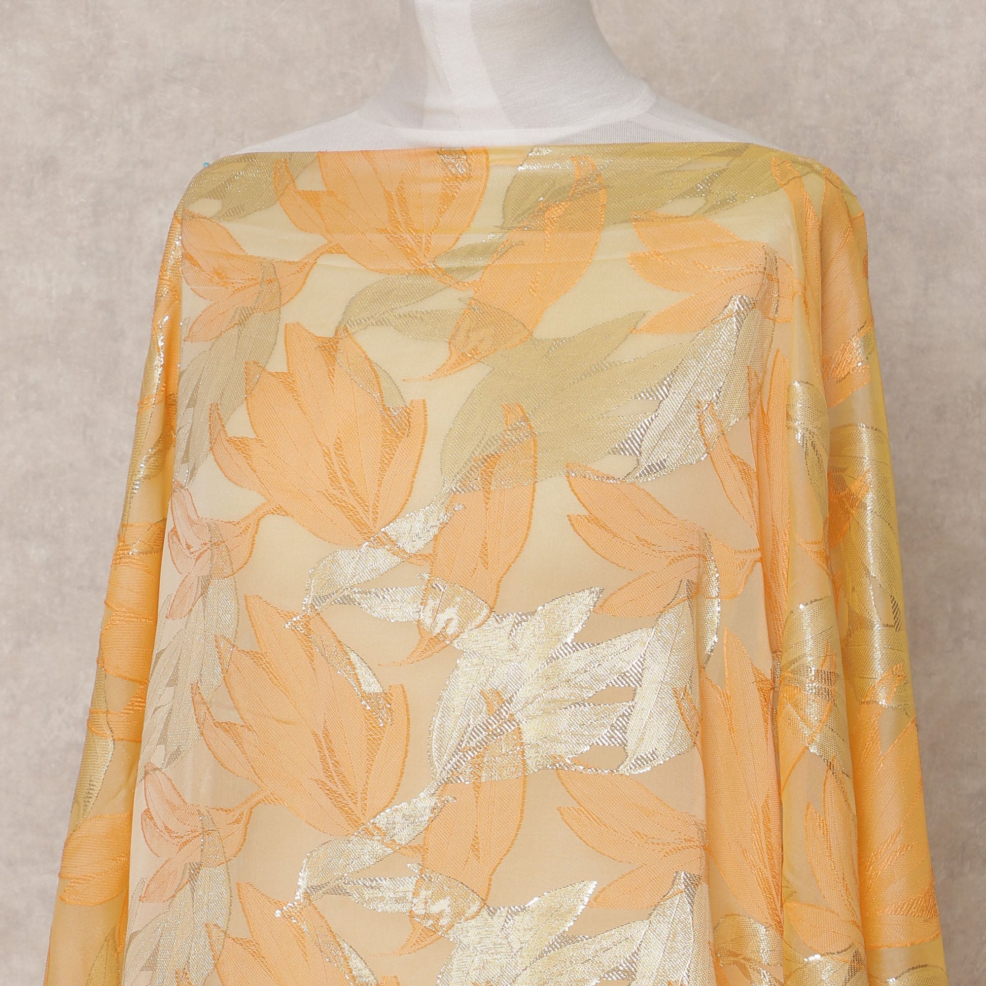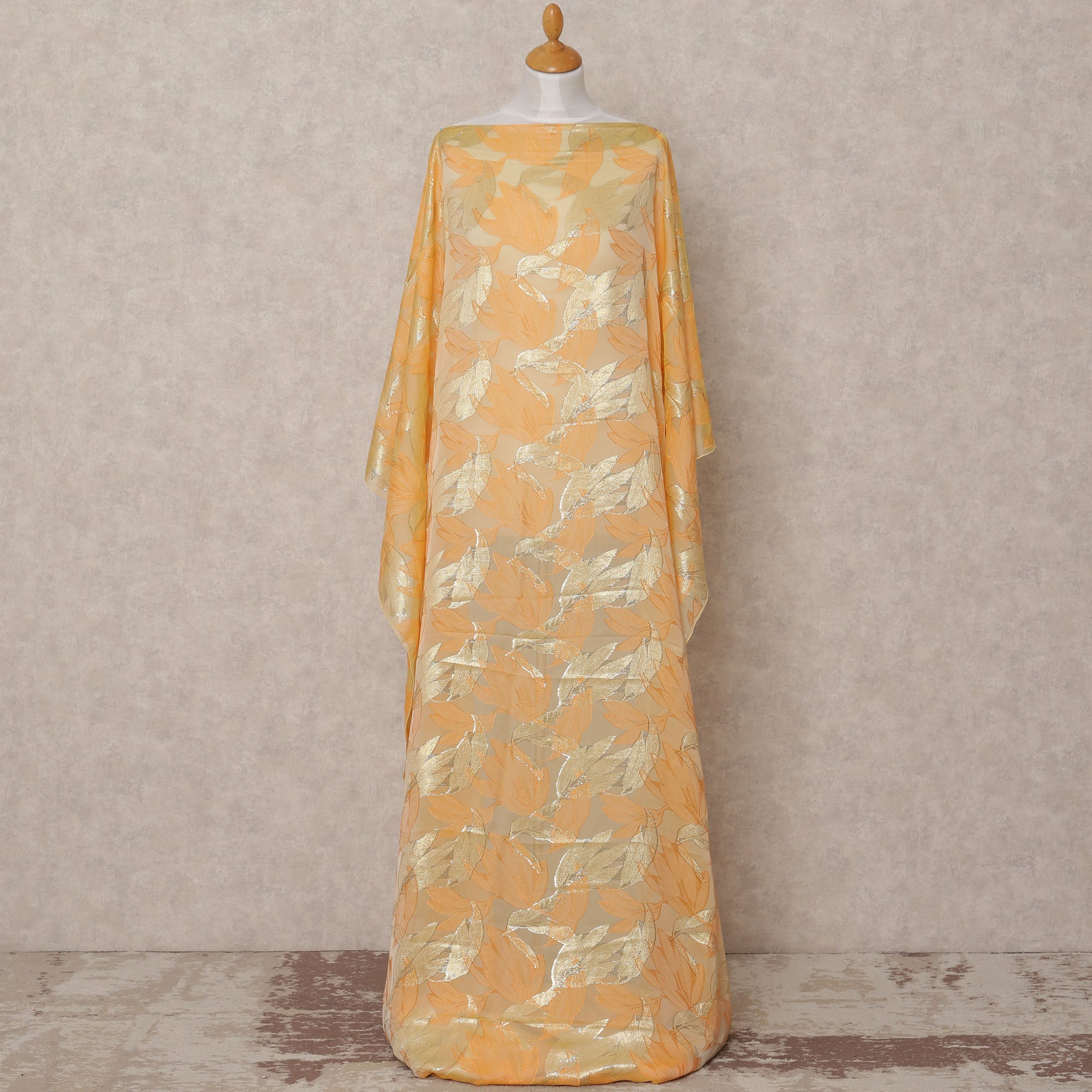 This peach Fransawi Somali silk chiffon dirac fabric, elegantly embellished with gold metallic lurex leaf motifs, is a perfect blend... Read more Read more