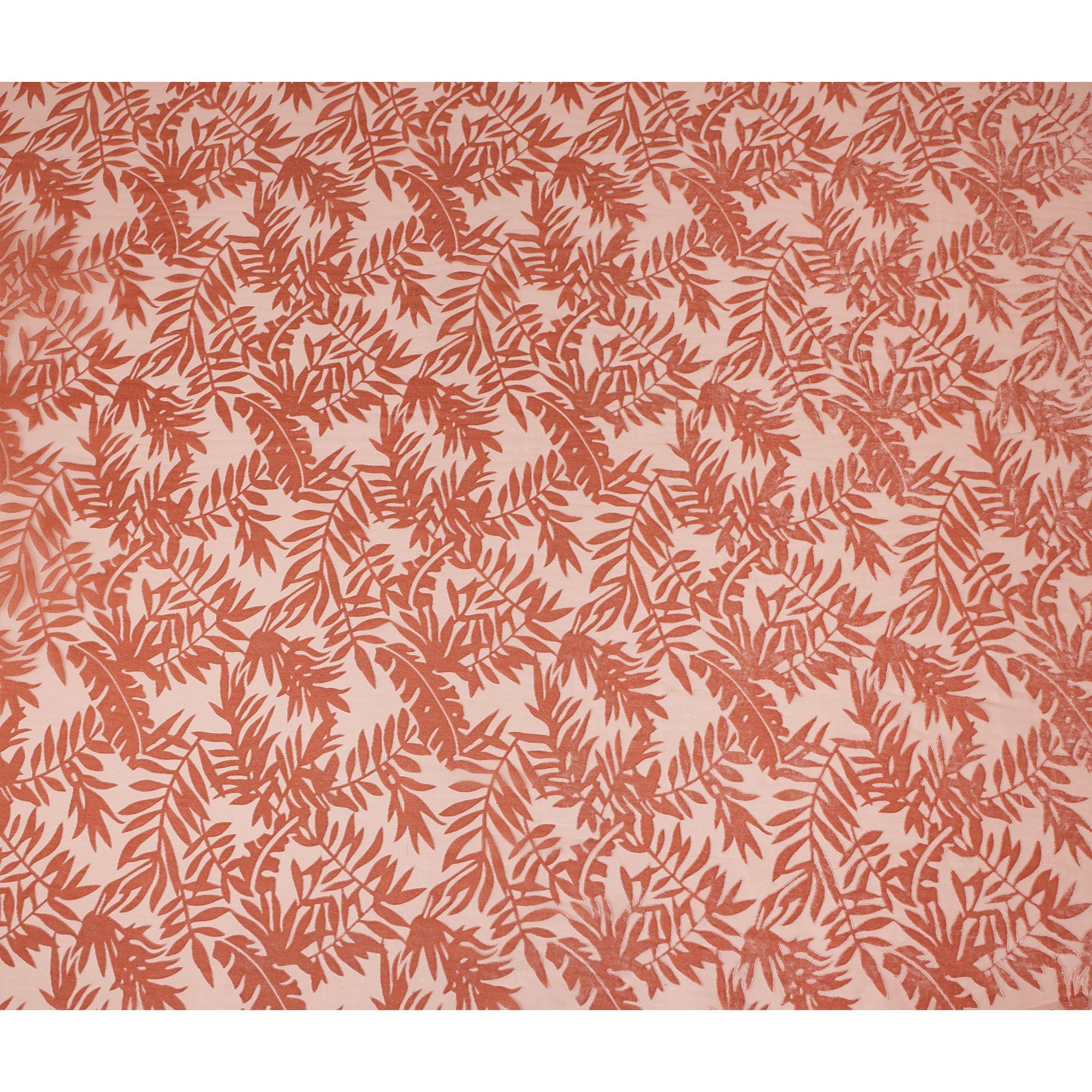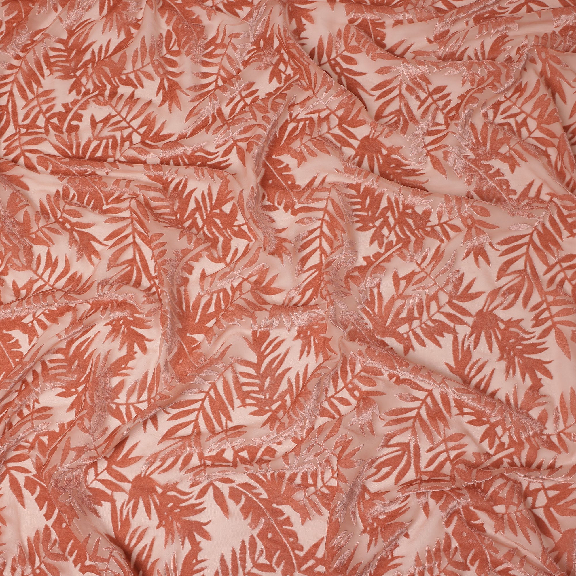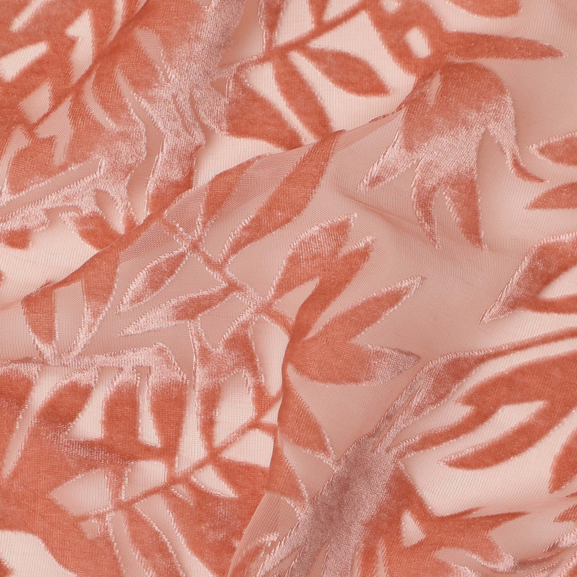 Soft peach base complemented by elegant leaf velvet burnout design.
