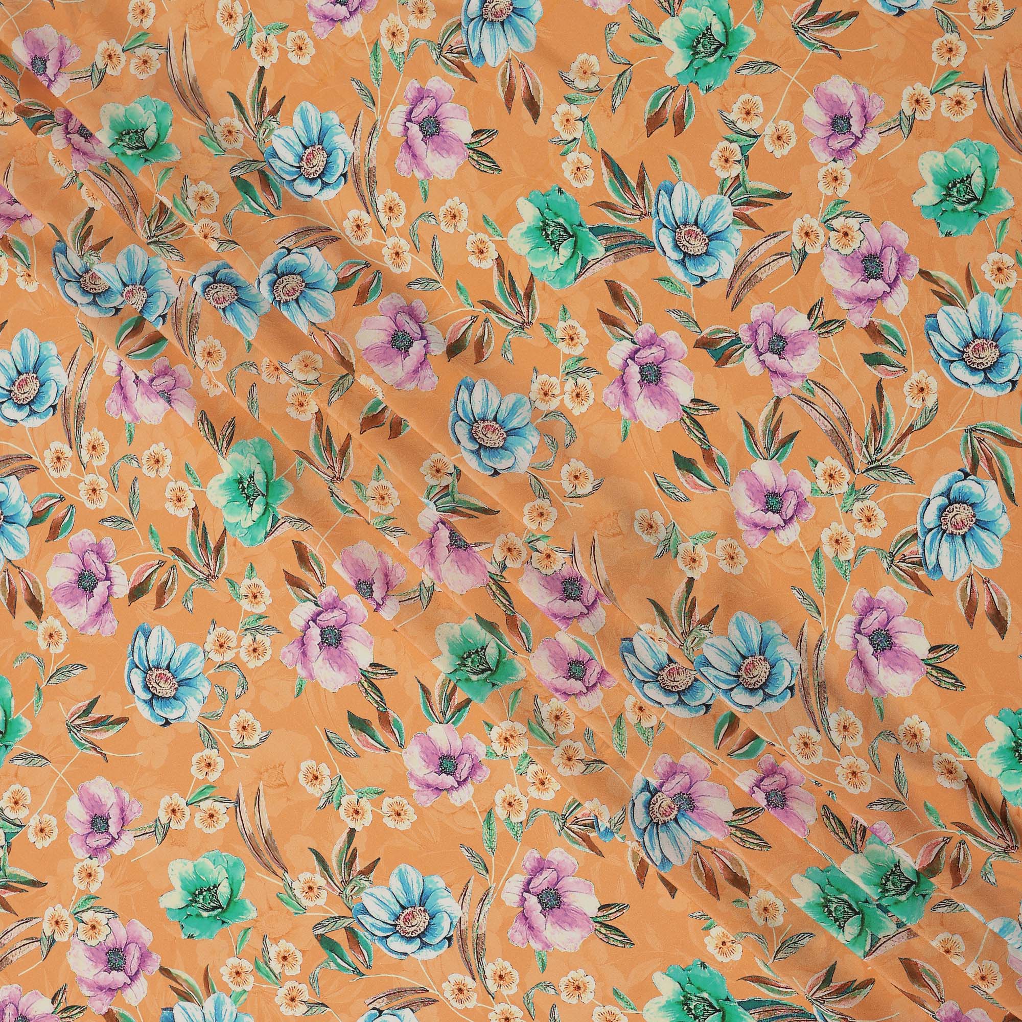 Premium peach pure silk crepe fabric with multicolor floral print.