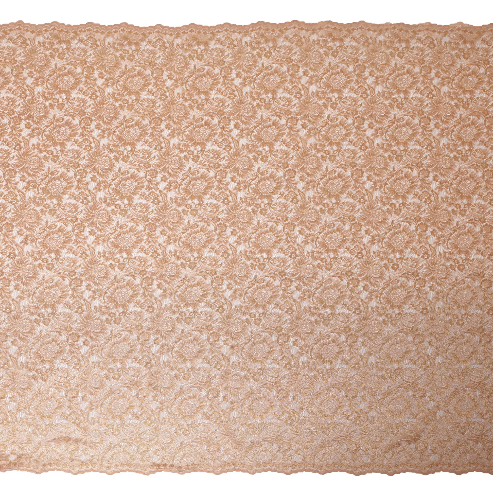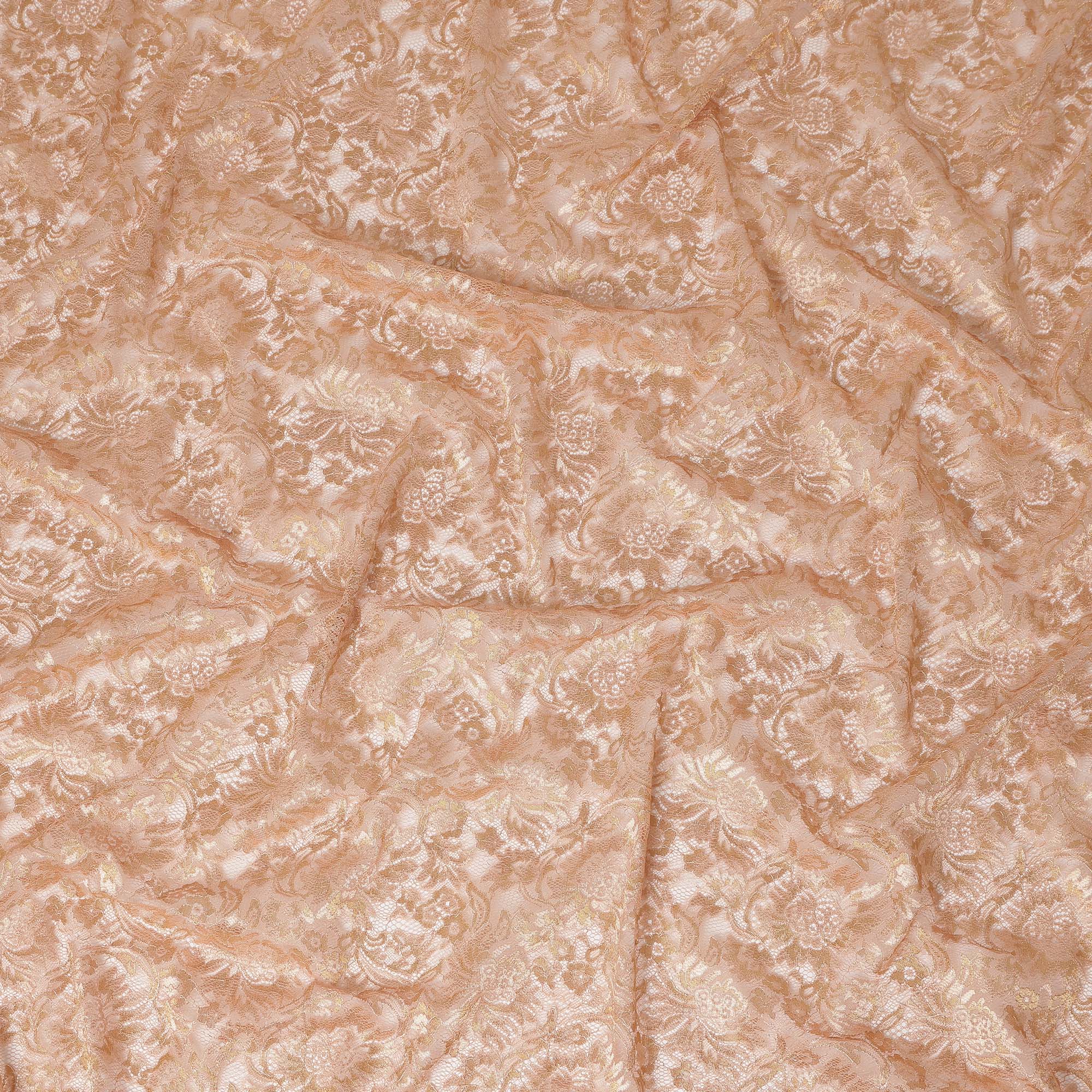 This peach nude synthetic metallic lace fabric features an exquisite floral embroidery enriched with soft metallic highlights that add warmth, depth, and refined elegance to the surface. Crafted on a delicate lace net base, the fabric offers a graceful balance of softness and durability, ensuring a beautiful drape with a luxurious finish. The subtle peach tone enhances the intricate floral motifs, making it ideal for sophisticated and timeless creations. Perfect for bridal wear, engagement outfits, festive ensembles, gowns, blouses, lehengas, dupattas, saree borders, and couture overlays, this fabric brings understated glamour to both ethnic and western designs. Its lightweight and breathable construction allows comfortable wear while maintaining a premium look suitable for high-end fashion applications.
