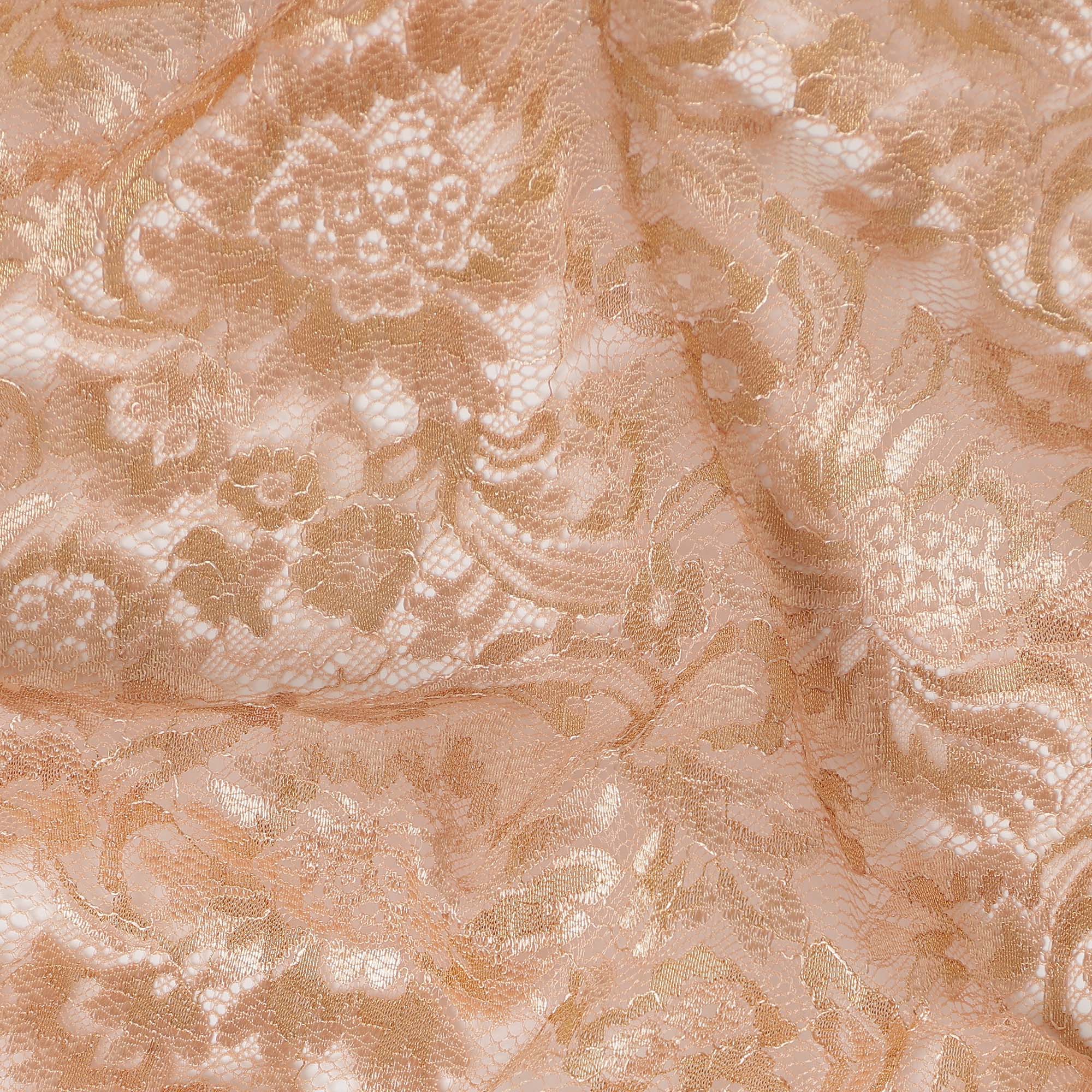 This peach nude synthetic metallic lace fabric features an exquisite floral embroidery enriched with soft metallic highlights that add warmth,... Read more Read more
