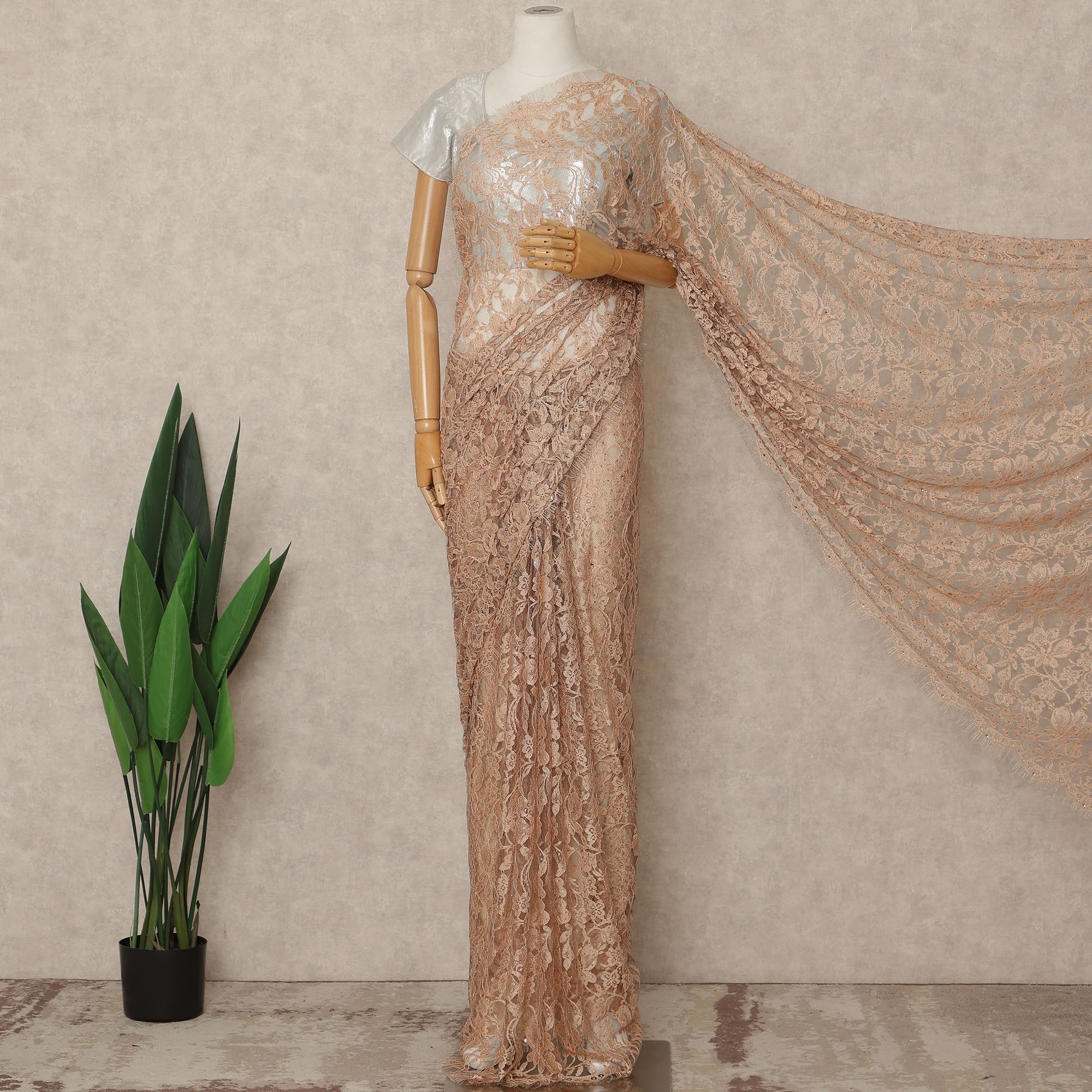 This Peach Nude Premium French 2 Tone Chantilly saree lace with stone work is a refined and elegant imported fabric from France, created for women who love soft tones blended with luxurious detailing. Designed with intricate two tone Chantilly lace patterns and delicately embellished with stone work, this 5.5 meter piece with a generous 110 cm width drapes effortlessly to form a graceful and feminine saree silhouette. The peach nude hue offers a warm, sophisticated appeal with subtle shimmer, making it perfect for weddings, receptions, engagement ceremonies, and elegant festive occasions. Lightweight yet richly textured, this premium lace ensures comfort, durability, and couture-level finish, making it ideal for designers, boutiques, and bespoke saree creations. Blouse fabric is not included, allowing complete freedom for personalized styling.