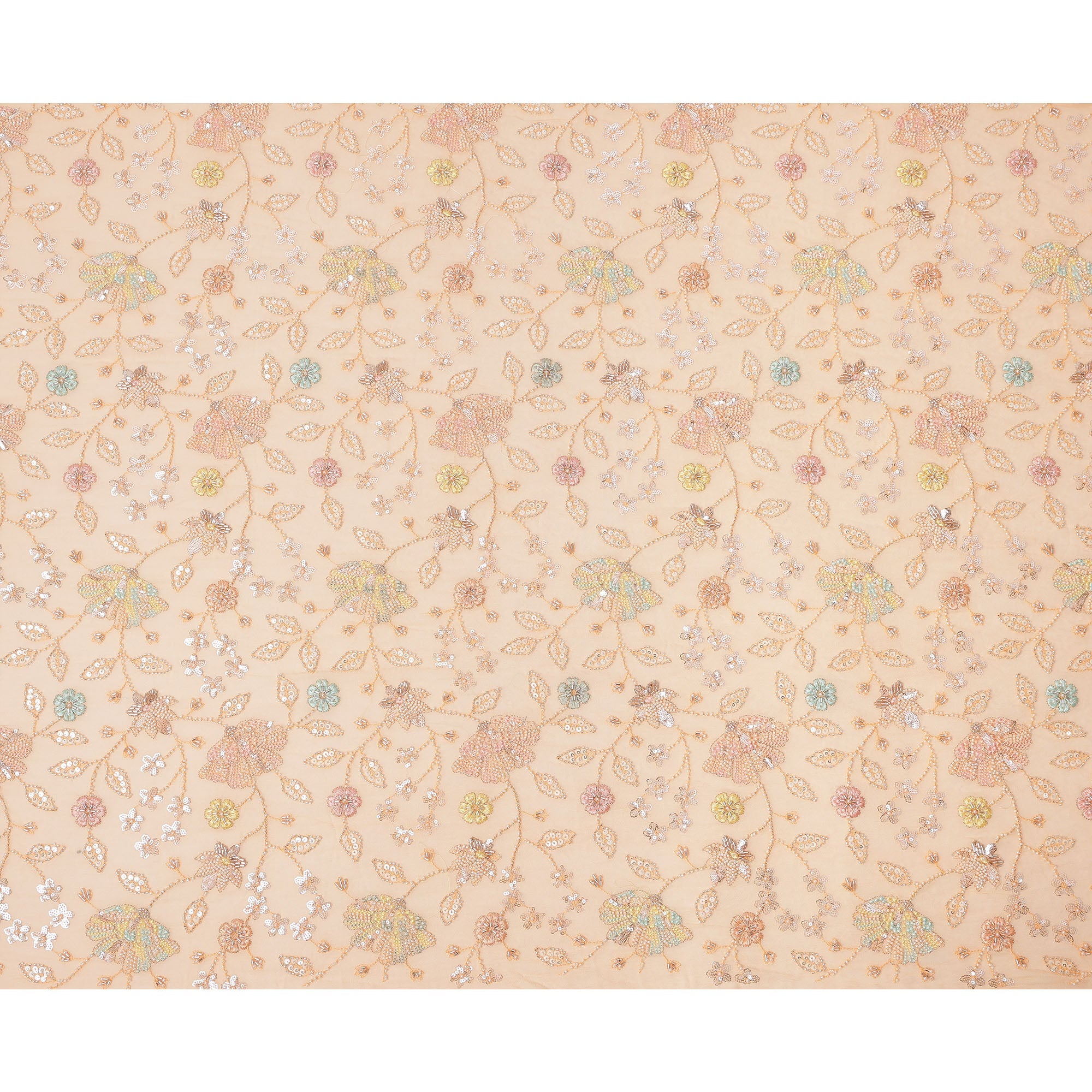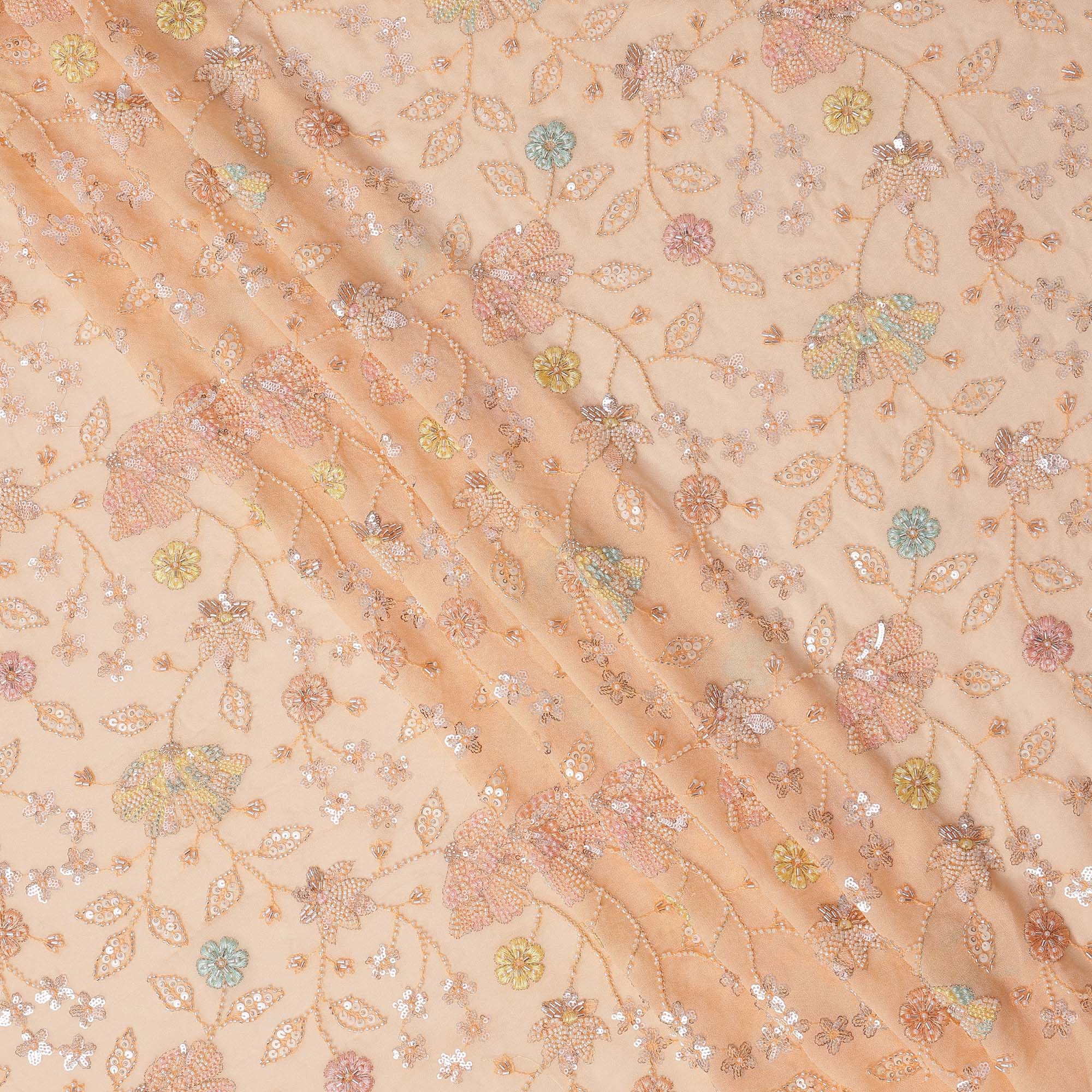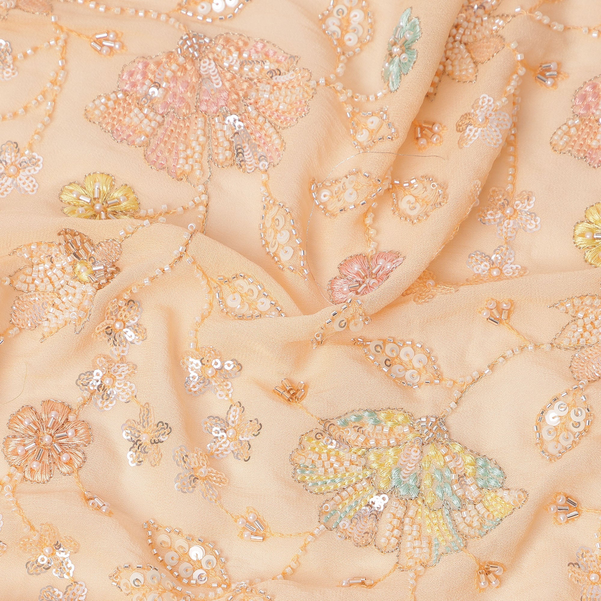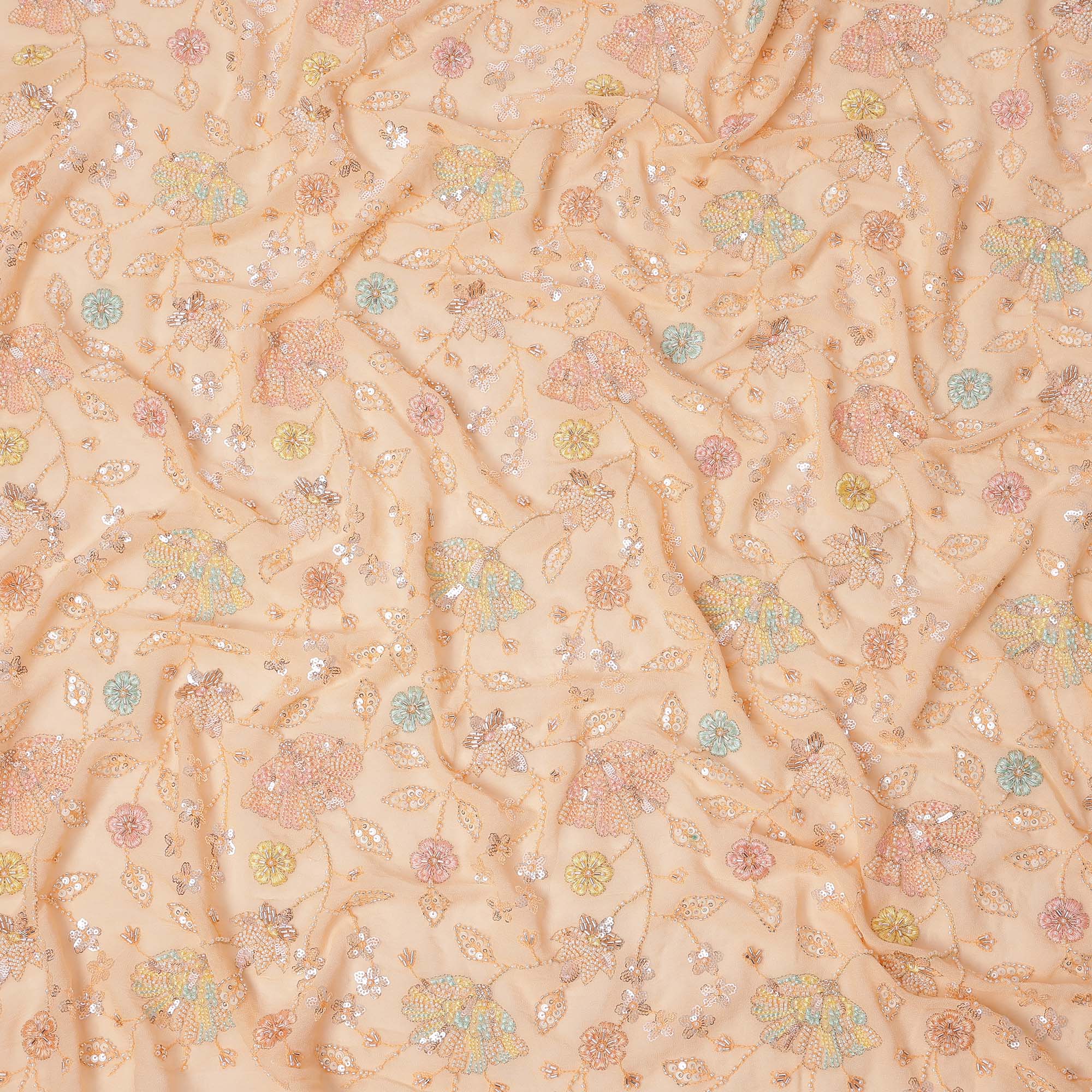 Peach Pastel Floral Sequin & Bead Embroidered Silk Chiffon Fabric, 110 Cms Width, India-D25268