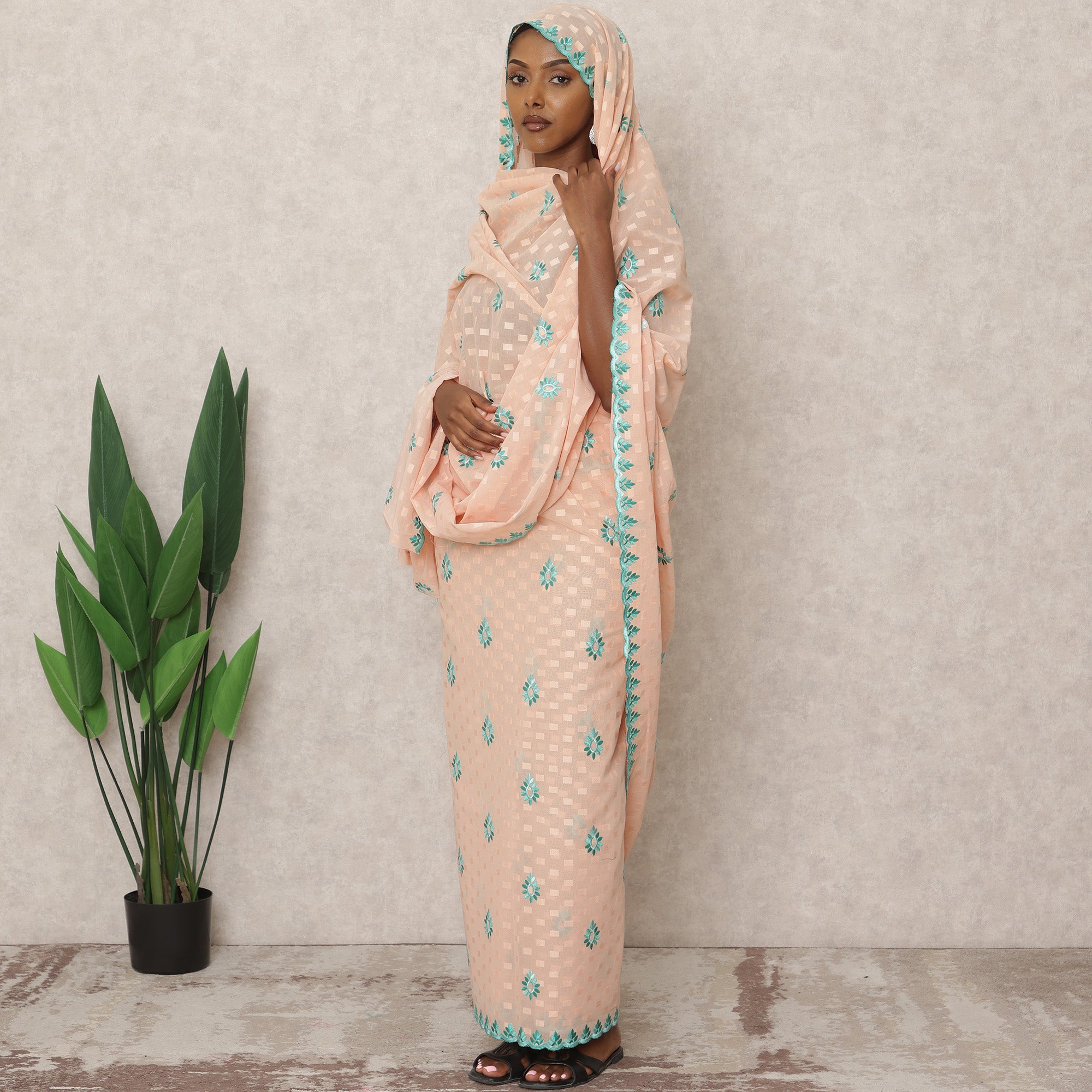 Radiate soft sophistication in this Peach Traditional Sudanese Thobe, beautifully crafted from breathable pure cotton voile and adorned with vibrant aqua blue embroidery in elegant floral motifs and scalloped edges for a graceful traditional touch. This 4.5-meter long and 140 cm wide piece ensures full and flattering Sudanese-style draping while offering featherlight comfort and ease of movement for daily wear, prayers, or festive occasions. The delicate peach backdrop adds a gentle warmth to the overall look, while the aqua blue embroidery provides a fresh contrast that enhances the garment’s visual richness. Made in India by skilled artisans, this thobe combines traditional cultural elegance with expert textile craftsmanship, and its voile fabric remains cool and soft even during extended wear. Finished with embroidered borders and symmetrical floral placement, it offers timeless beauty in a modern, wearable form. Buy online now to bring home a thobe that’s elegant, breathable, and beautifully modest—shop online and celebrate heritage with everyday luxury.