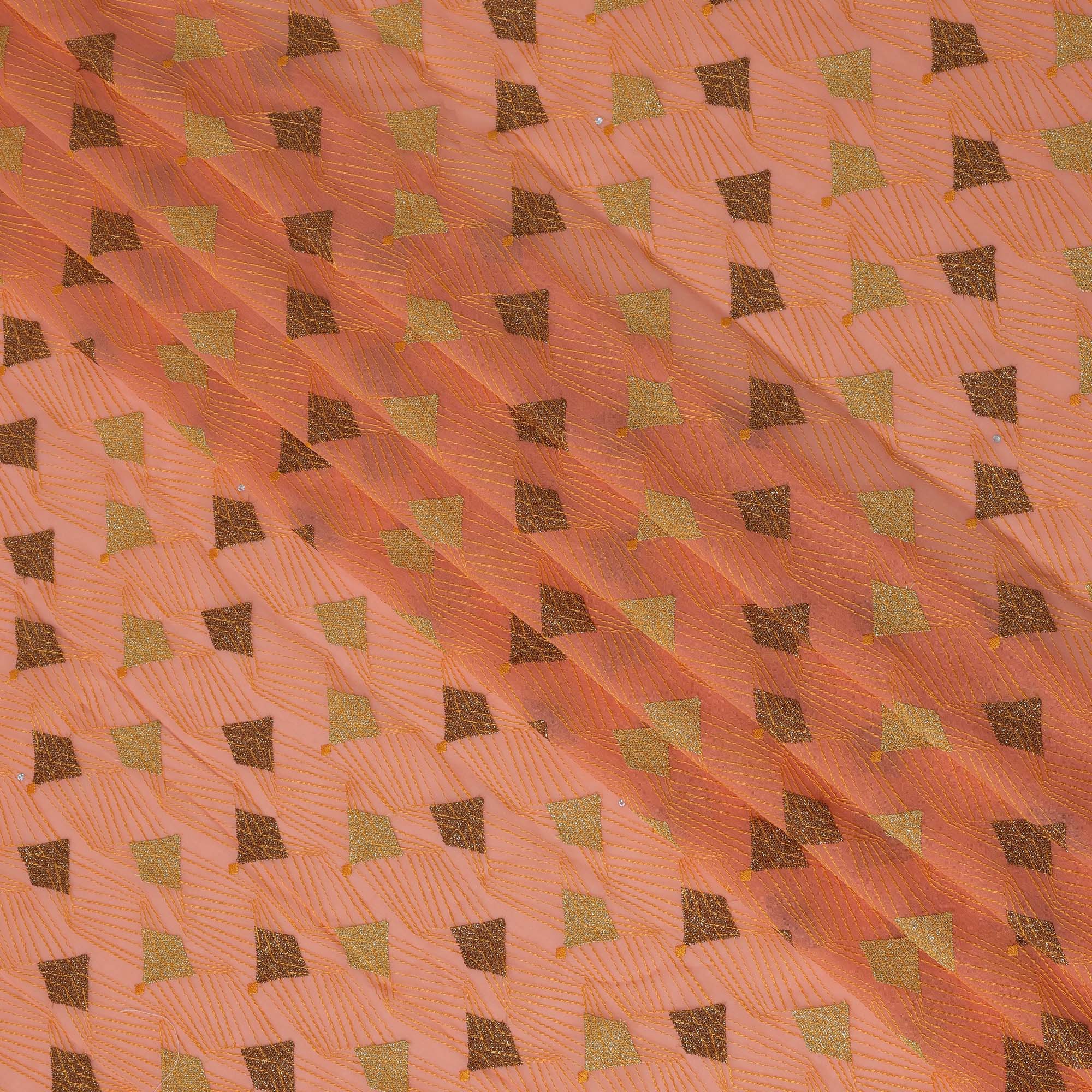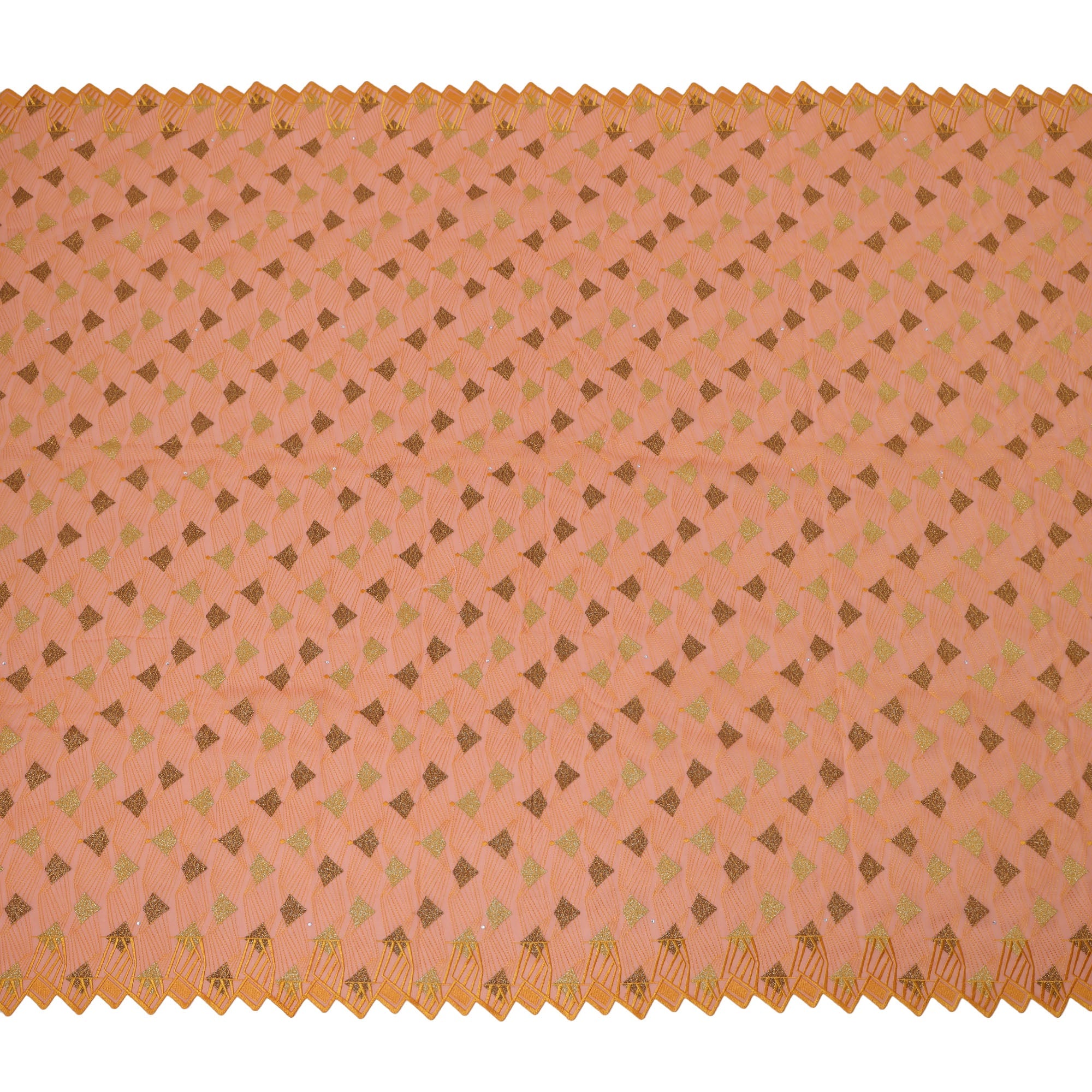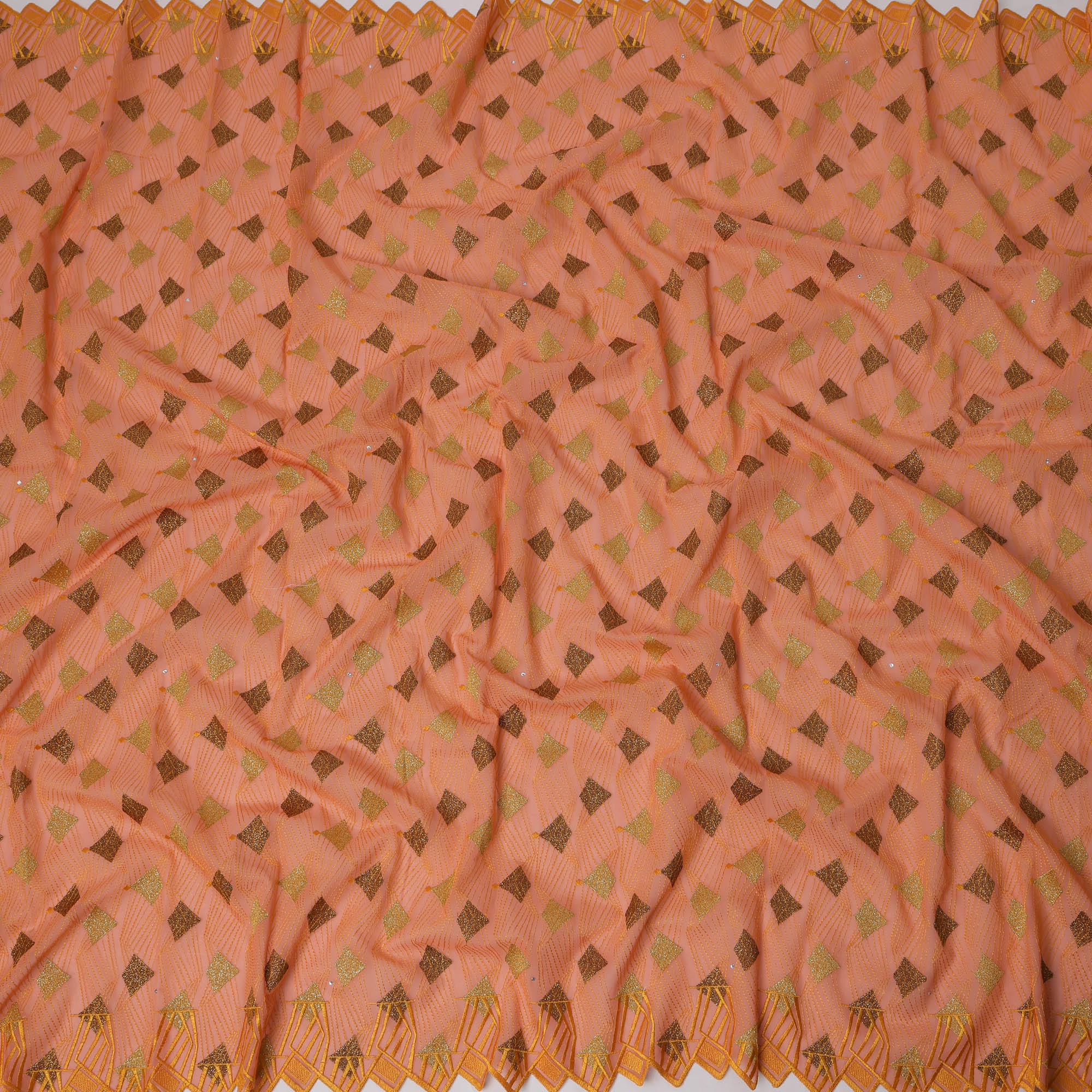 Peachy Pink cotton voile fabric with golden and bronze diamond embroidery.