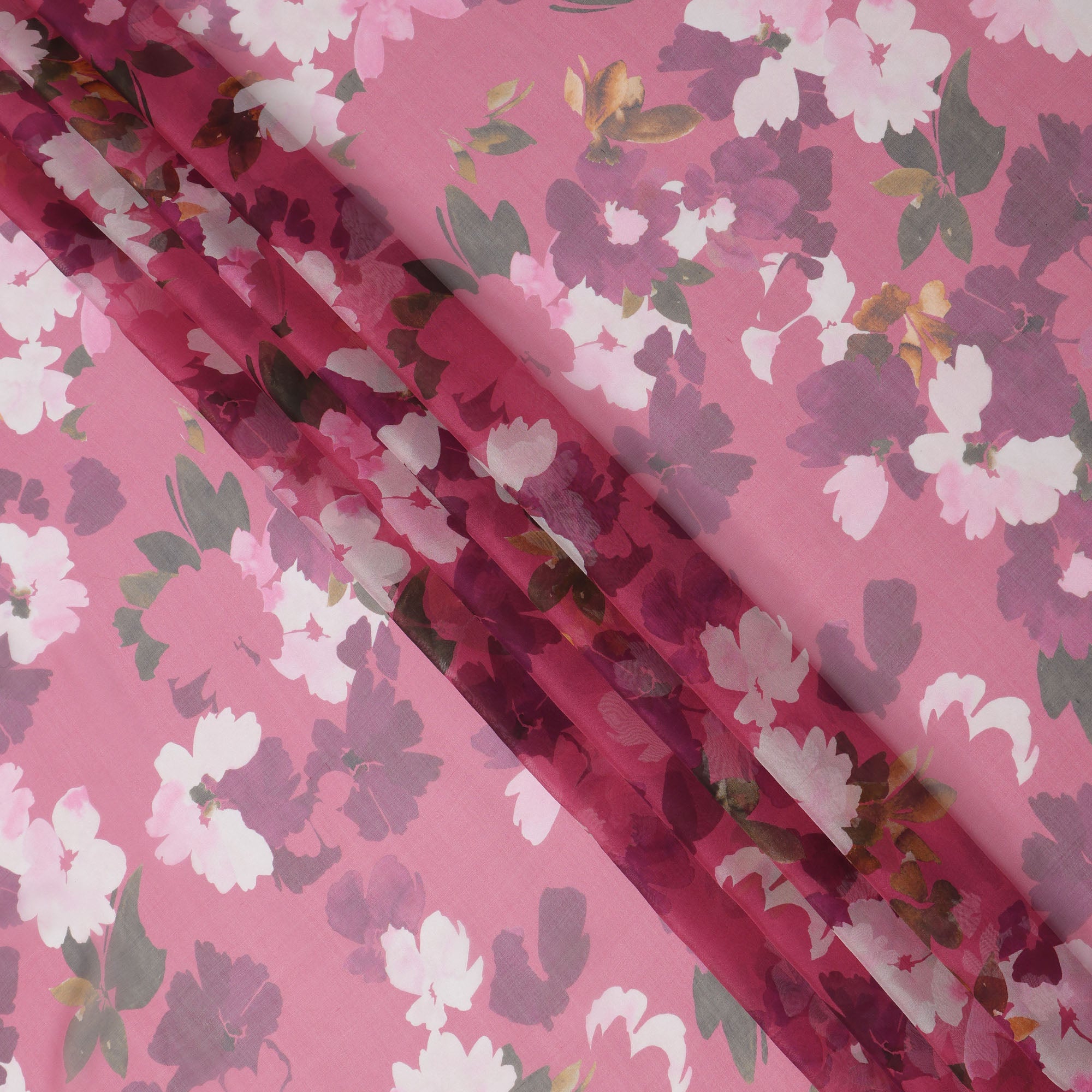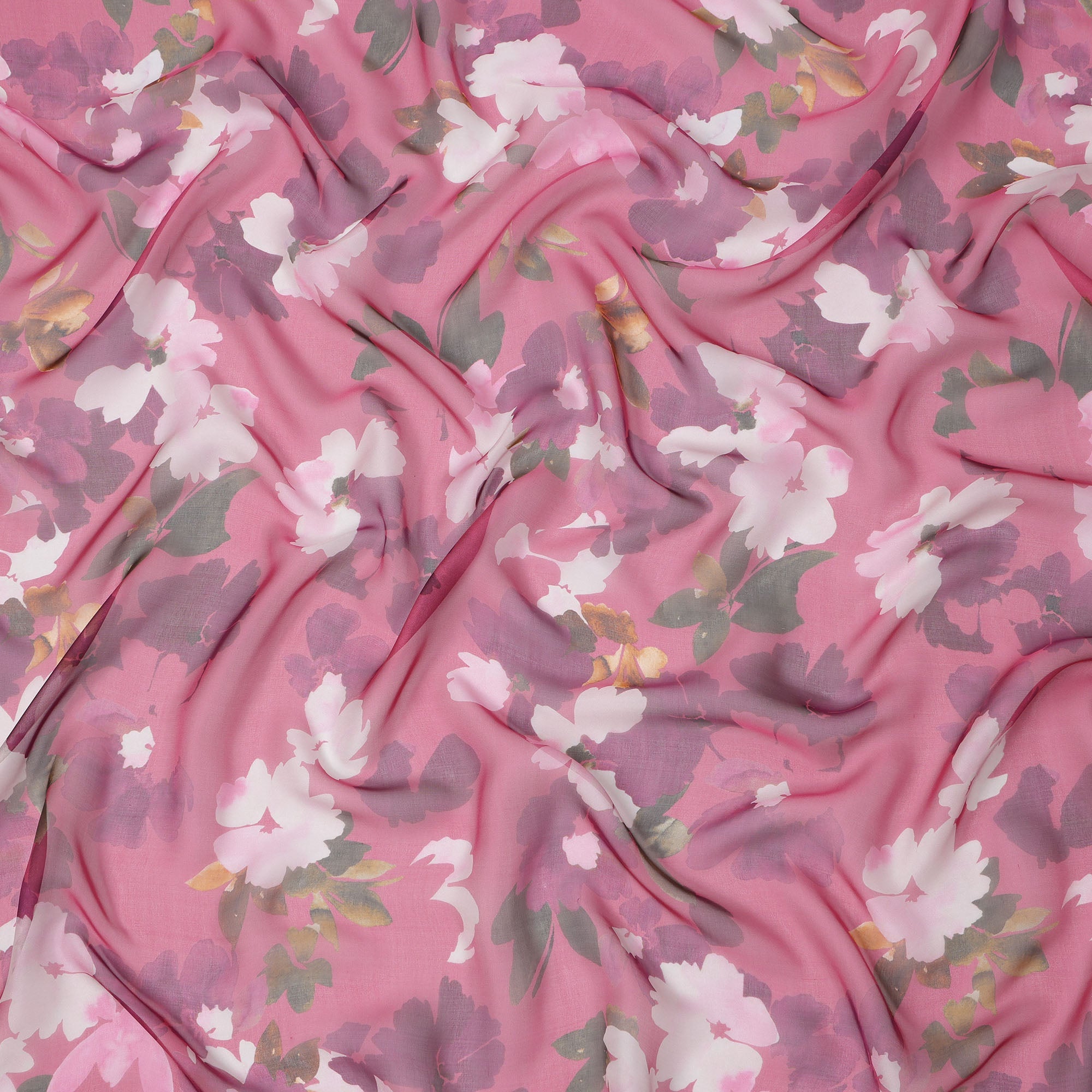 Pink Base Mauve and White Watercolor Floral Printed Pure Silk Chiffon Fabric, 110 Cms Width, Made in South Korea-D23998