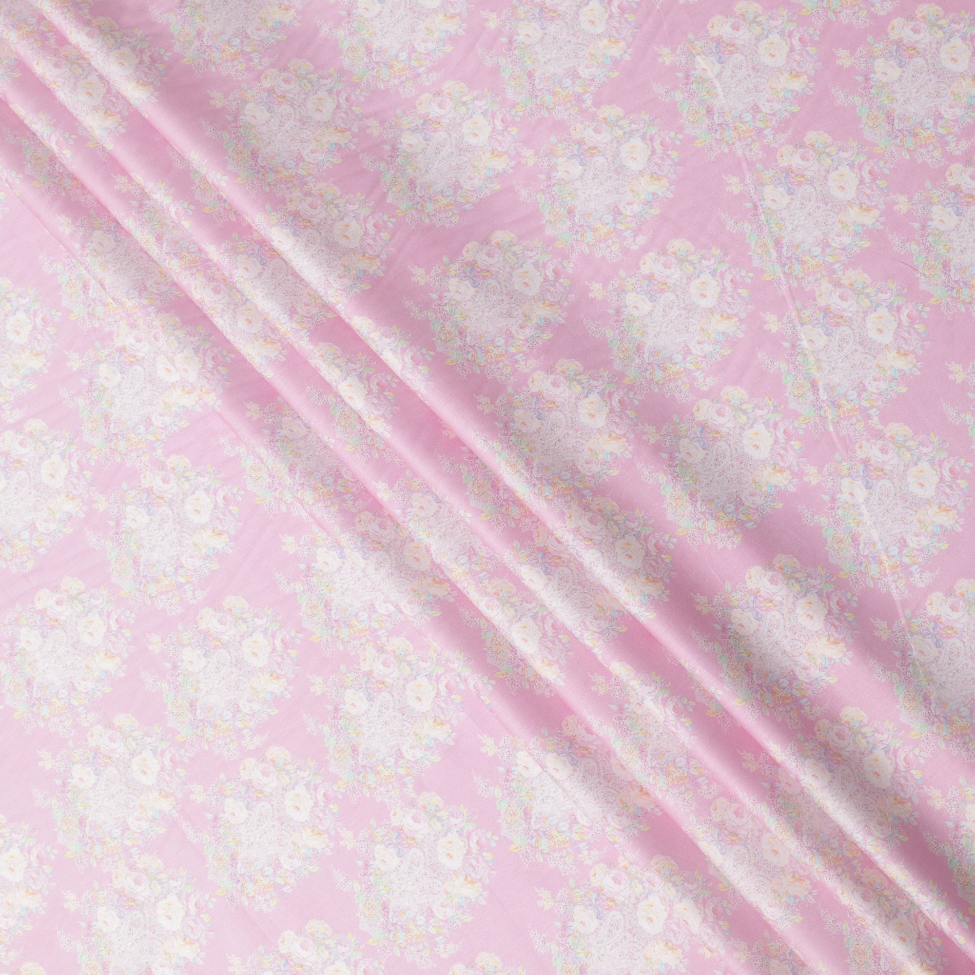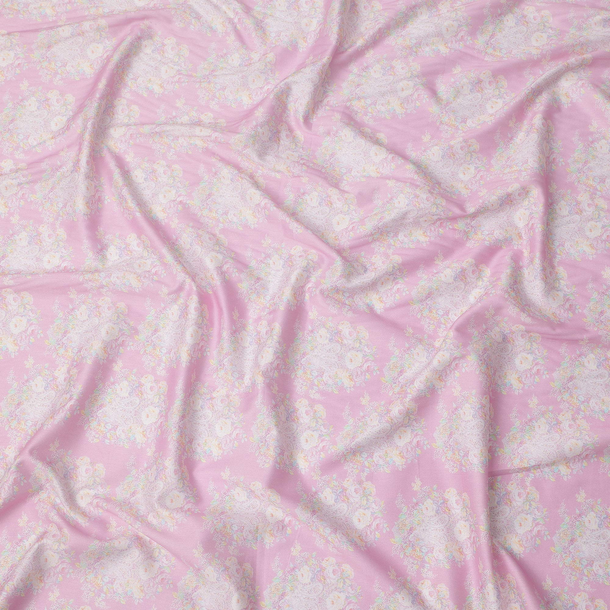 Premium Pink Base with Pastel Floral Print Pure Cotton Satin Fabric with elegant sheen