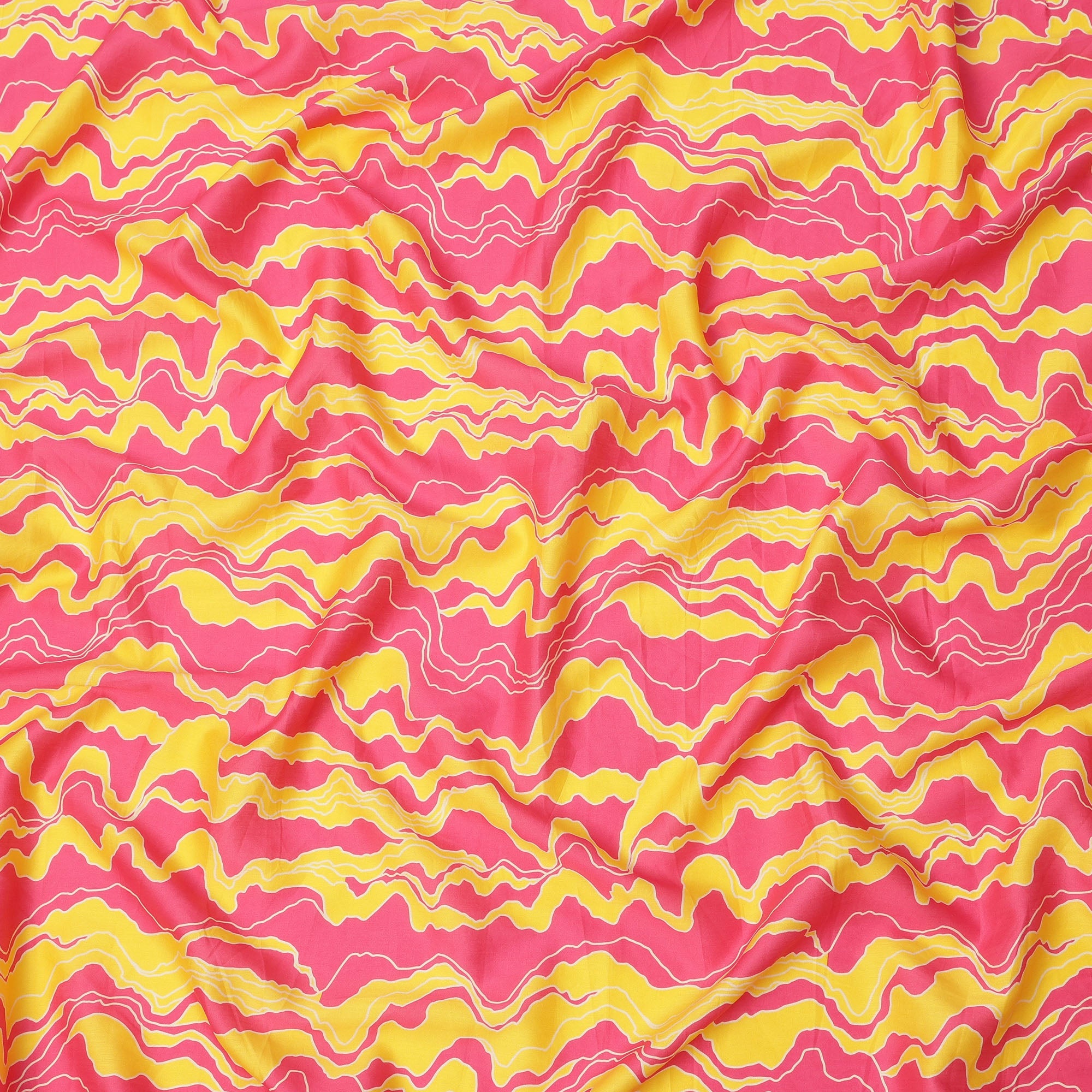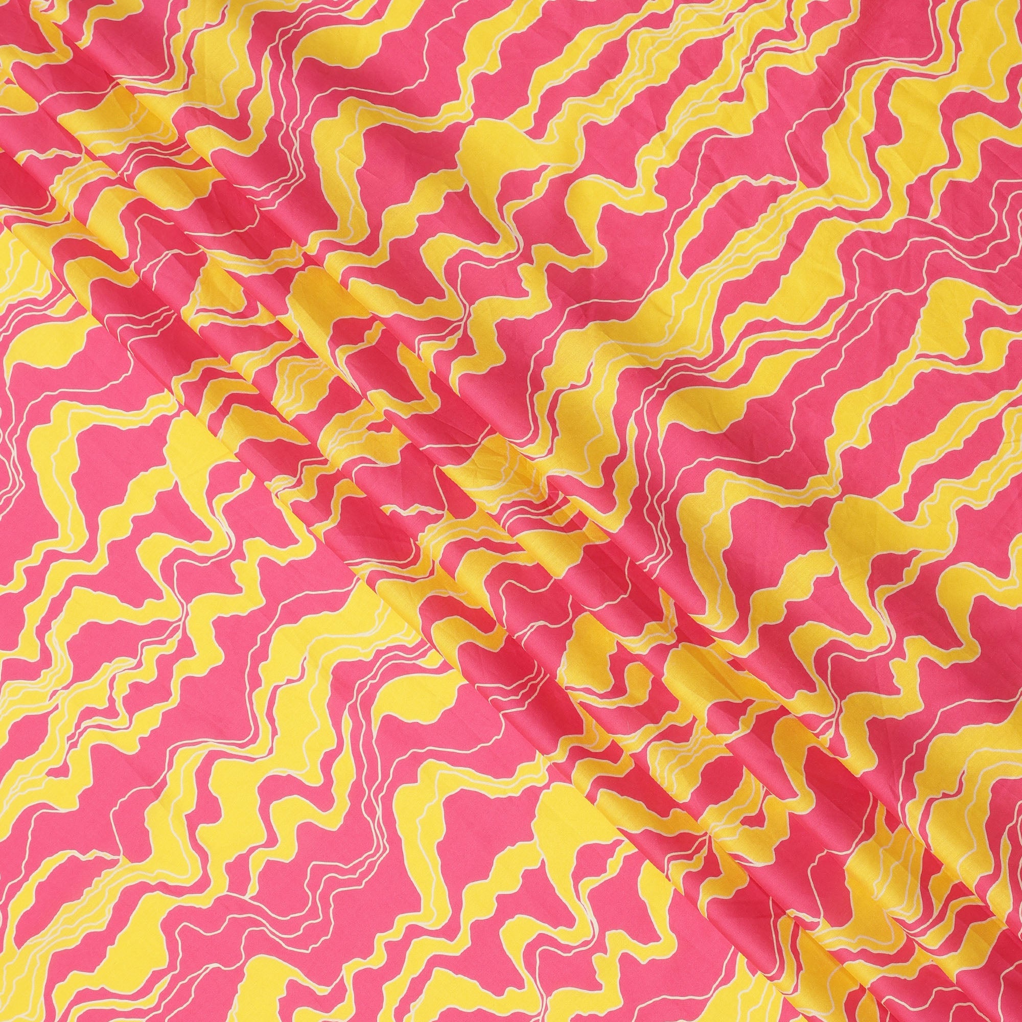 Pink Cotton Lawn Fabric with Wavy Yellow and White Abstract Line Print, Width 110 Cms, Made in India-D23939