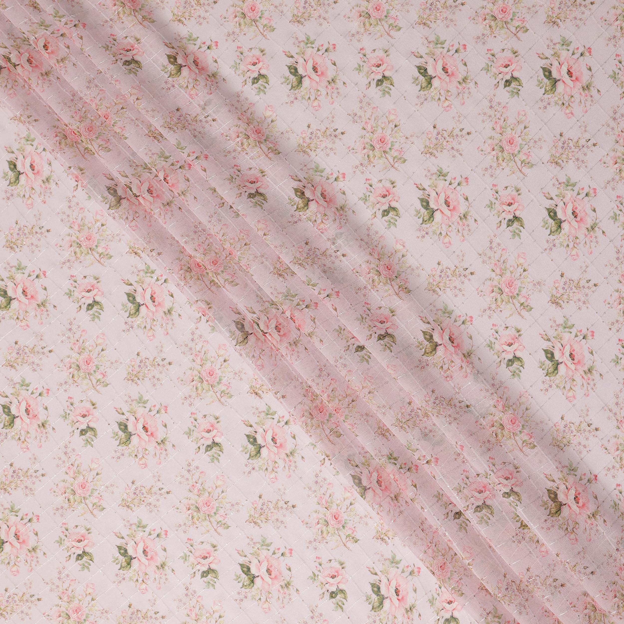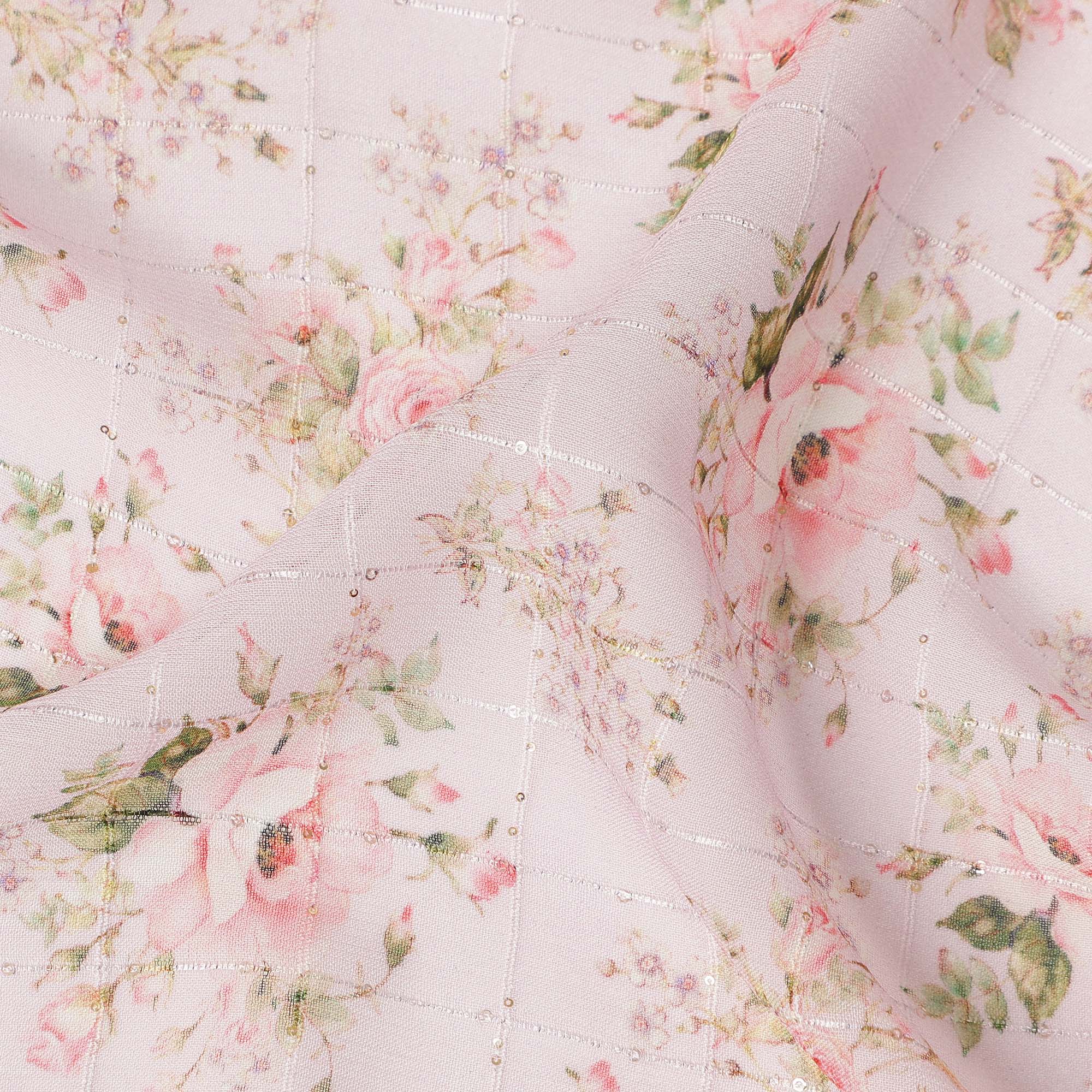 This pink floral bouquet print viscose georgette fabric is a lightweight, breathable, and beautifully flowing material designed for elegant garments and creative sewing projects. The soft texture and delicate drape make it an excellent choice for dresses, blouses, scarves, skirts, and stylish overlays that require graceful movement. Featuring a charming floral bouquet pattern on a soft pink base, this fabric adds a romantic and feminine touch to any design. With a width of 110 cms, it offers versatility for both fashion and craft applications while remaining comfortable to wear throughout the day. The viscose georgette construction provides a smooth feel with subtle texture, allowing designers, tailors, and DIY enthusiasts to create refined outfits that combine comfort, beauty, and timeless floral style.