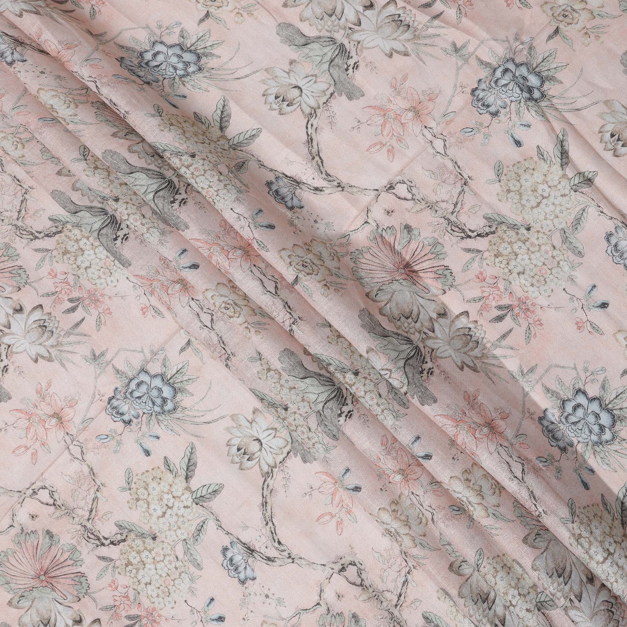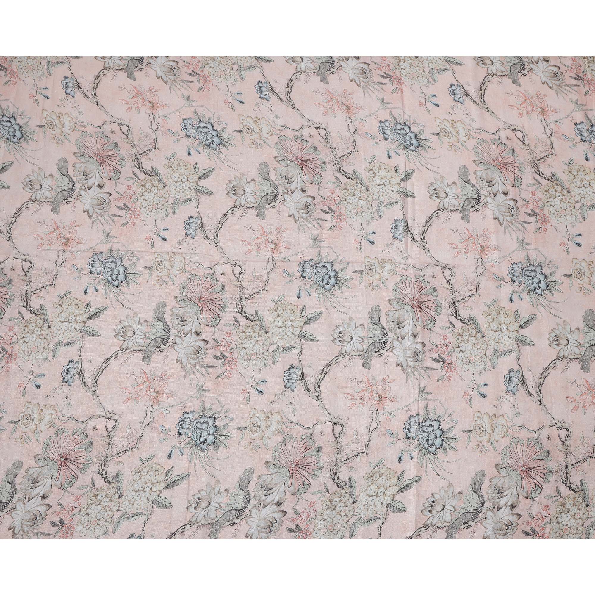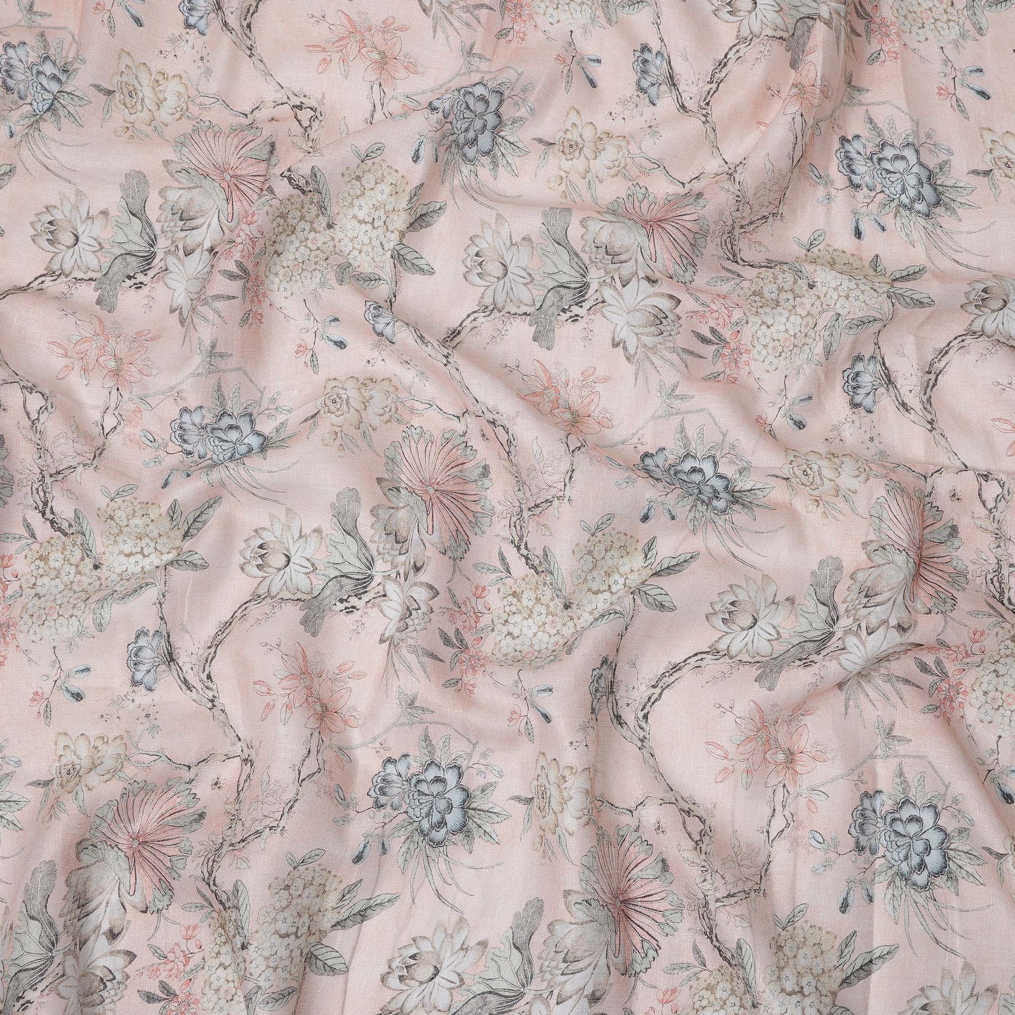This Pink Floral Printed Blended Cotton Linen Fabric is a perfect blend of elegance and comfort, designed to bring a refreshing charm to your wardrobe or home décor creations. Featuring a soft pastel pink base adorned with intricate floral motifs in subtle tones of grey, ivory, and muted rose, the fabric exudes sophistication while staying versatile for both ethnic and modern styling. The Blended Cotton linen blend offers a breathable, lightweight, and durable texture, ensuring comfort along with long-lasting quality. Its smooth finish and natural sheen make it an ideal choice for tailoring stylish kurtas, sarees, dresses, or chic tops, while also lending itself beautifully to upholstery, curtains, and craft projects. Measuring 110 cms in width, this fabric provides ample space for creative experimentation, ensuring perfect drape and structure in every design. Crafted in India, known worldwide for its textile heritage, this fabric showcases premium craftsmanship and timeless appeal. Easy to care for with gentle hand wash or dry cleaning, it is a reliable choice for everyday wear and special occasions alike, seamlessly blending tradition with modern fashion needs.
