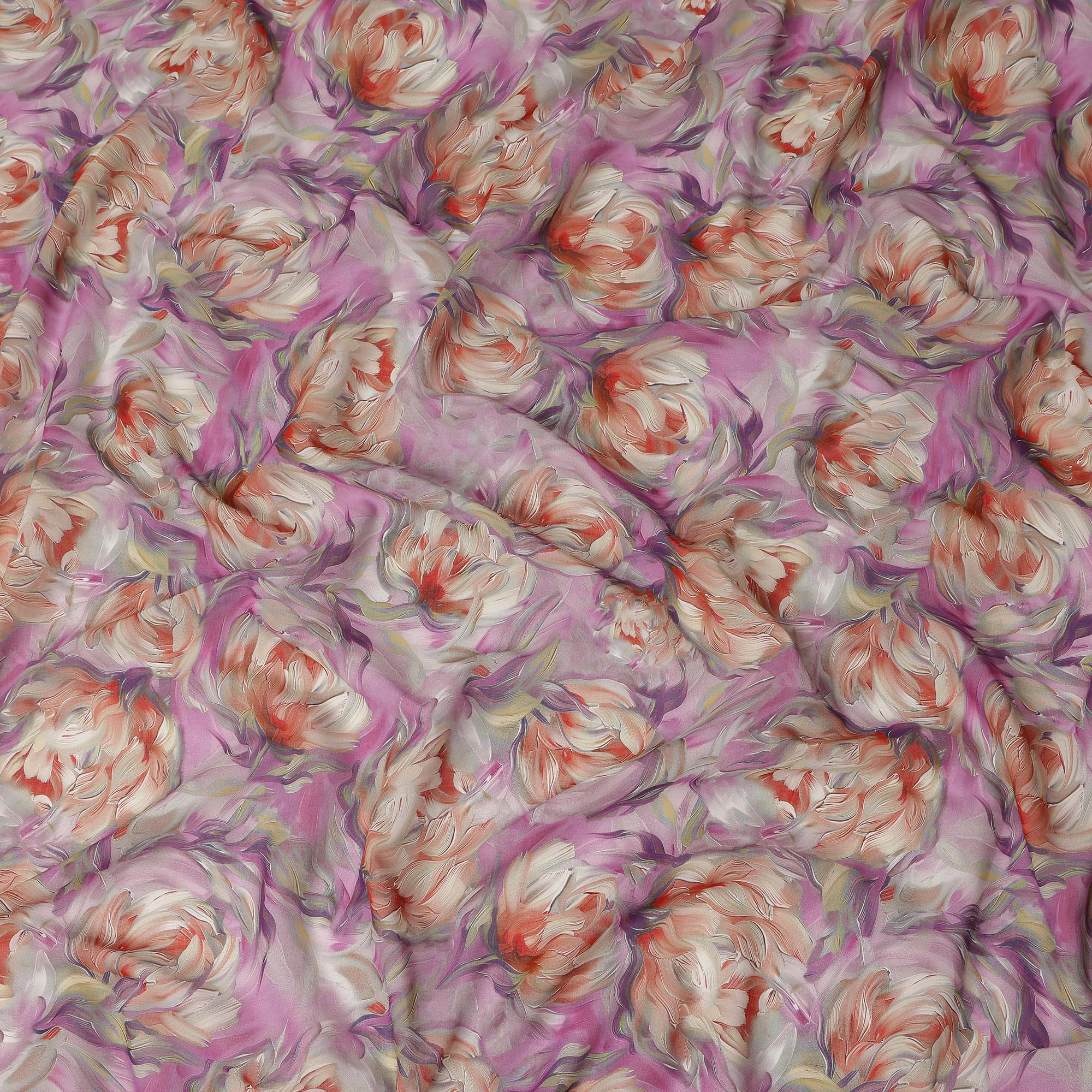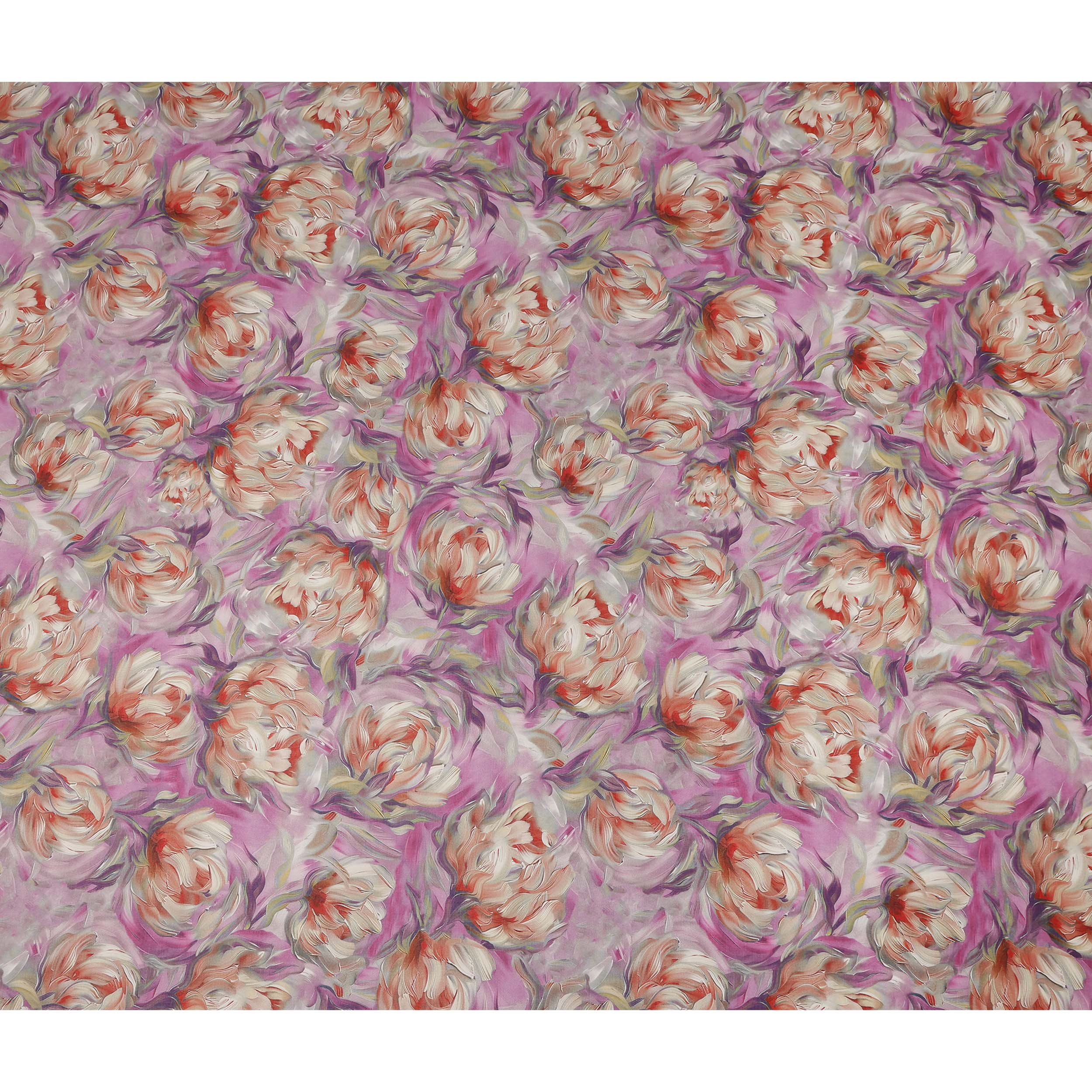 This pink floral printed cotton voile fabric showcases large artistic blossoms in soft shades of coral, cream, and lavender set against a vibrant pink base. Crafted in 150 cms width, the lightweight voile weave offers a soft, airy feel with a graceful drape, making it perfect for flowy dresses, summer kurtis, tops, scarves, and layered fashion pieces. The breathable cotton construction ensures exceptional comfort in warm weather while maintaining durability for regular use. Ideal for designers, boutiques, and sewing enthusiasts, this fabric combines bold floral elegance with everyday practicality for creating stylish and comfortable garments effortlessly.