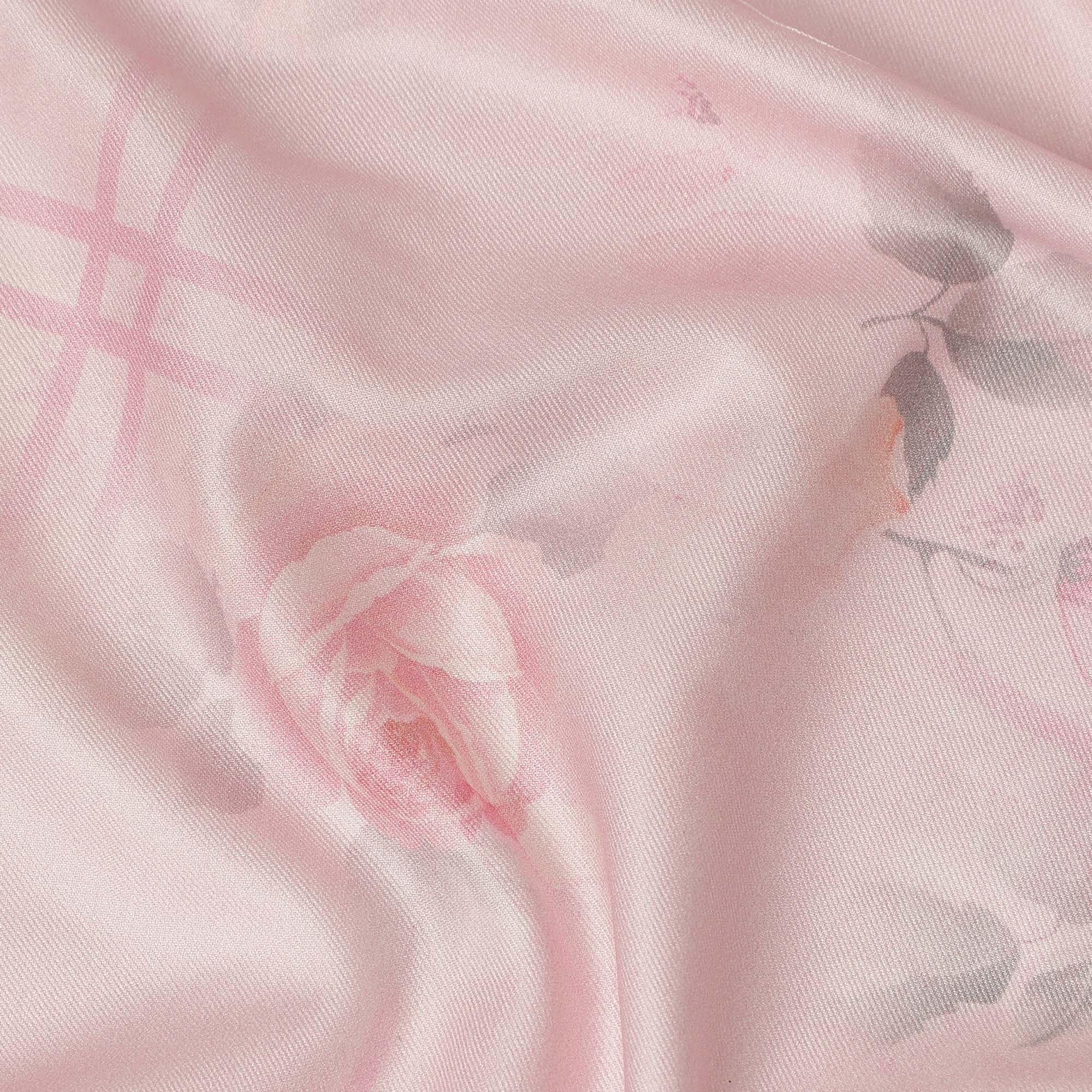 Elegant pink base with delicate rose floral and subtle grid print creates a graceful and feminine appearance for fashion garments.