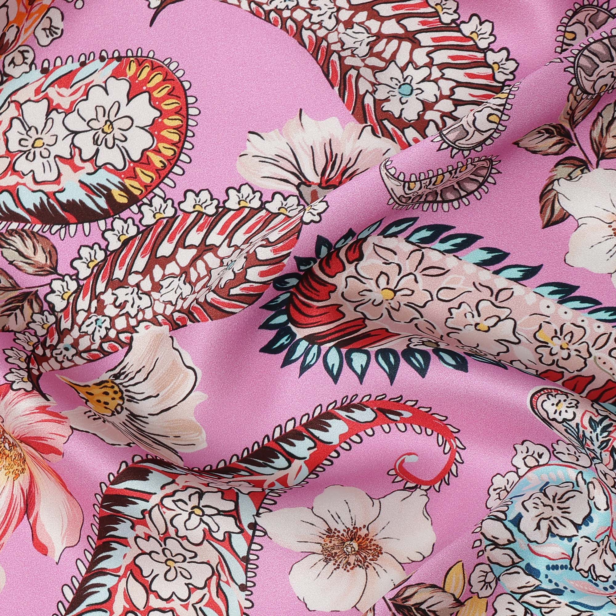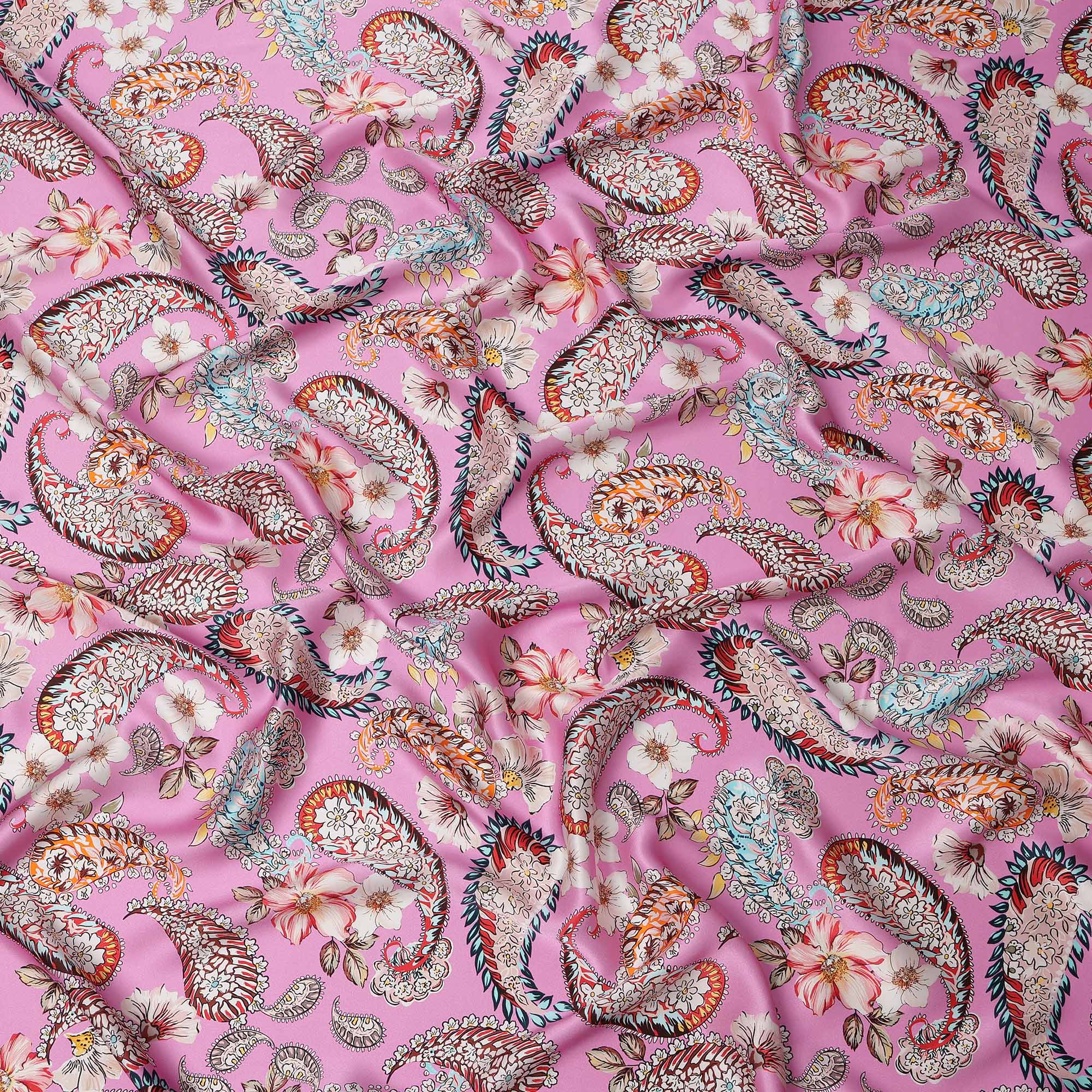Premium pink pure silk satin fabric with paisley and floral print.