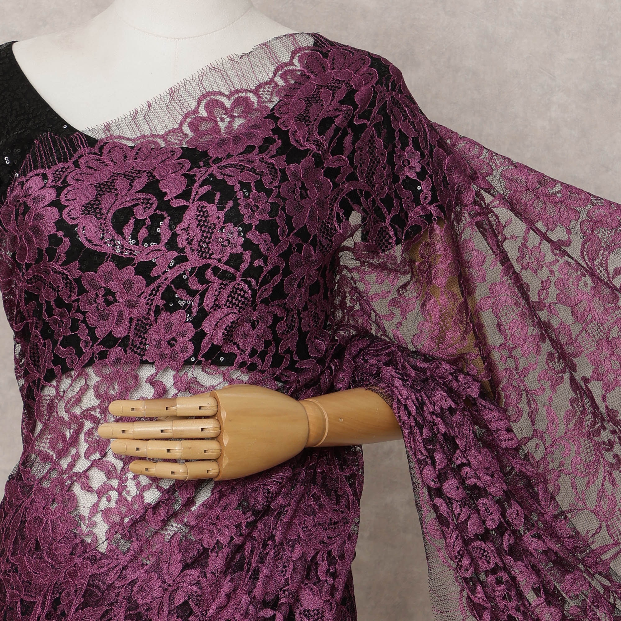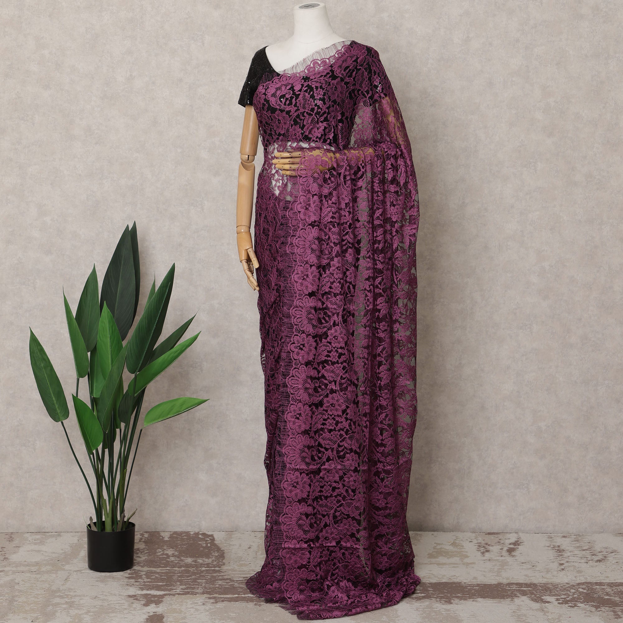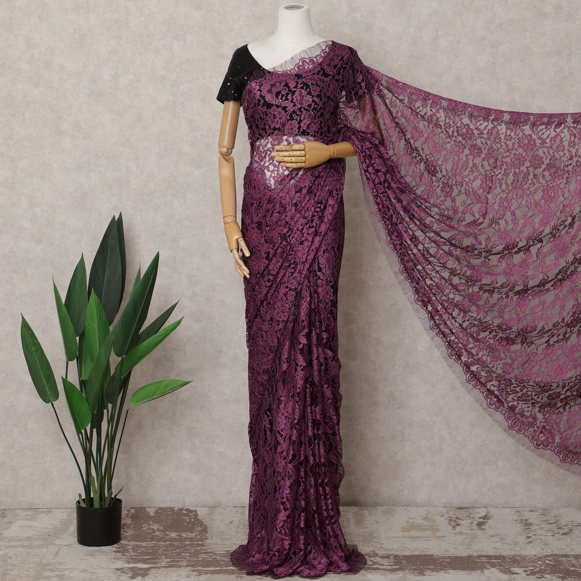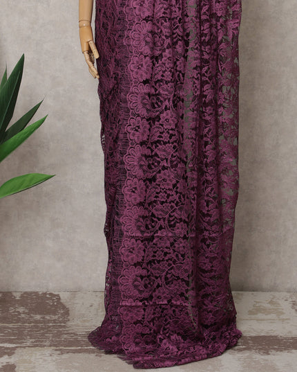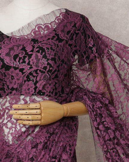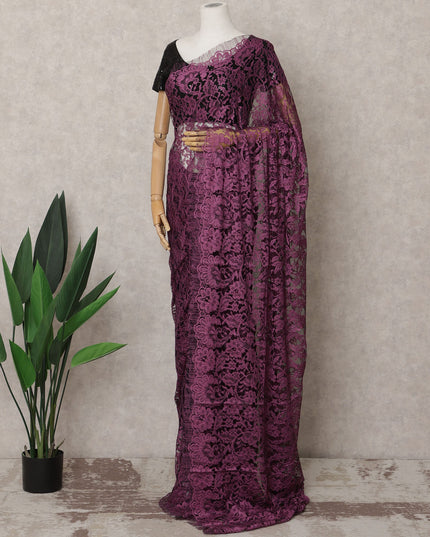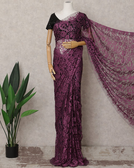 Plum and Black Two-Tone French Chantilly Lace Saree, 5.5 Meters, 110 cm Wide-D21828