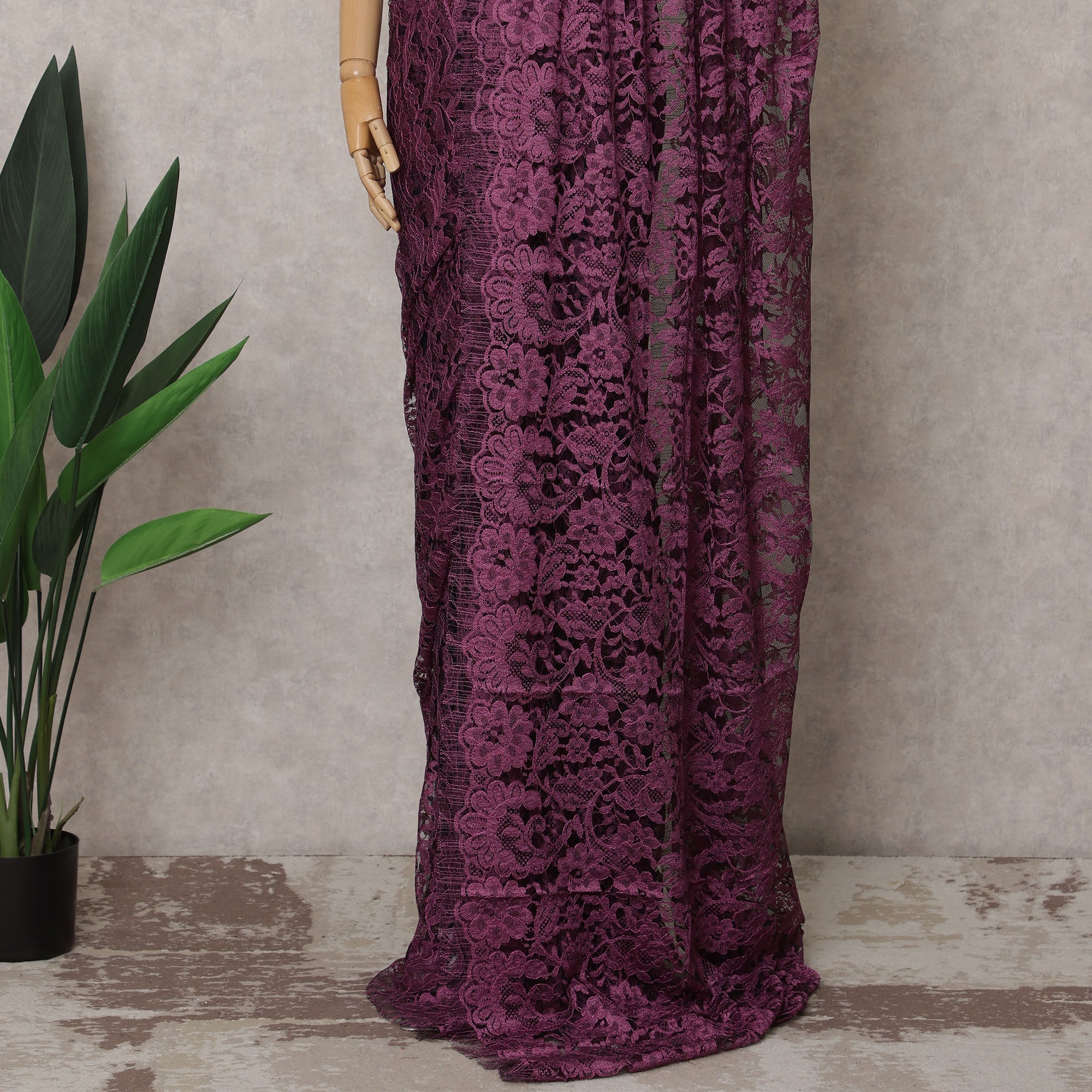 This luxurious plum and black two-tone French Chantilly lace fabric features an intricate floral design with a rich dual-tone effect that creates an elegant and sophisticated look. Perfect for sarees, gowns, and high-end designer wear, the premium Chantilly lace offers a lightweight yet durable texture, ensuring a stunning drape and finish. Measuring 5.5 meters in length and 110 cm in width, it provides ample material for versatile designs. Please note, the blouse piece is not included in this listing.