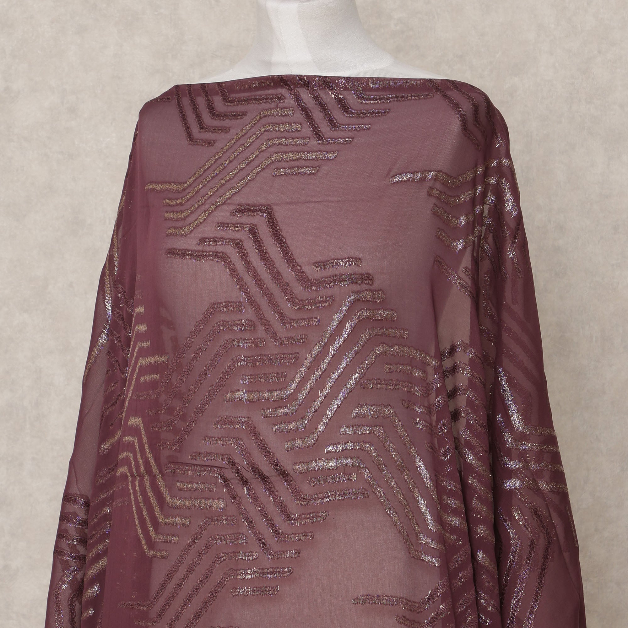This plum brown pure silk chiffon Somali dirac fabric with metallic lurex exudes understated luxury, featuring a soft semi-sheer base... Read more Read more