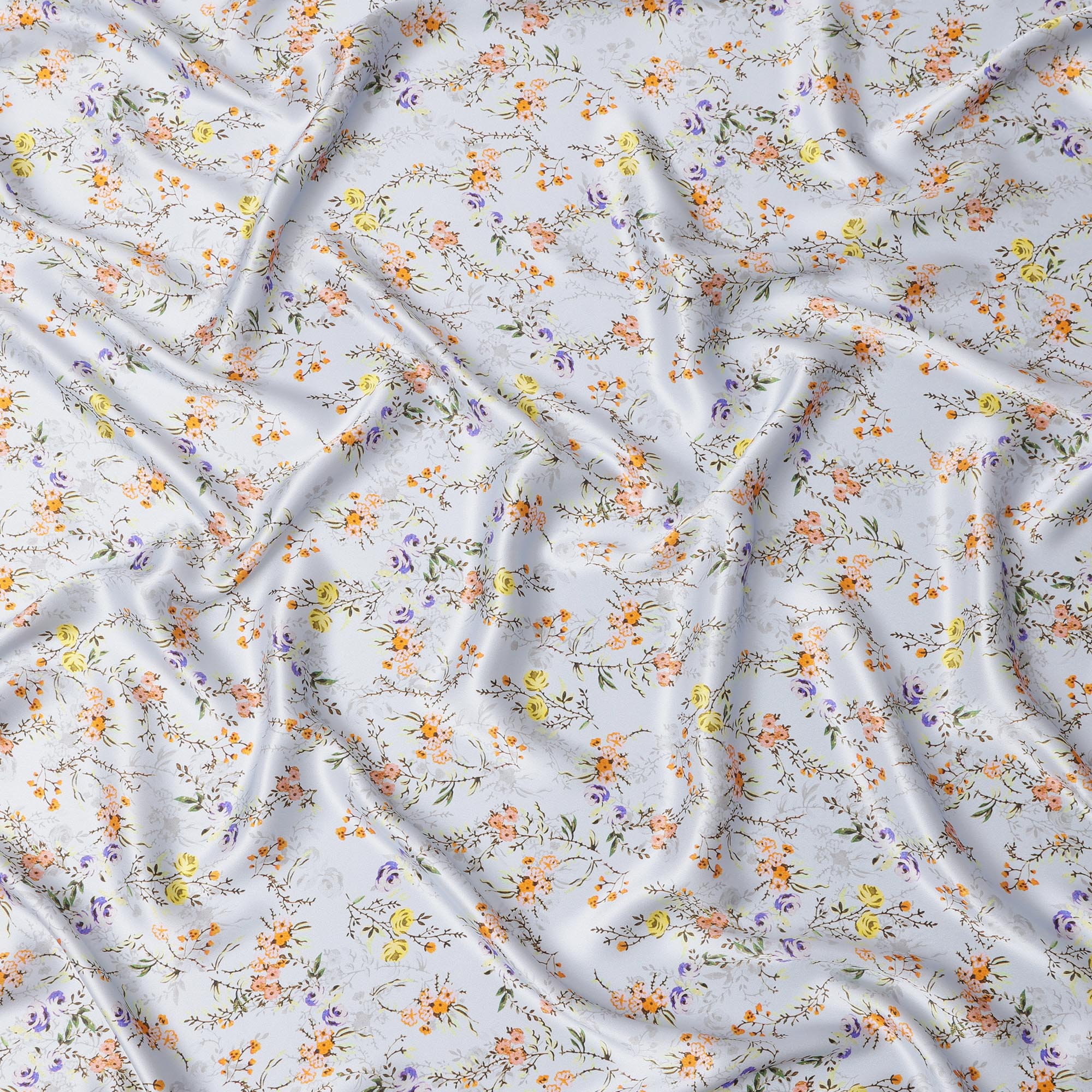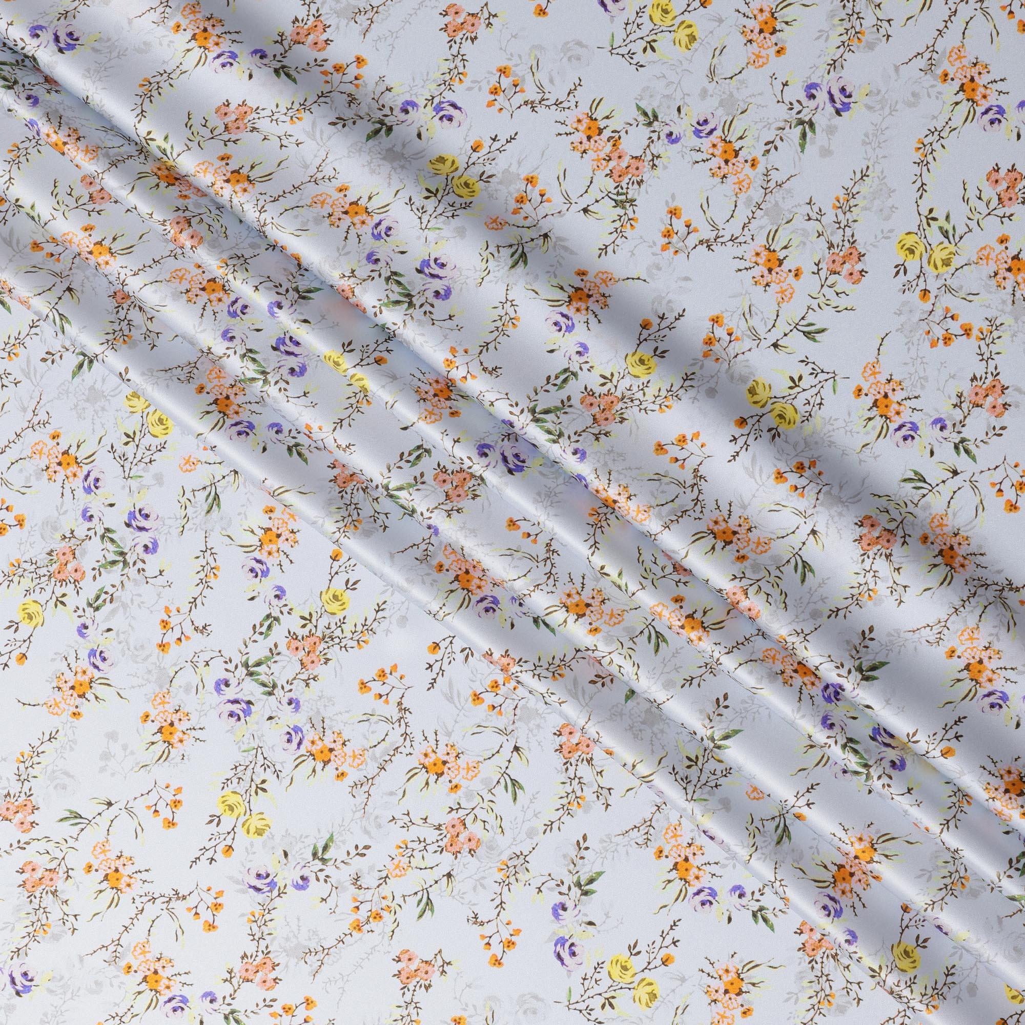 Powder Blue Base with Yellow, Orange & Lavender Mini Floral Print Premium Italian Pure Silk Satin Fabric, 140 Cms Width, Made in Italy-D22989