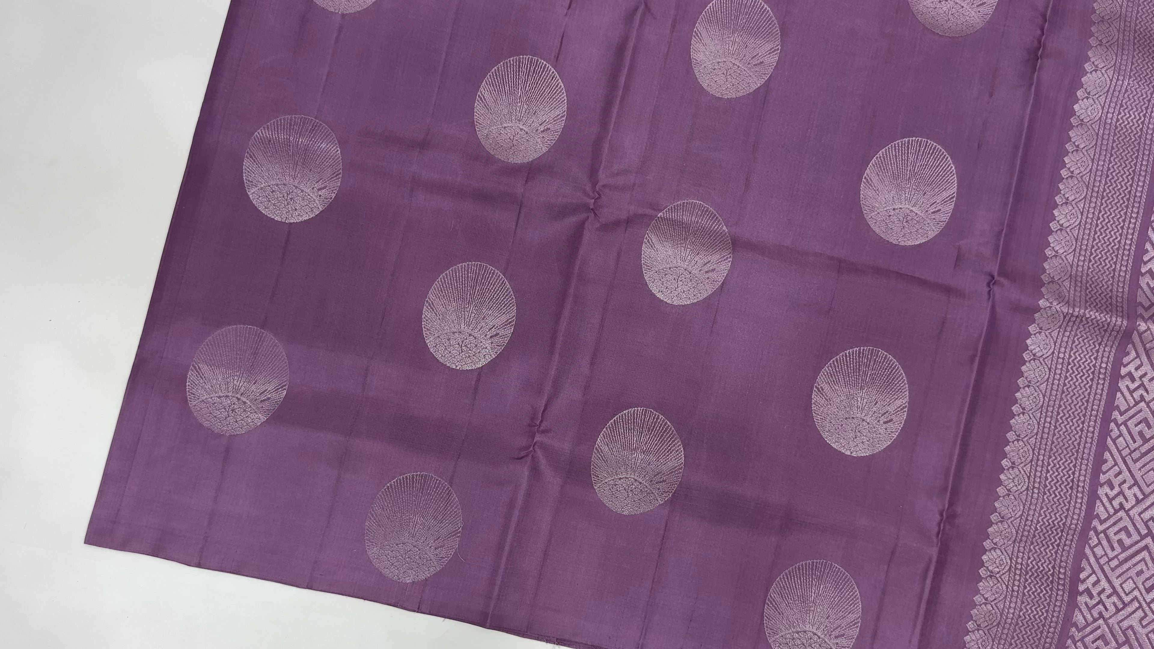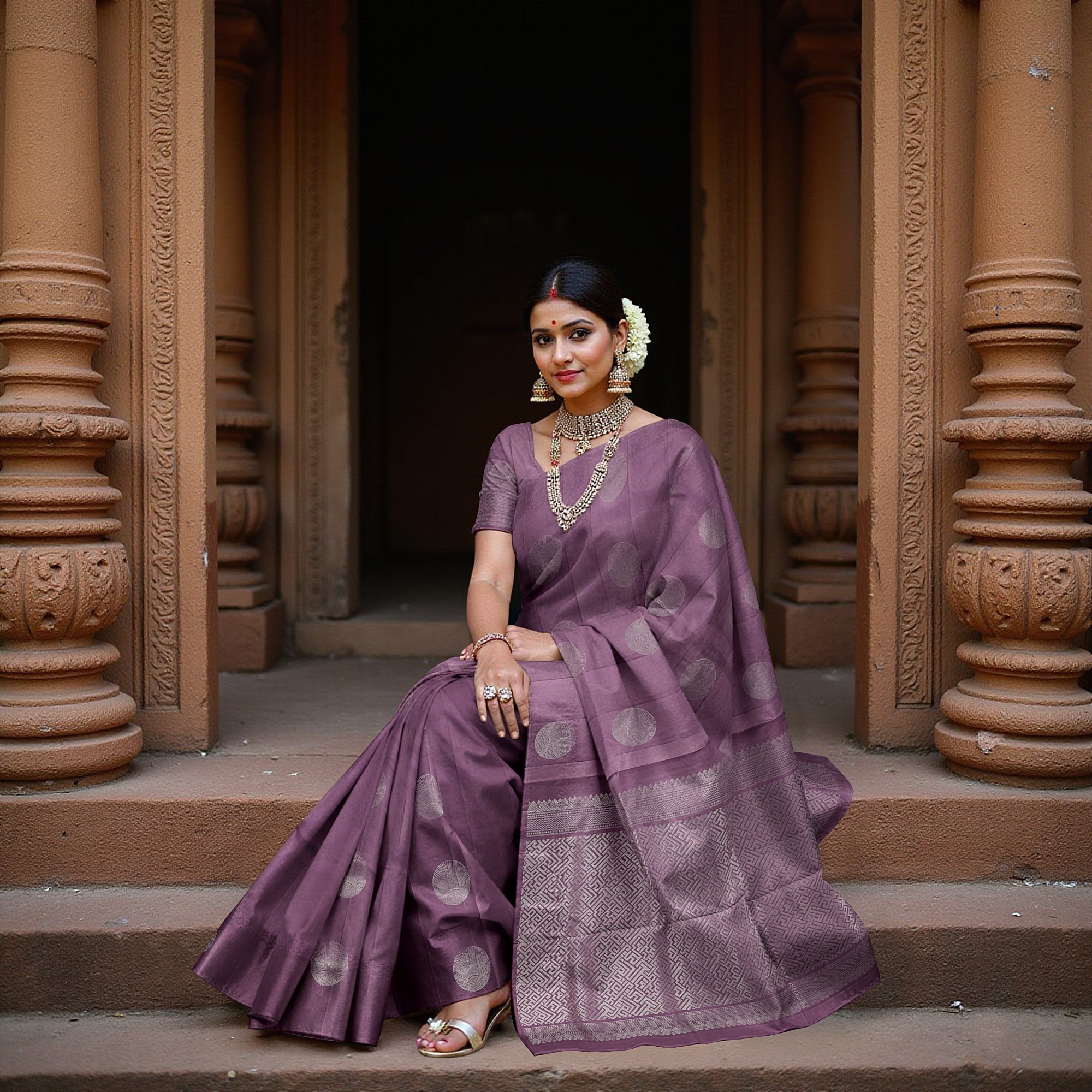 A melody of tradition and finesse, this Purple Pure Soft Silk Saree tells a tale woven in timeless art. Each shimmering silver zari butta, gracefully scattered across the regal purple fabric, is not just a motif but a story sculpted in silk over 36 hours of meticulous craftsmanship. Handwoven by master artisans of South India, the saree captures the spirit of festive elegance with its broad traditional geometric zari border. The soft texture and lustrous drape make it perfect for weddings, grand rituals, or treasured heirlooms. Wearing this saree is not merely about style—it’s about honoring centuries of weaving heritage.