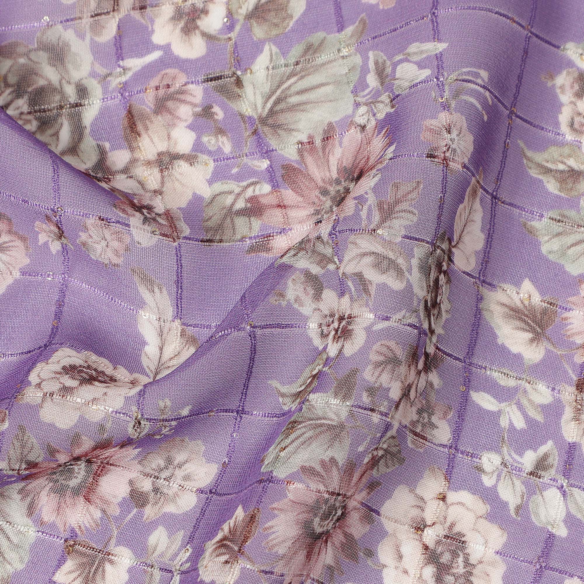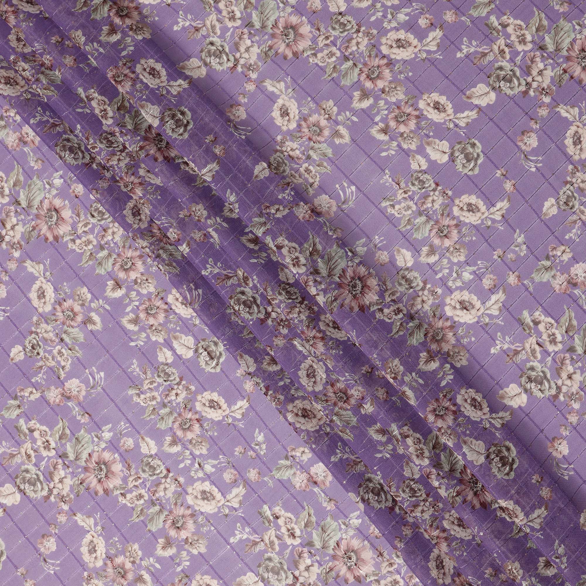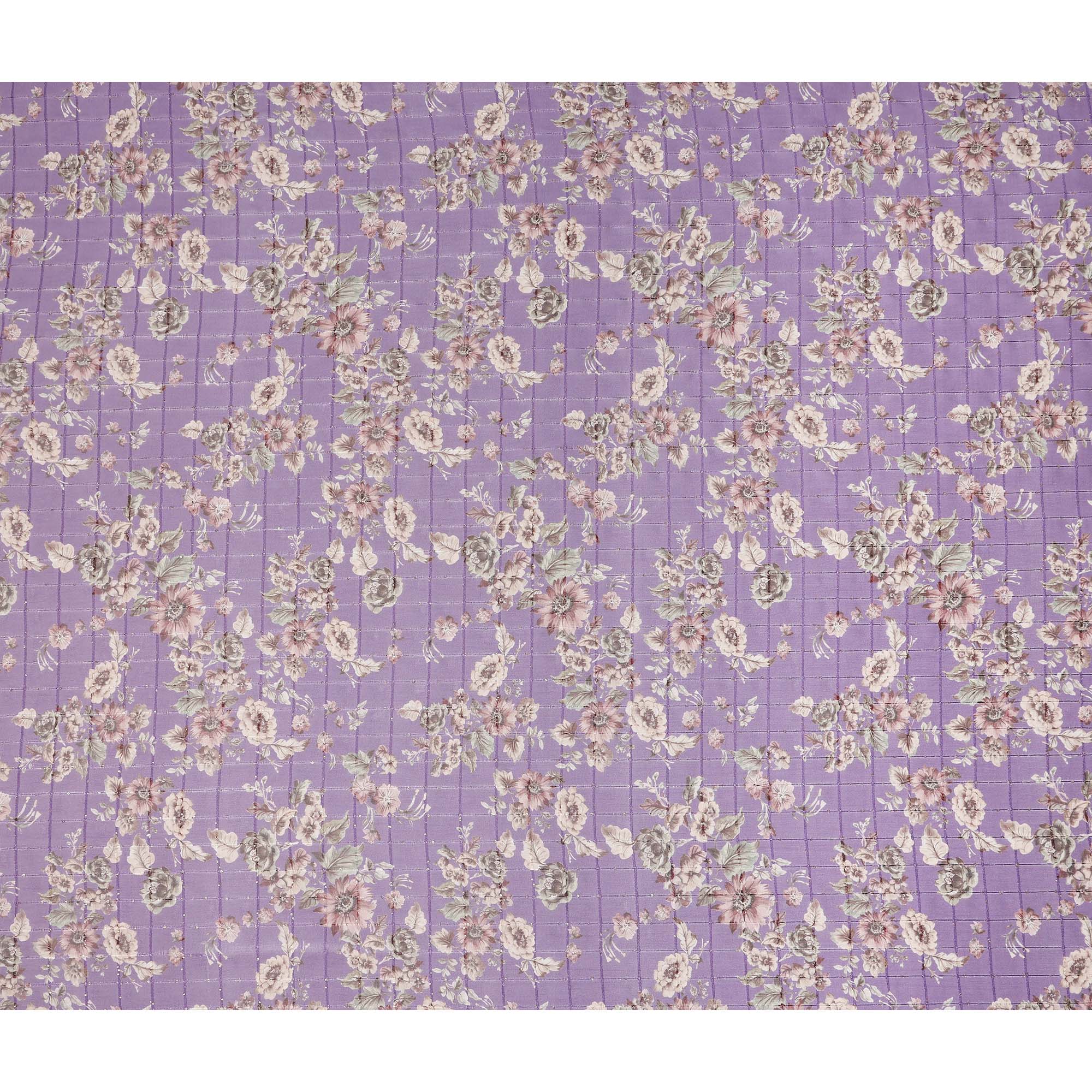 This purple vintage floral garden print viscose georgette fabric is a lightweight and elegant textile designed for creating graceful garments and sophisticated sewing projects. The fabric features a soft purple base decorated with delicate vintage inspired floral prints arranged over a subtle grid pattern, adding depth and a refined botanical aesthetic. Crafted from viscose georgette, the material offers a breathable texture with a smooth and airy feel that drapes beautifully, enhancing the natural movement of garments. This makes it an excellent choice for dresses, blouses, skirts, scarves, and layered fashion pieces that require fluidity and comfort. With a width of 110 cms, it provides versatility for both professional designers and home sewing enthusiasts. The combination of floral elegance and soft flowing structure allows the creation of stylish outfits that balance comfort, charm, and timeless floral appeal.