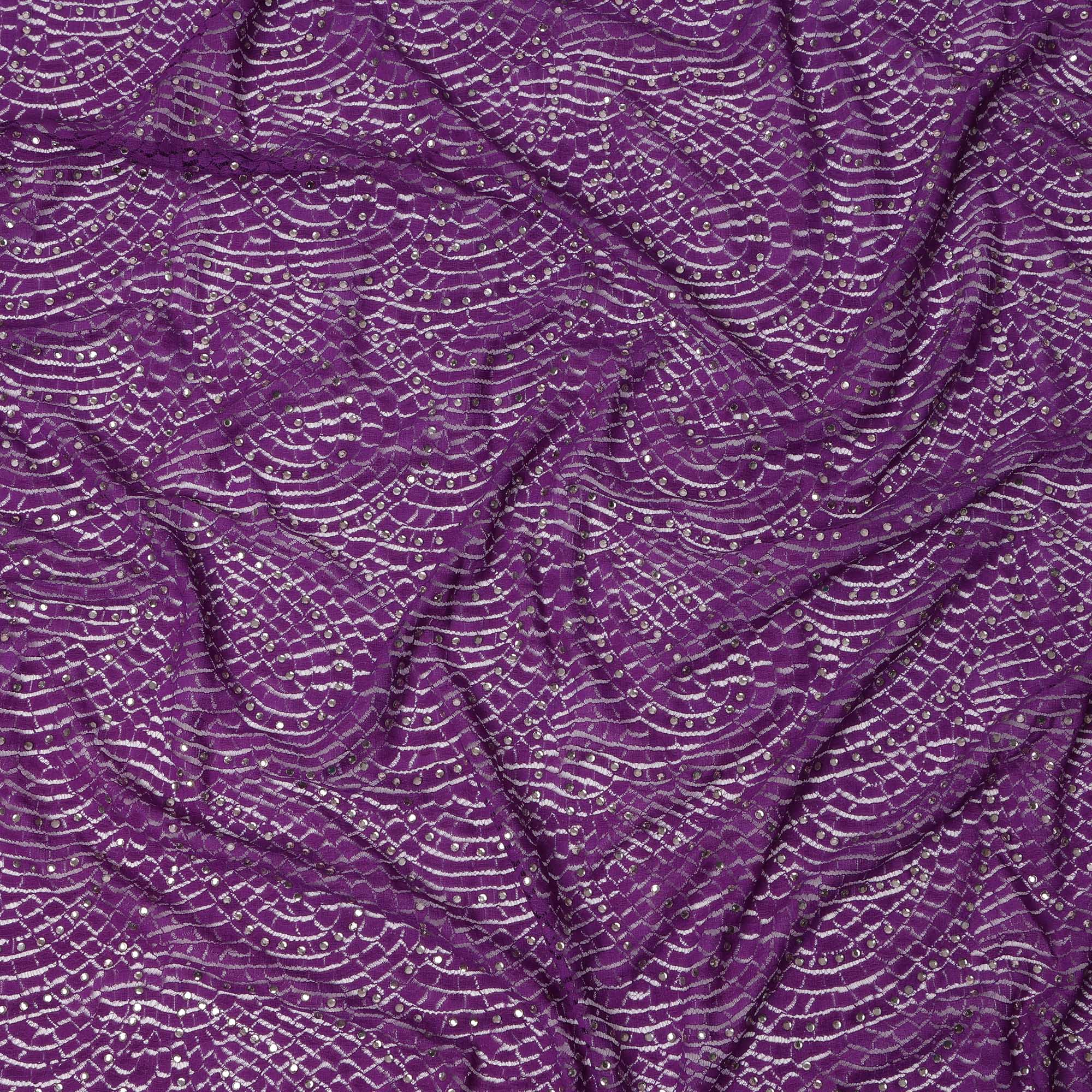Striking and versatile, this purple nylon tulle fabric features a wave-inspired embroidered pattern layered with shimmering silver sequins across a... Read more Read more