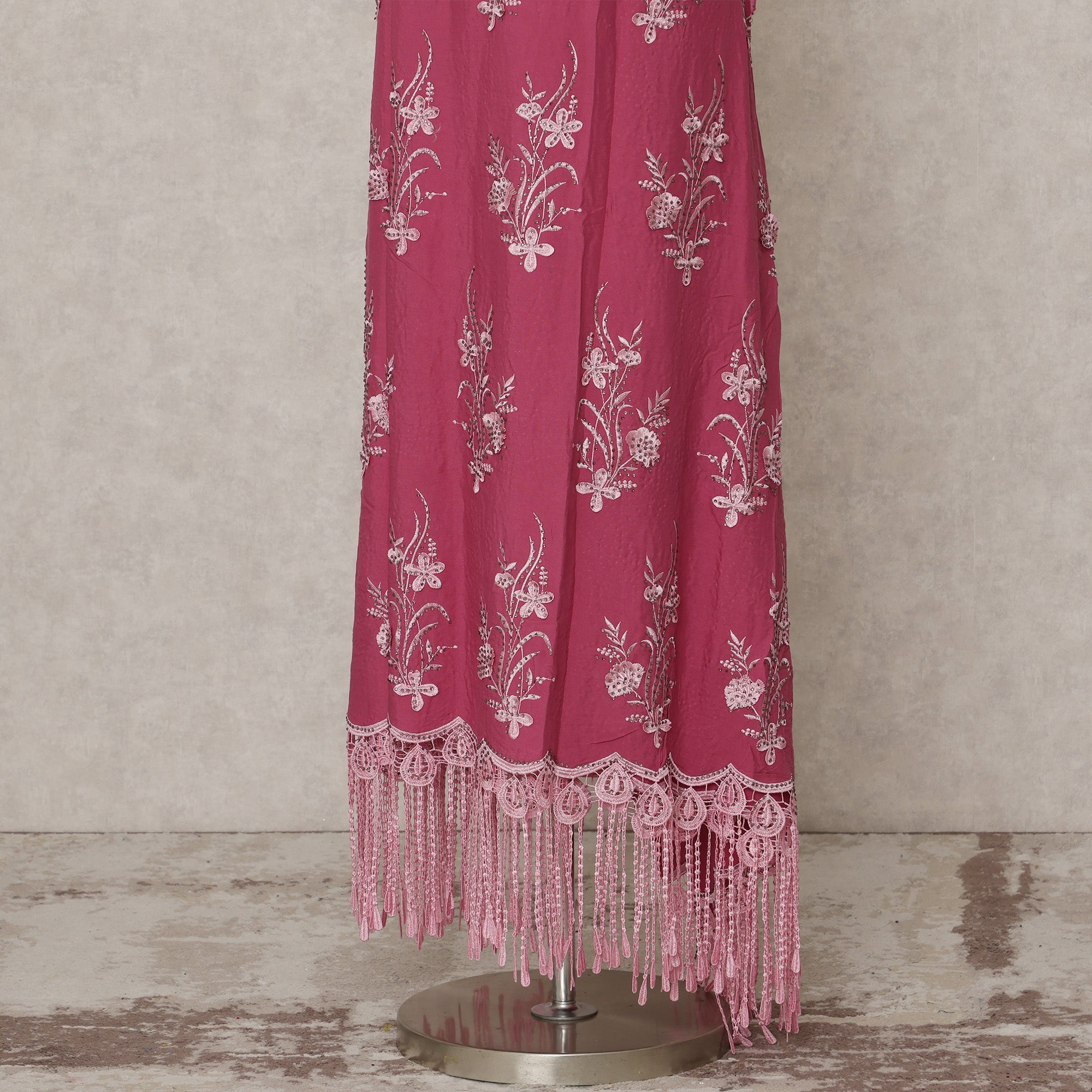 • Sale -75% Rani Pink Blended Cotton Fabric with White Thread Embroidery and Lace Tassel Border, 130 Cms Width, 3.0 Mtrs Length, Made in India-D24150