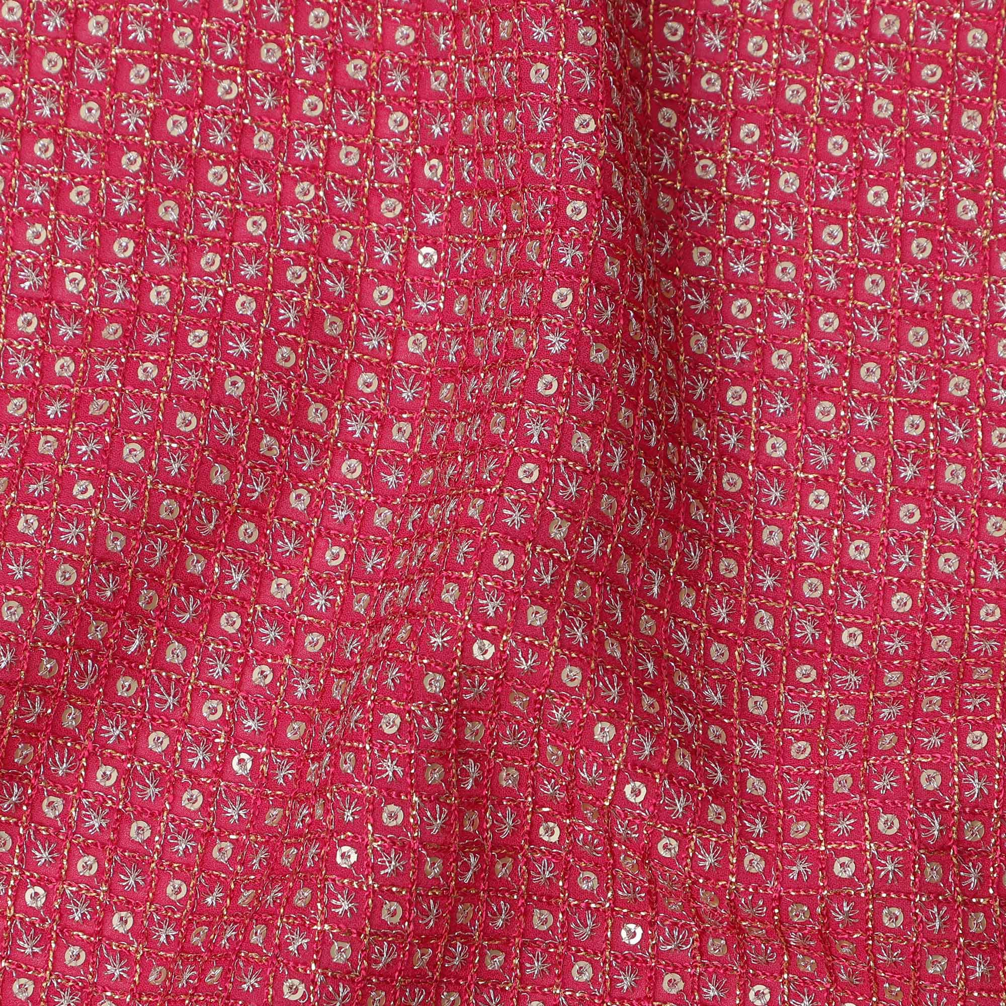 This rani pink synthetic blended viscose fabric is a vibrant celebration of festive elegance, adorned with delicately embroidered floral motifs set within square grids and accentuated with radiant mirror work. The striking pink hue adds a rich, royal charm, making it a perfect canvas for ethnic wear like lehengas, anarkalis, or statement dupattas. Measuring 110 cms in width, the fabric offers excellent flexibility for both traditional and fusion outfits. Crafted in India with precise detailing and mirror embellishments, it blends tradition with modern design effortlessly. Buy online now to transform your wardrobe with color and sparkle.