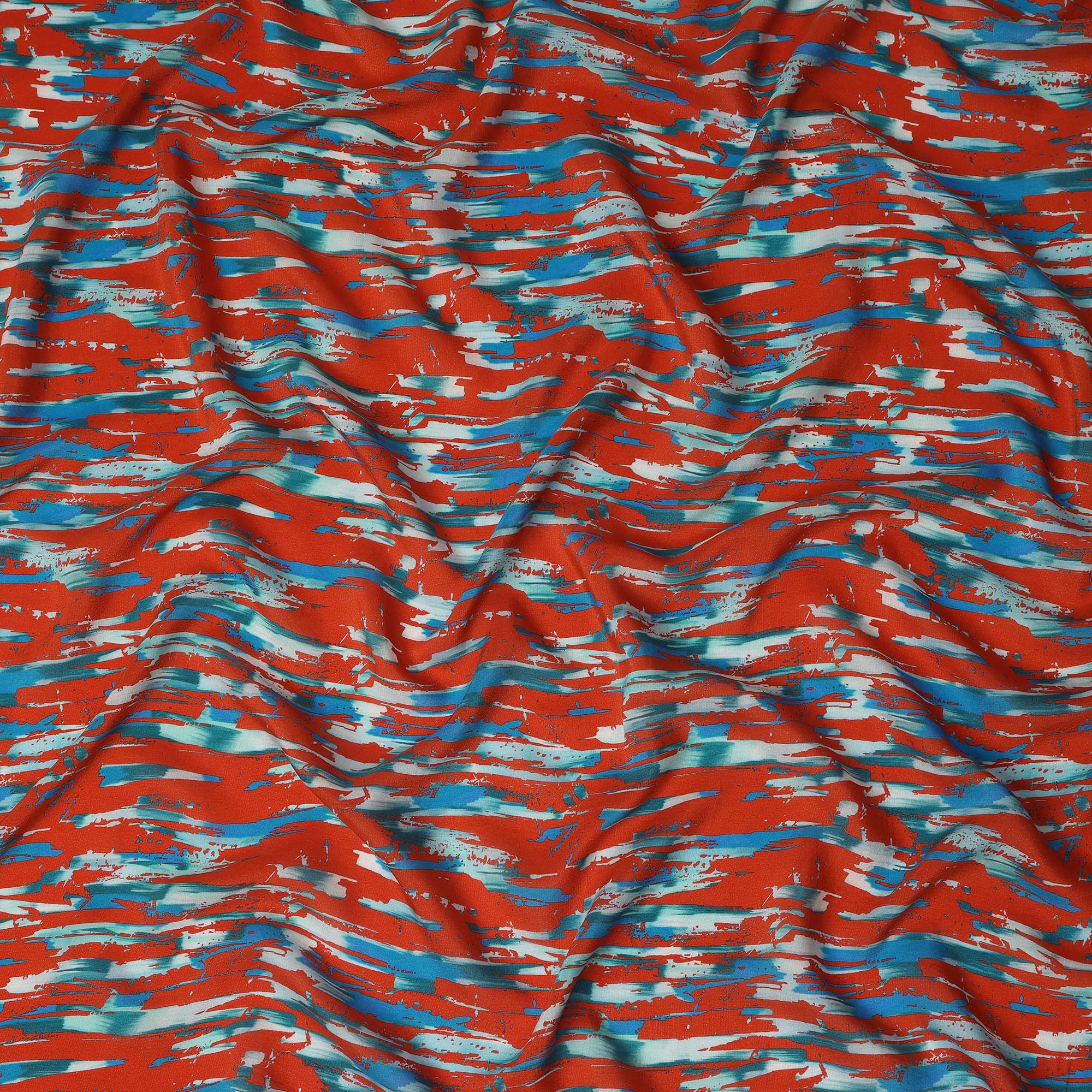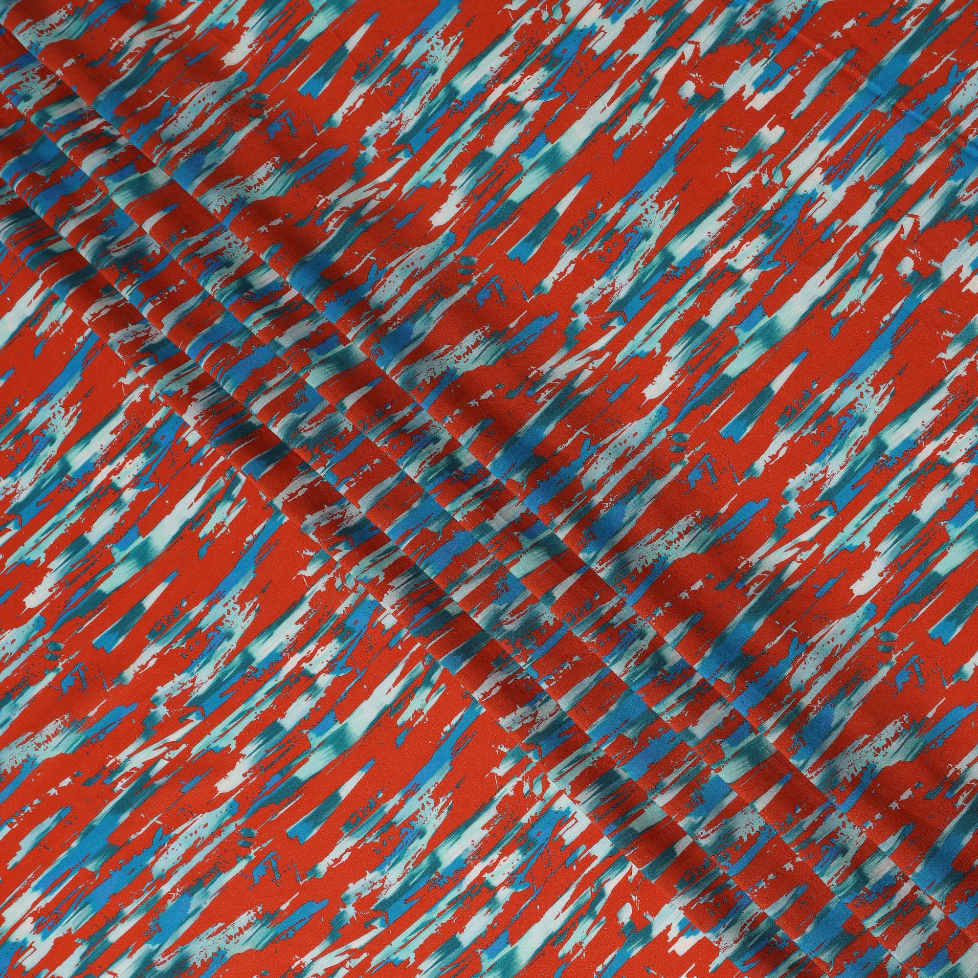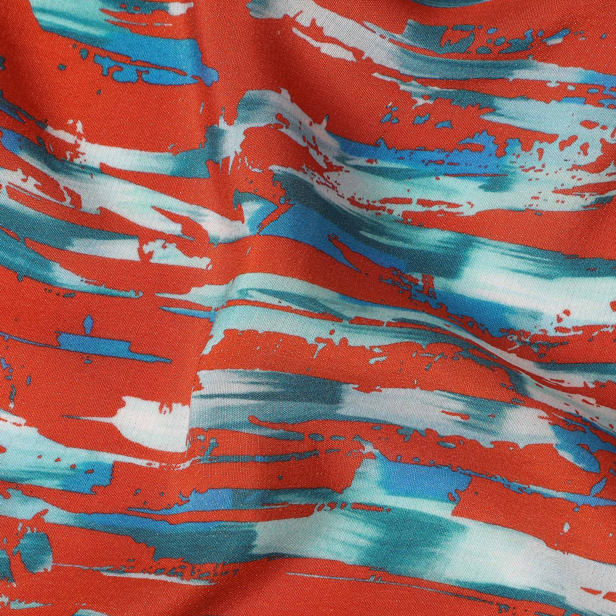 Red Abstract Brush Printed Viscose Modal Satin Fabric Teal Streak Multicolor Design Soft Flowing Dress Material 110 Cms Width India-D28015