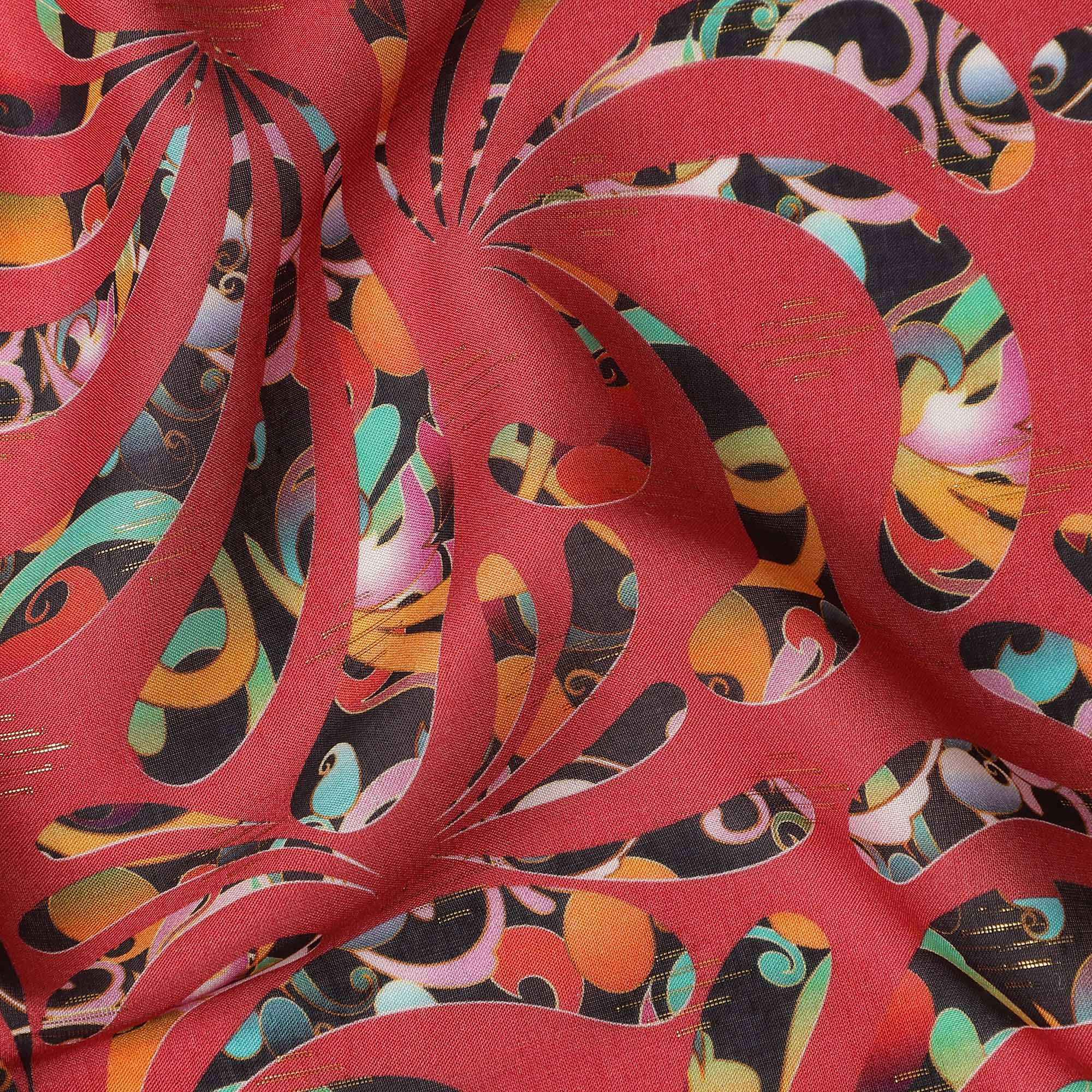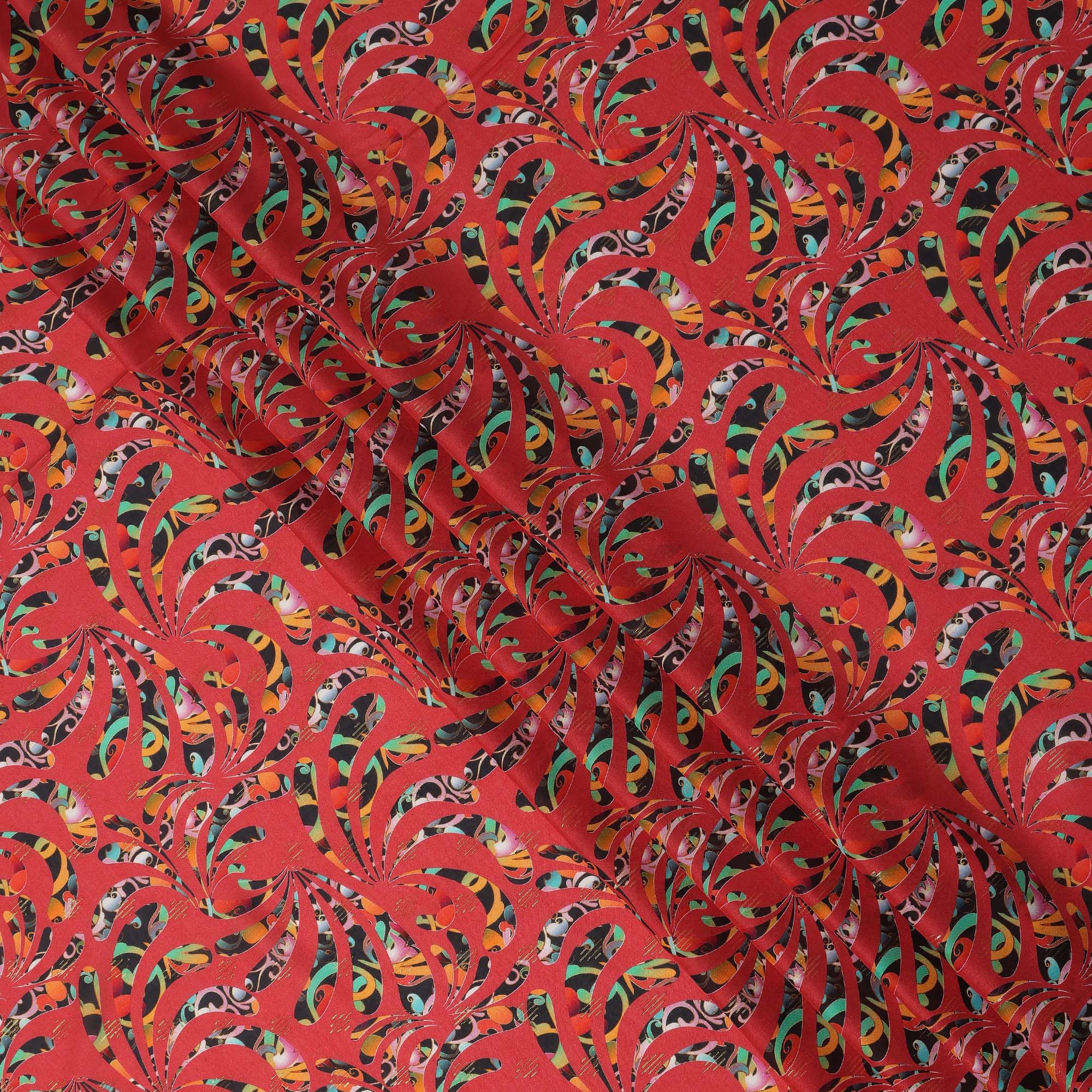 This red abstract swirl printed viscose crepe fabric features a vibrant red base highlighted with intricate multicolor artistic patterns that... Read more Read more