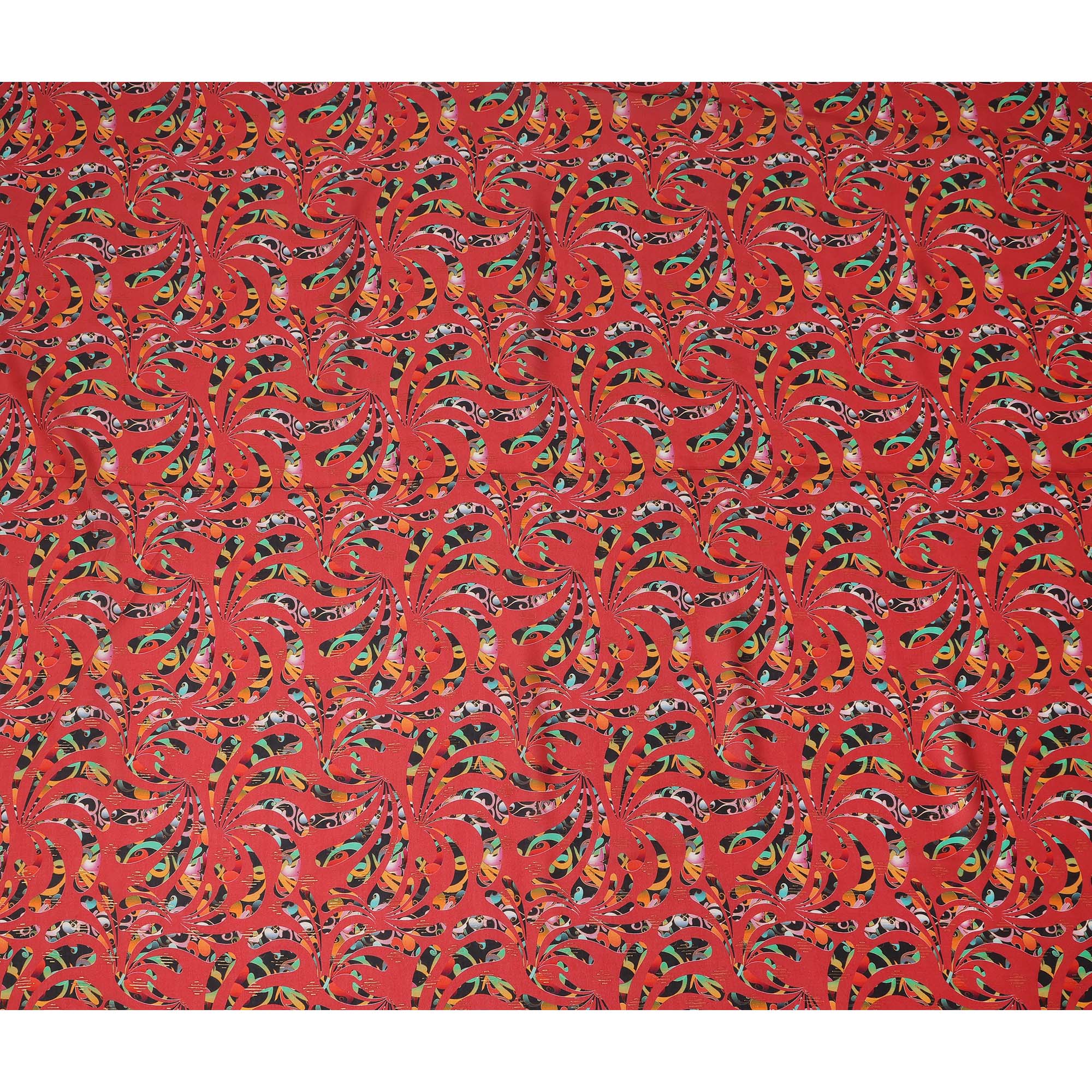 This red abstract swirl printed viscose crepe fabric features a vibrant red base highlighted with intricate multicolor artistic patterns that create a bold and eye catching appeal. The flowing swirl motifs combined with detailed accents in shades of green, yellow, black, and subtle tones add depth and movement to the design. Crafted in 110 cms width, this viscose crepe offers a soft texture with a smooth surface and graceful drape that enhances the fall of any garment. Lightweight and breathable, it ensures all day comfort while maintaining a refined and stylish look. Ideal for dresses, kurtis, tops, skirts, and co ord sets, this fabric is perfect for creating contemporary outfits that stand out with confidence and creative flair.