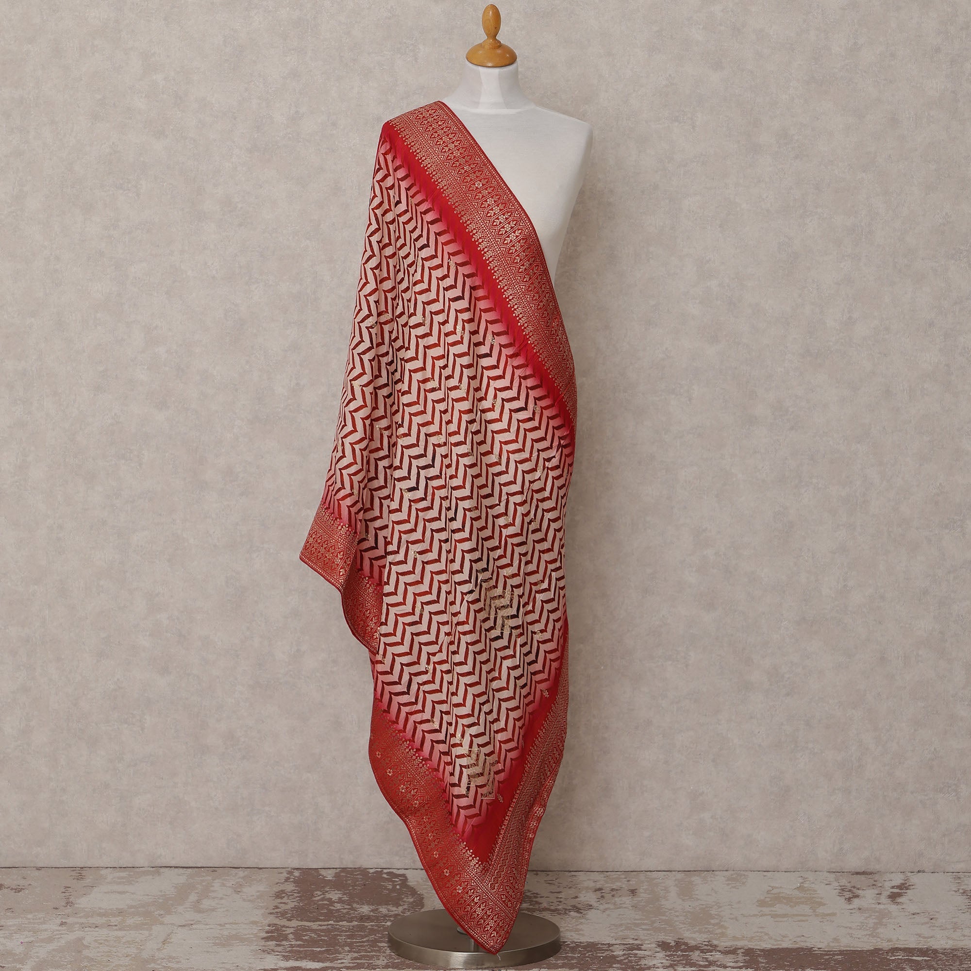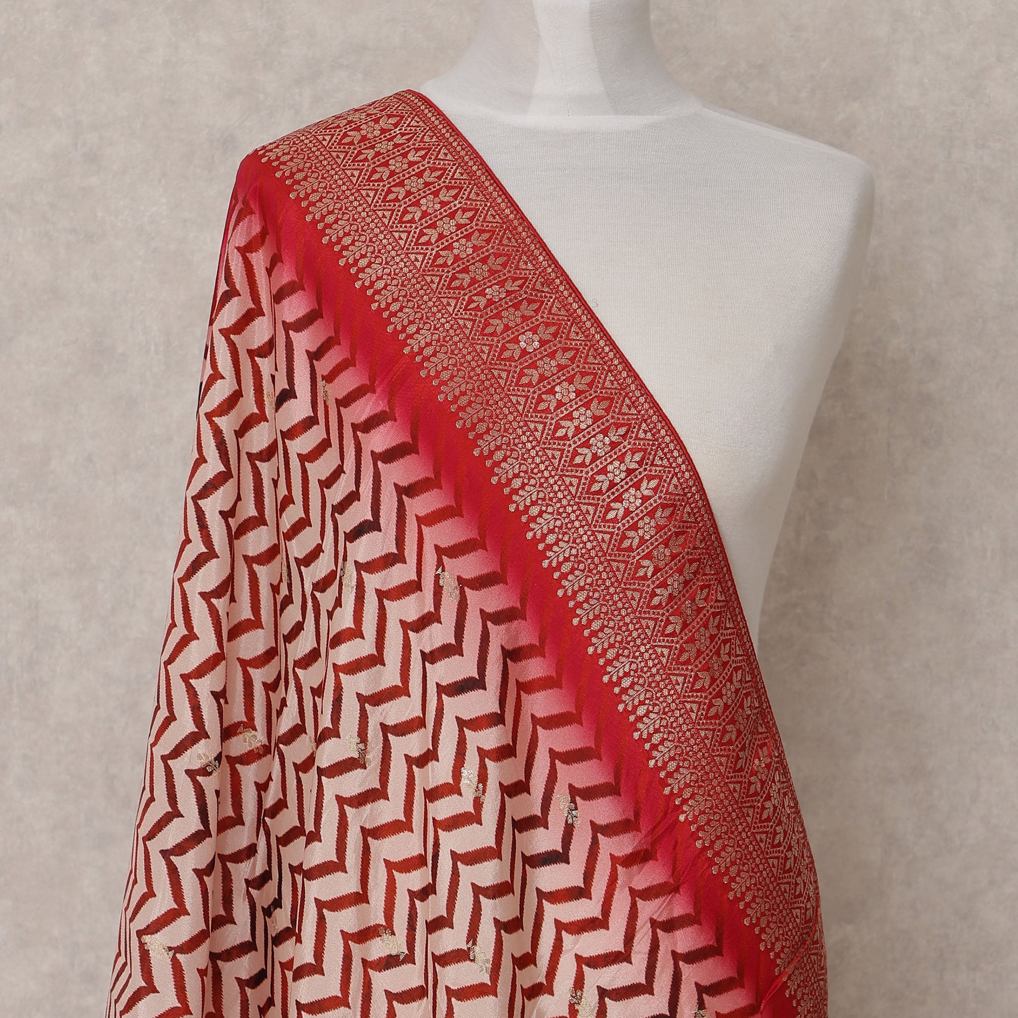 Red and Beige Chevron Pattern Synthetic Brocade Dupatta with Ornate Border, Size 210X90 Cms, India-D24854