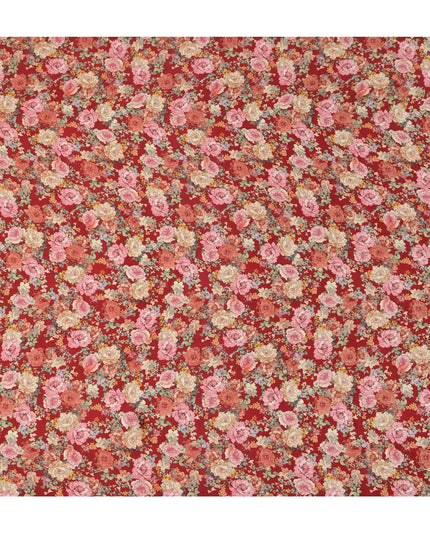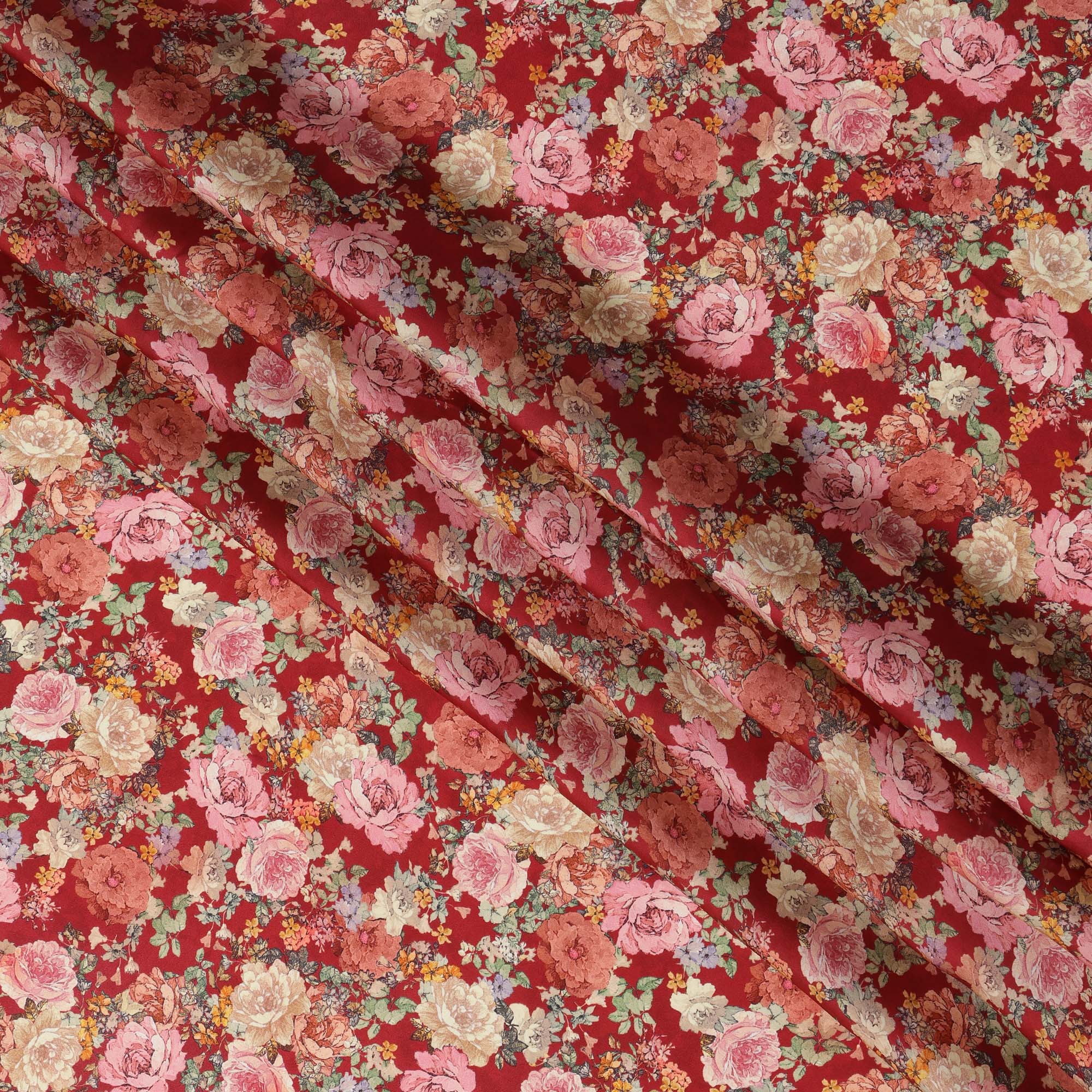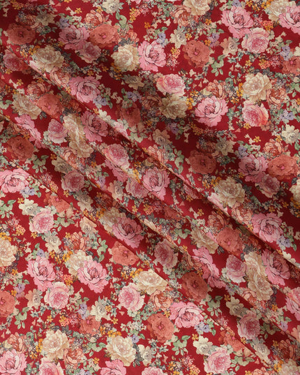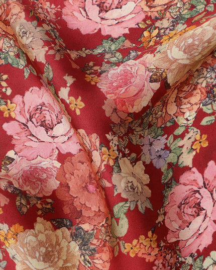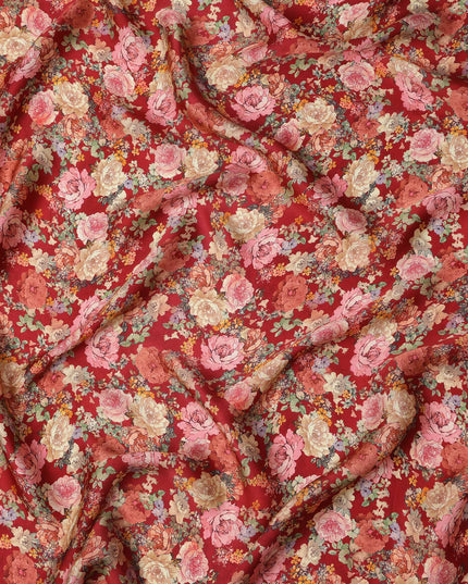 Red and Multicolor Floral Synthetic Satin Fabric – 110 cm Width, Soft & Lustrous-D21907