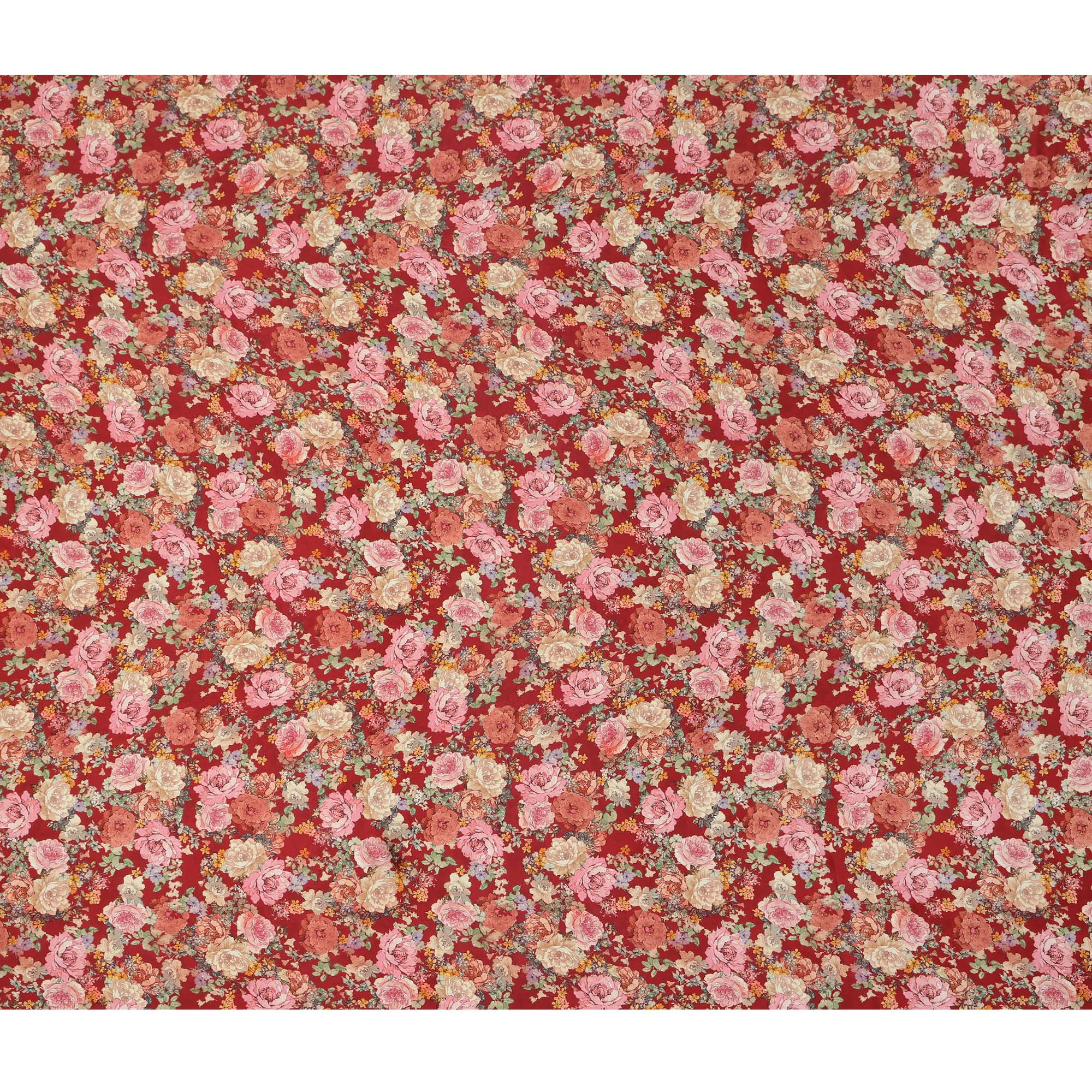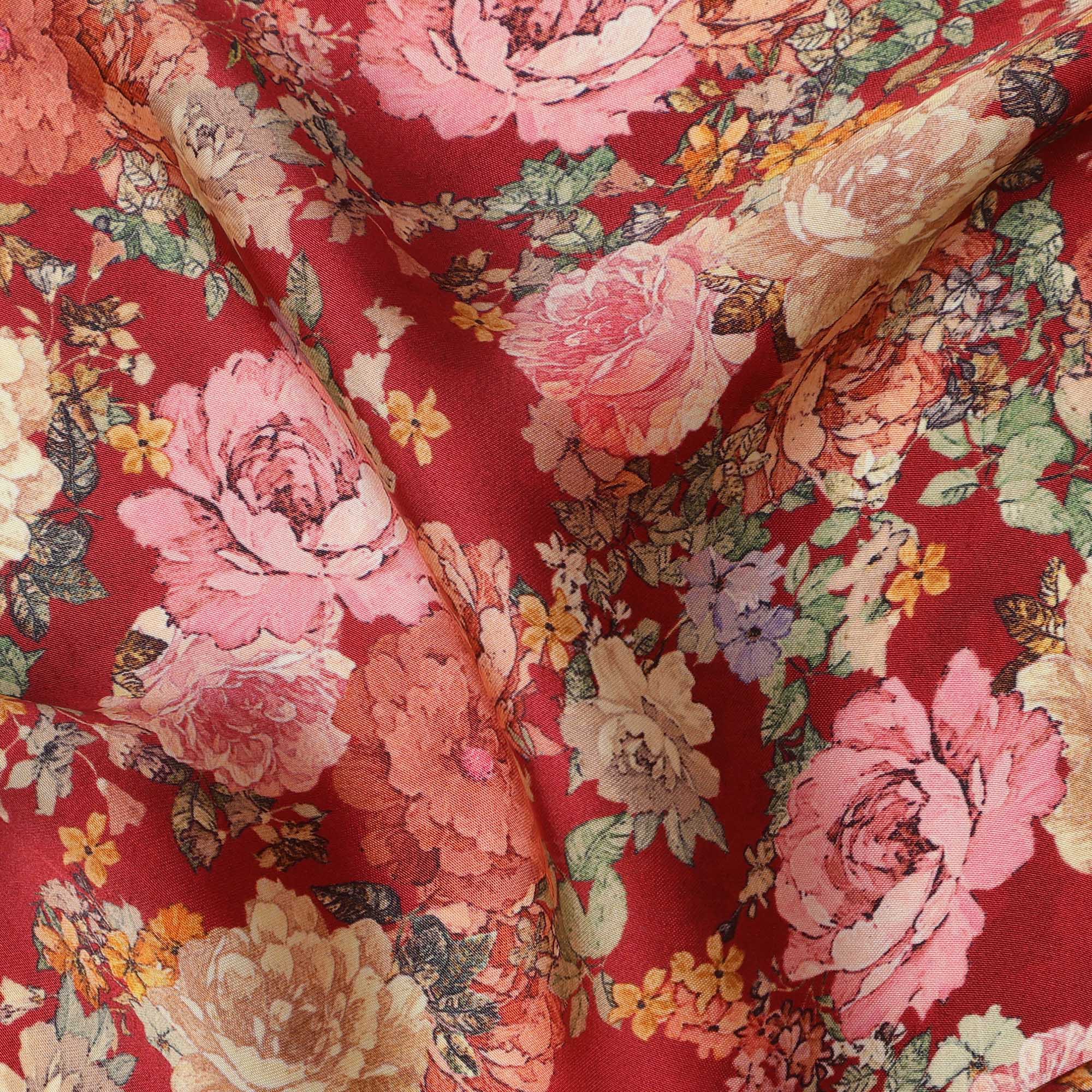 Elevate your fashion and décor with this red and multicolor floral synthetic satin fabric, featuring an intricate floral design in shades of pink, gold, and green set against a rich red background. The 110 cm wide fabric offers a smooth, glossy texture that provides an elegant drape, making it ideal for dresses, scarves, blouses, and home décor accents. Its lightweight and breathable nature ensures comfort while maintaining a luxurious appearance. Whether used for stylish outfits or creative projects, this high-quality satin fabric delivers sophistication, versatility, and a stunning sheen.