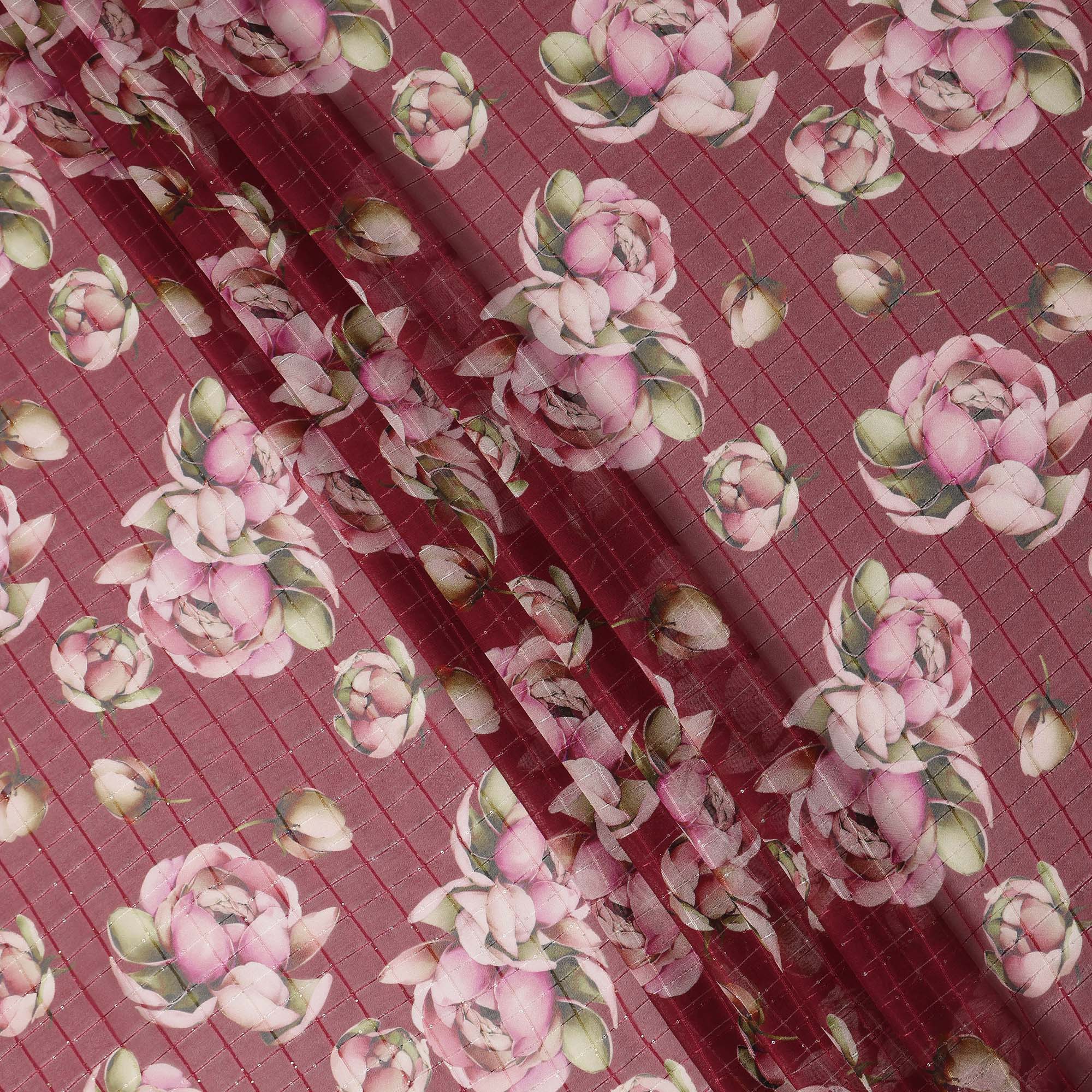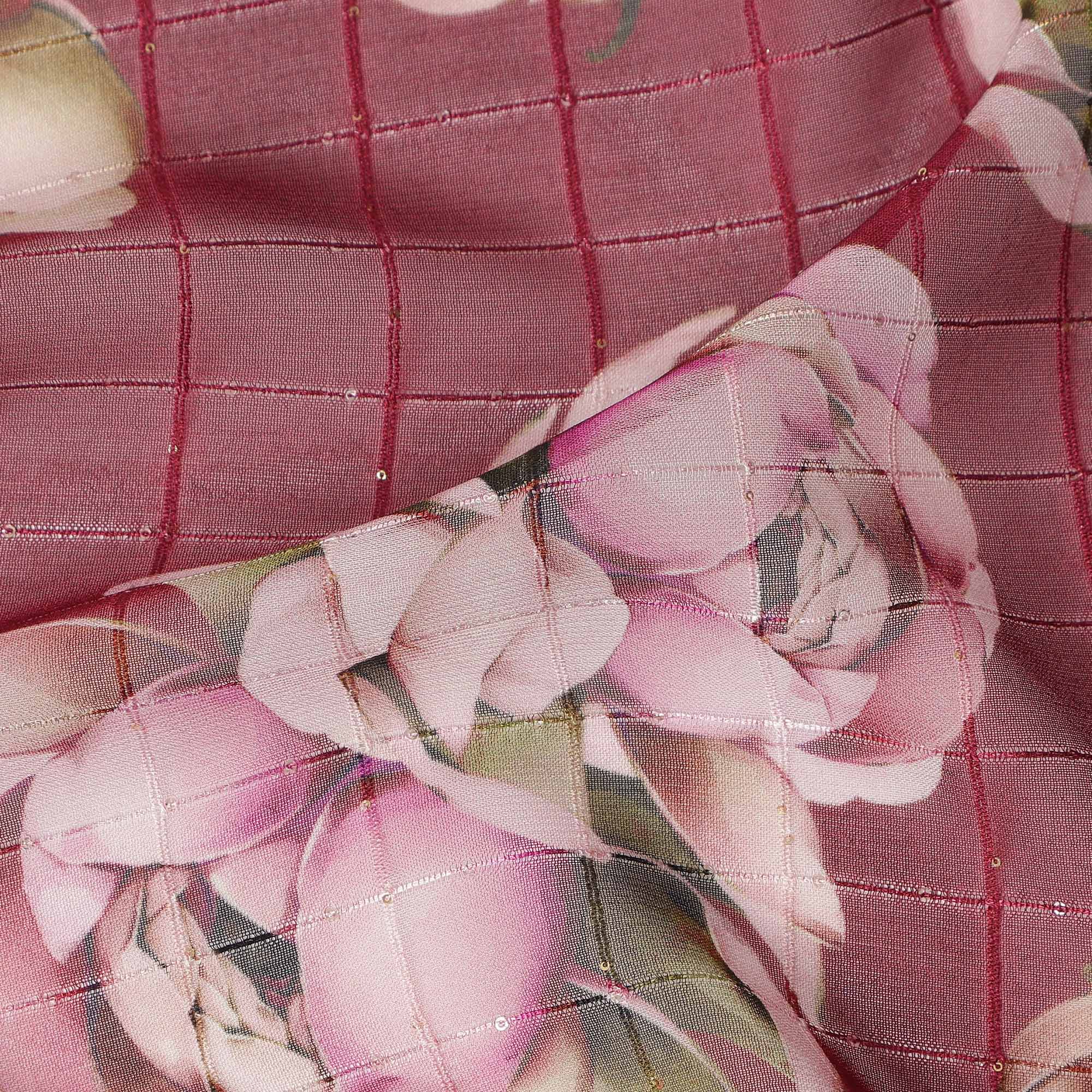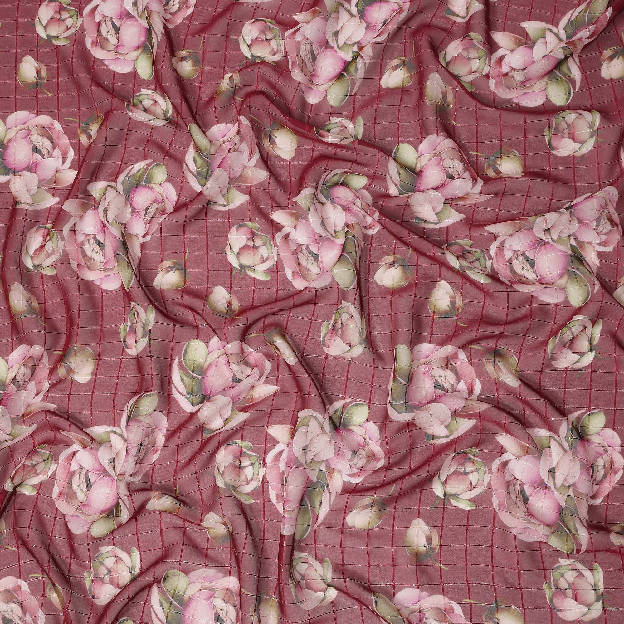 Red Pink Floral Rose Print Viscose Georgette Fabric Soft Lightweight Flowing Dressmaking Sewing Material Floral Grid Design Printed Fabric 110 Cms Width Made in India-D28219