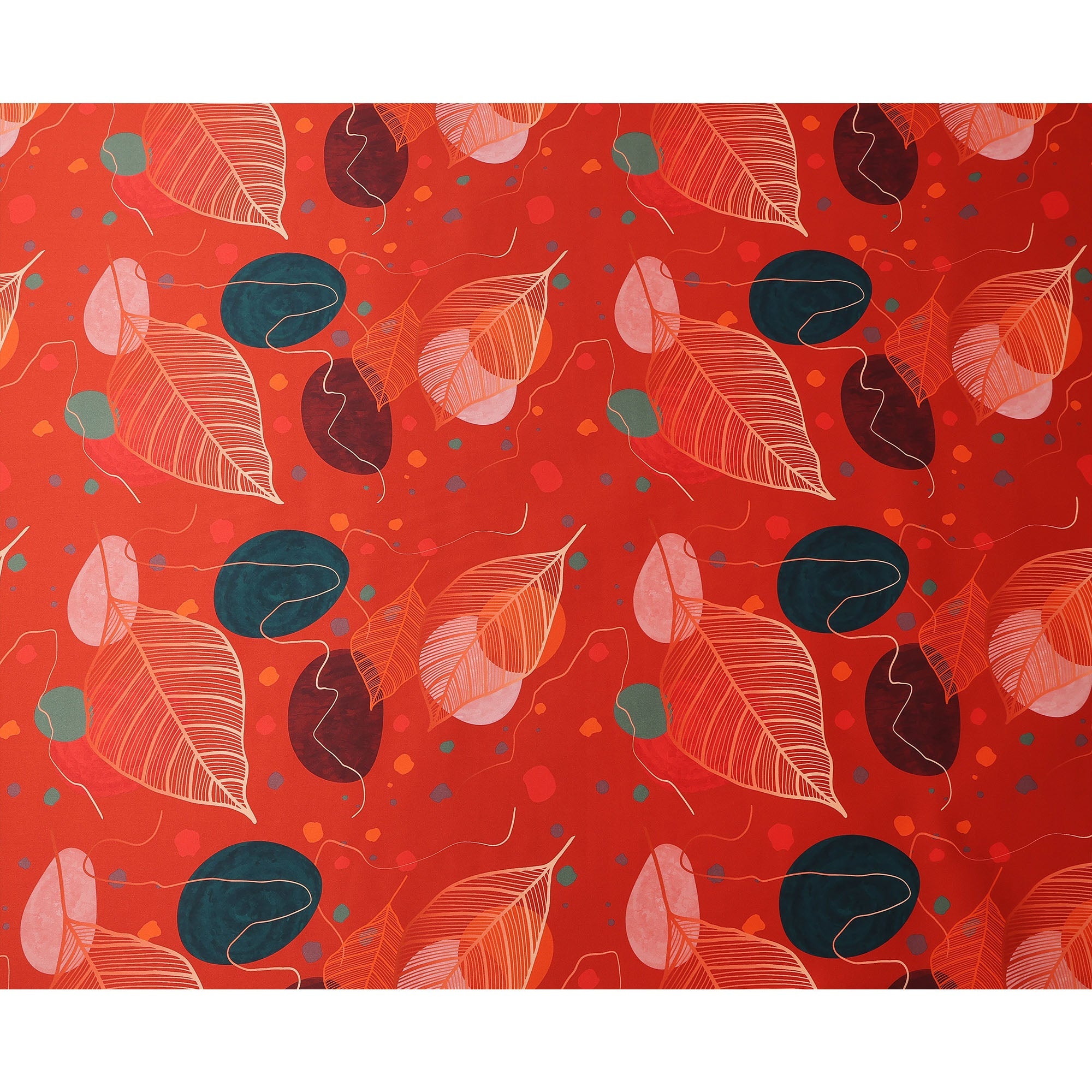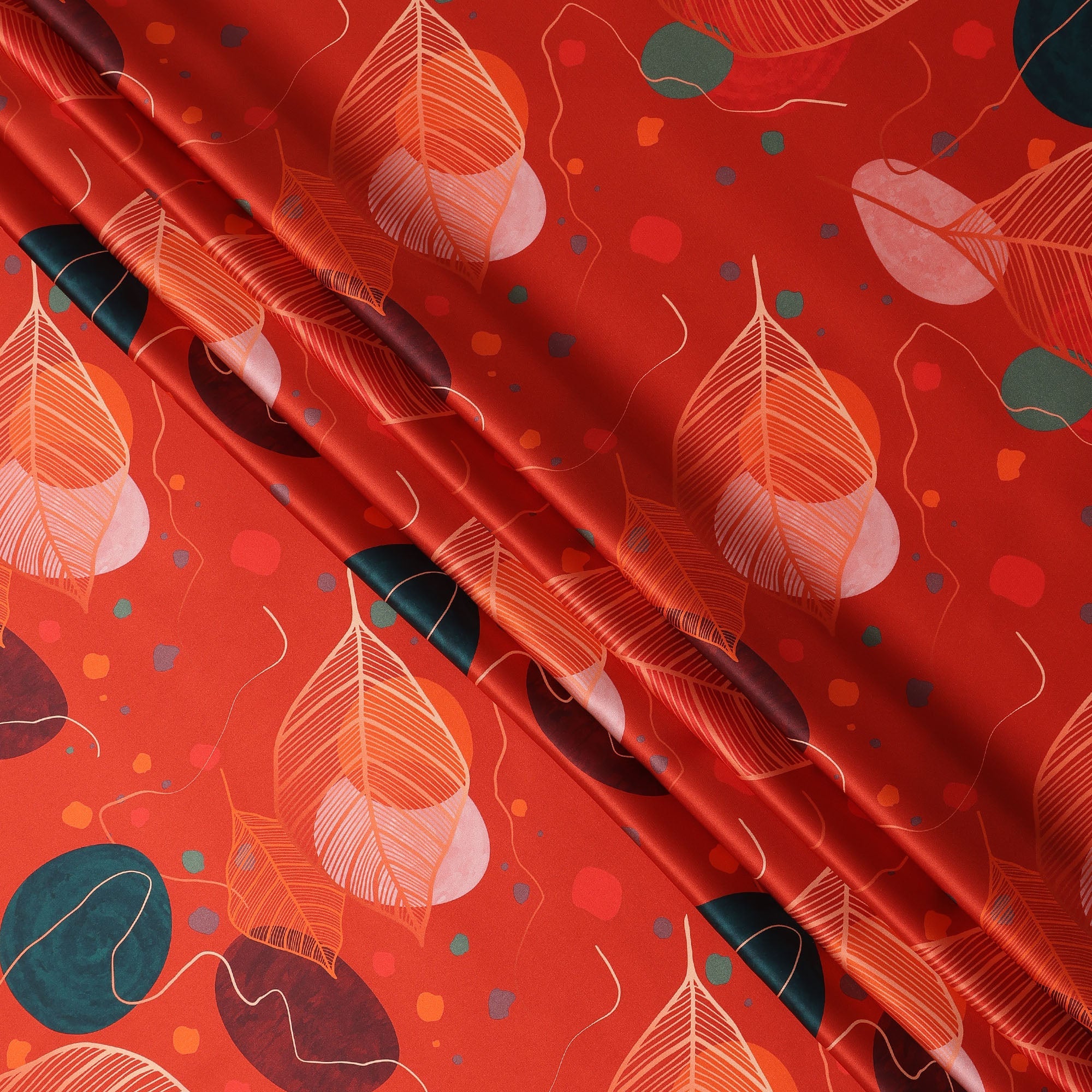 Red Pure Silk Satin Fabric with Abstract Leaf and Geometric Print, 140 Cms Width, South Korea-D25360