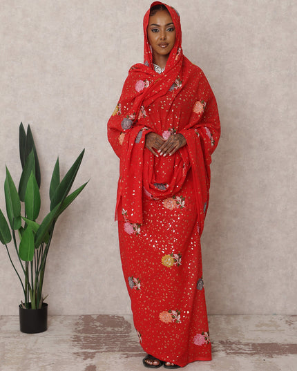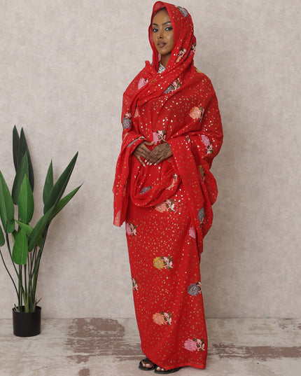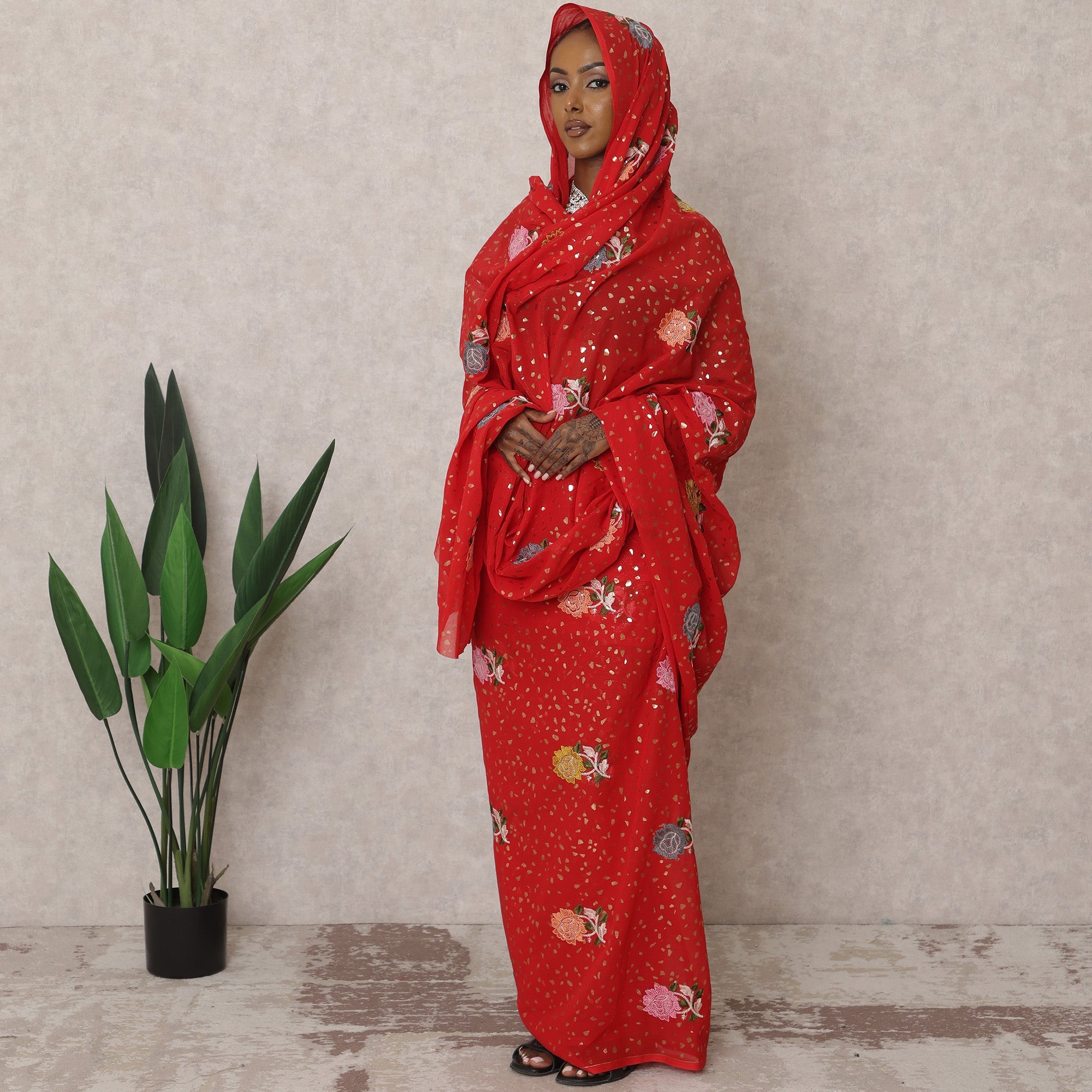 Drape yourself in elegance with this striking red traditional Sudanese thobe, crafted from soft and breathable pure cotton voile embroidery fabric for all-day comfort. The 4.5-meter-long fabric falls gracefully, creating a modest yet captivating silhouette perfect for cultural celebrations, festive occasions, and everyday wear. Designed with exquisite floral embroidery in vibrant shades and delicate gold shimmer accents, this thobe brings together heritage and contemporary charm. With a width of 140 cm, it ensures full coverage while maintaining a lightweight and airy feel. Expertly crafted in India, this high-quality thobe is easy to wash and retains its intricate embroidery, color vibrancy, and fabric softness over time, making it a timeless wardrobe essential.