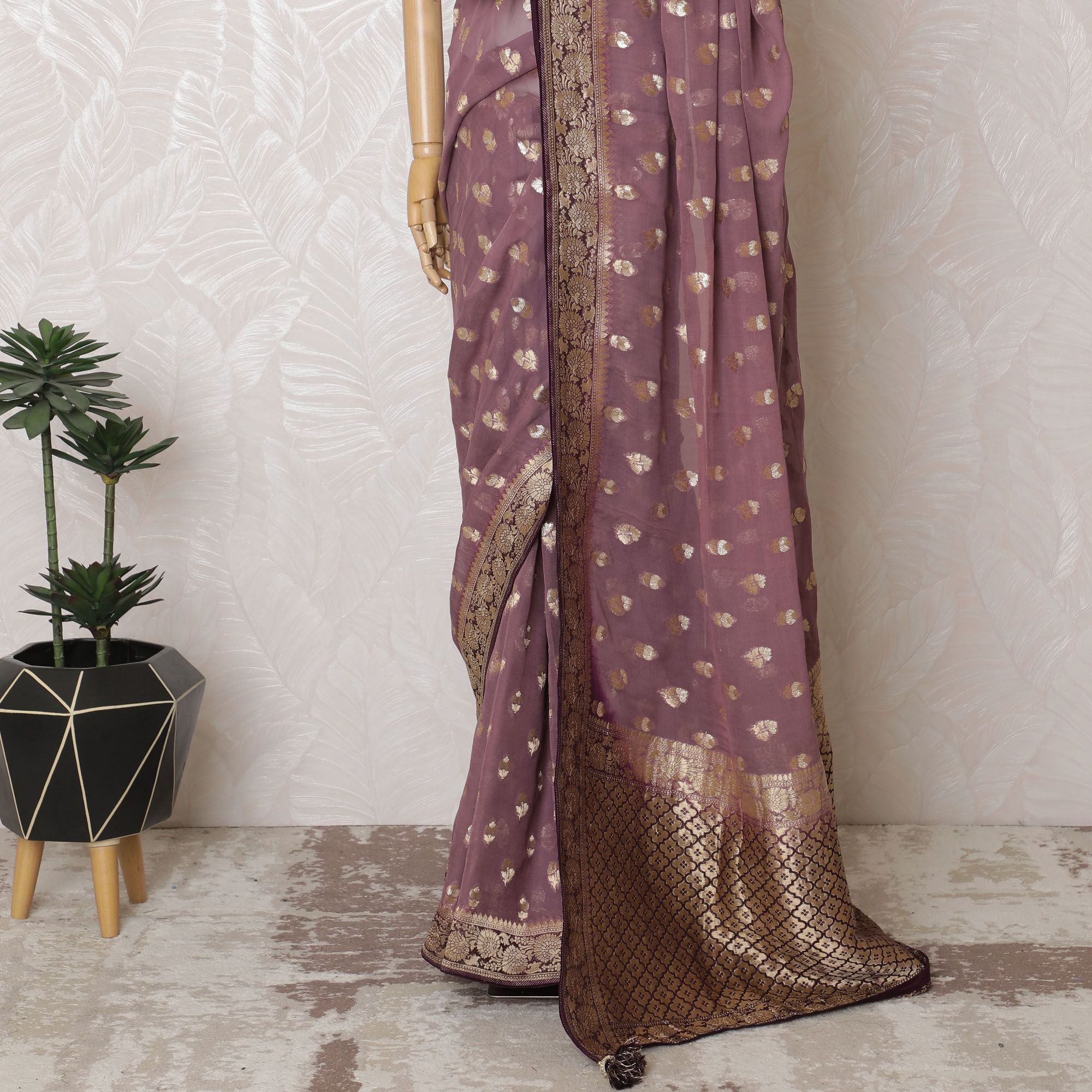 ,Embrace the majesty of our Mauve Silk Georgette Jacquard Saree, where traditional weaving meets modern elegance. This saree, hailing from the heart of India, is a splendid showcase of the jacquard technique, woven to perfection with a width of 110 cms. Adorned with gold foil motifs that catch the light with every movement, it promises a look of understated opulence. The ornate border intricately frames the saree, enhancing its grandeur. Each drape feels luxurious and lightweight, offering both comfort and style for your celebratory occasions. (Note: Blouse not included.),