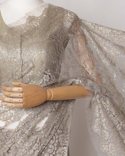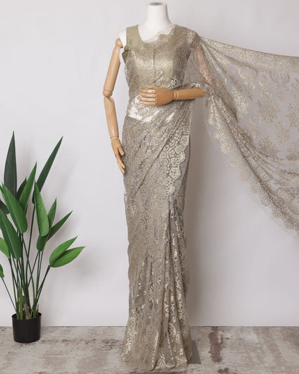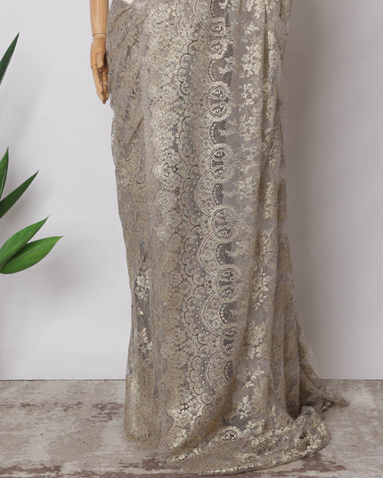Rhino Grey, Gold Premium French Metallic Chantilly Saree Lace Fabric, 5.5 MetersX110 Cms-D21502