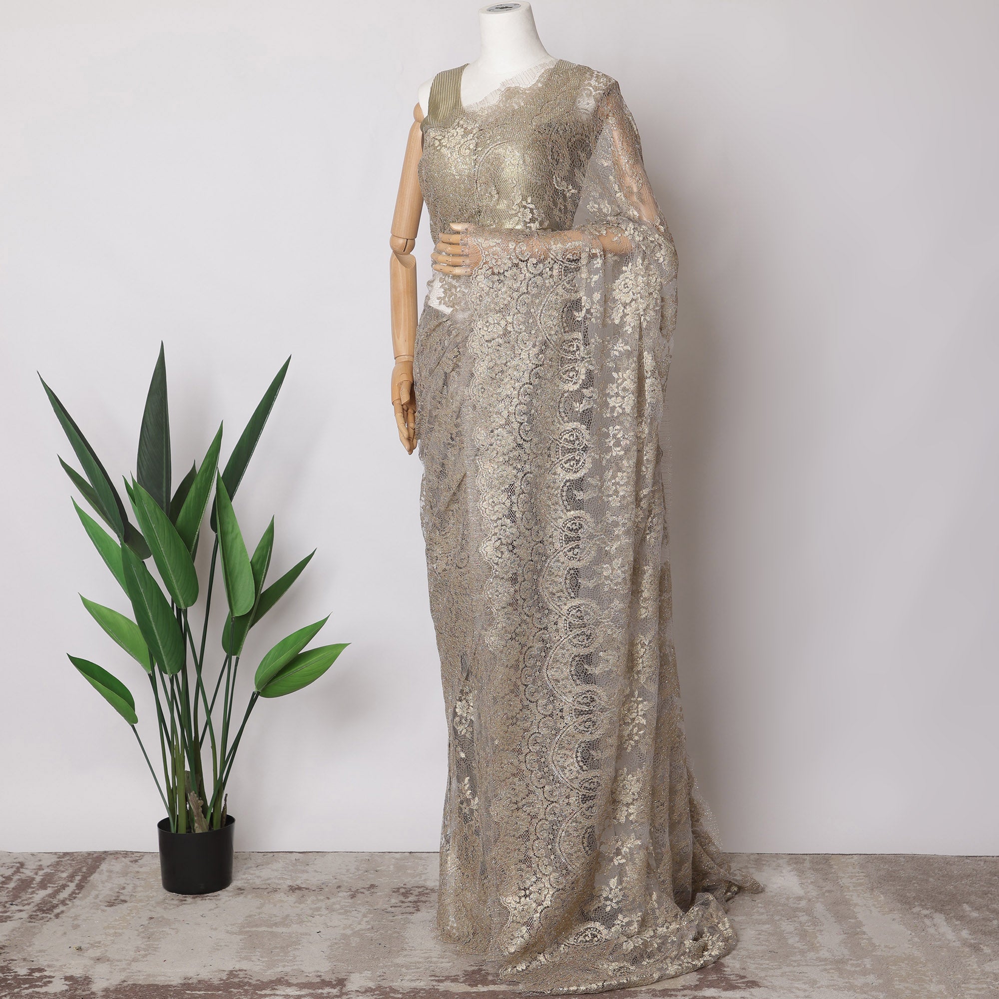 Enhance your wardrobe with this exquisite Rhino grey, gold French metallic Chantilly saree lace fabric, crafted in France for a touch of luxury. Featuring intricate floral designs with shimmering metallic accents, this fabric offers a perfect blend of elegance and sophistication. Measuring 110 cm in width and 5.5 meters in length, it is ideal for creating stunning sarees, gowns, and other couture designs. The lightweight, sheer texture ensures effortless draping, making it a superb choice for weddings and festive occasions. Please note: the blouse shown is for display purposes only and is not included.