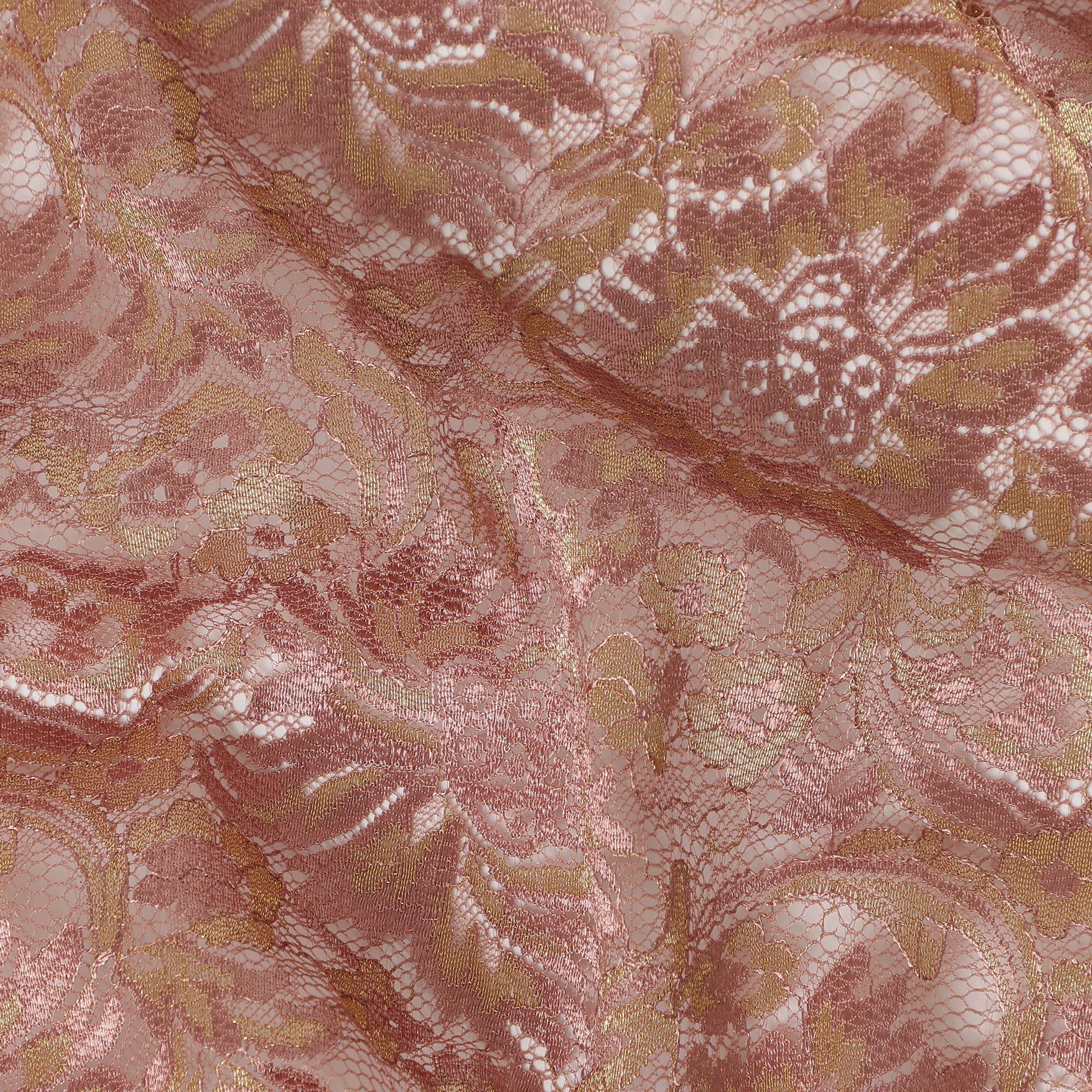 This rose gold synthetic metallic lace fabric features a rich floral embroidery pattern enhanced with a refined metallic sheen that... Read more Read more