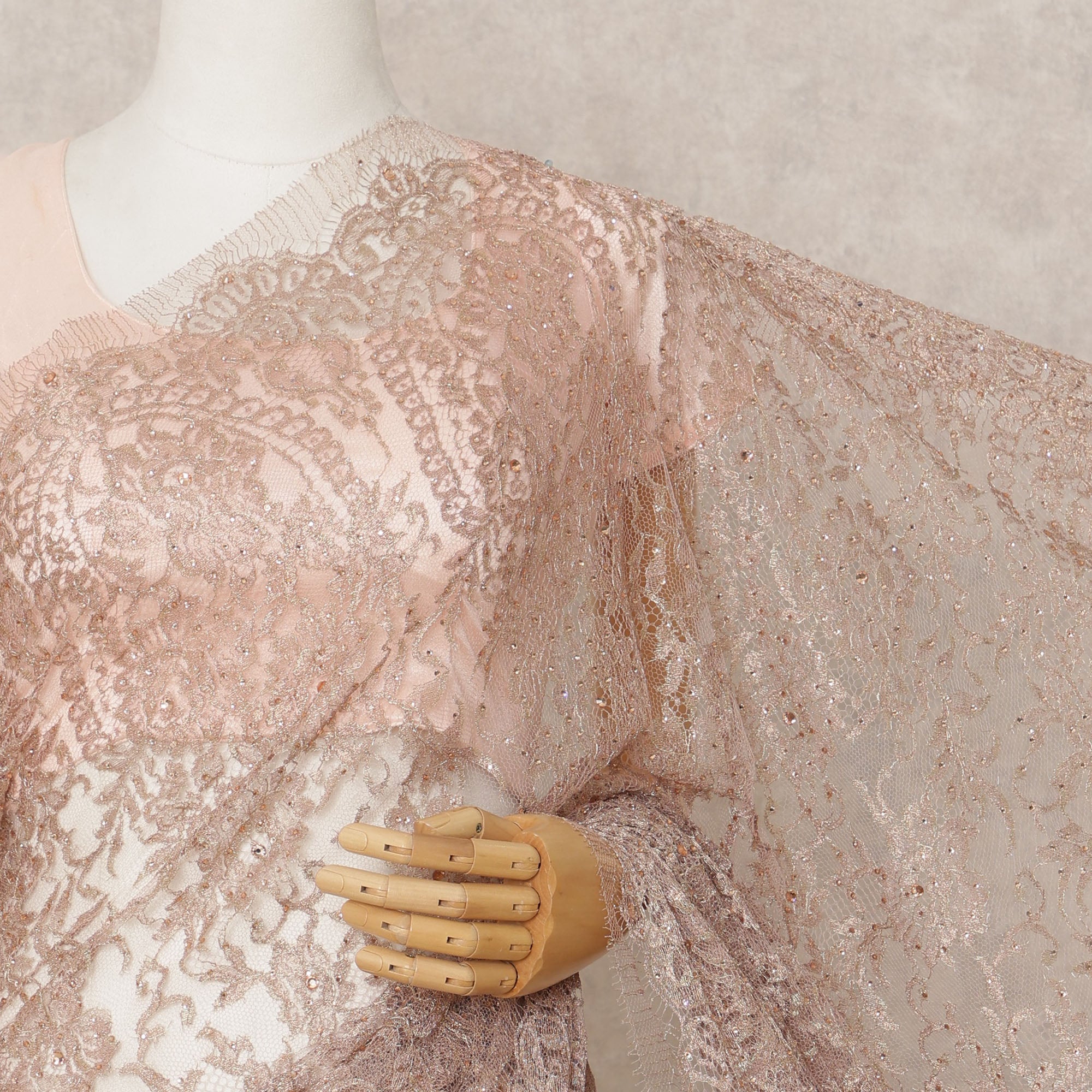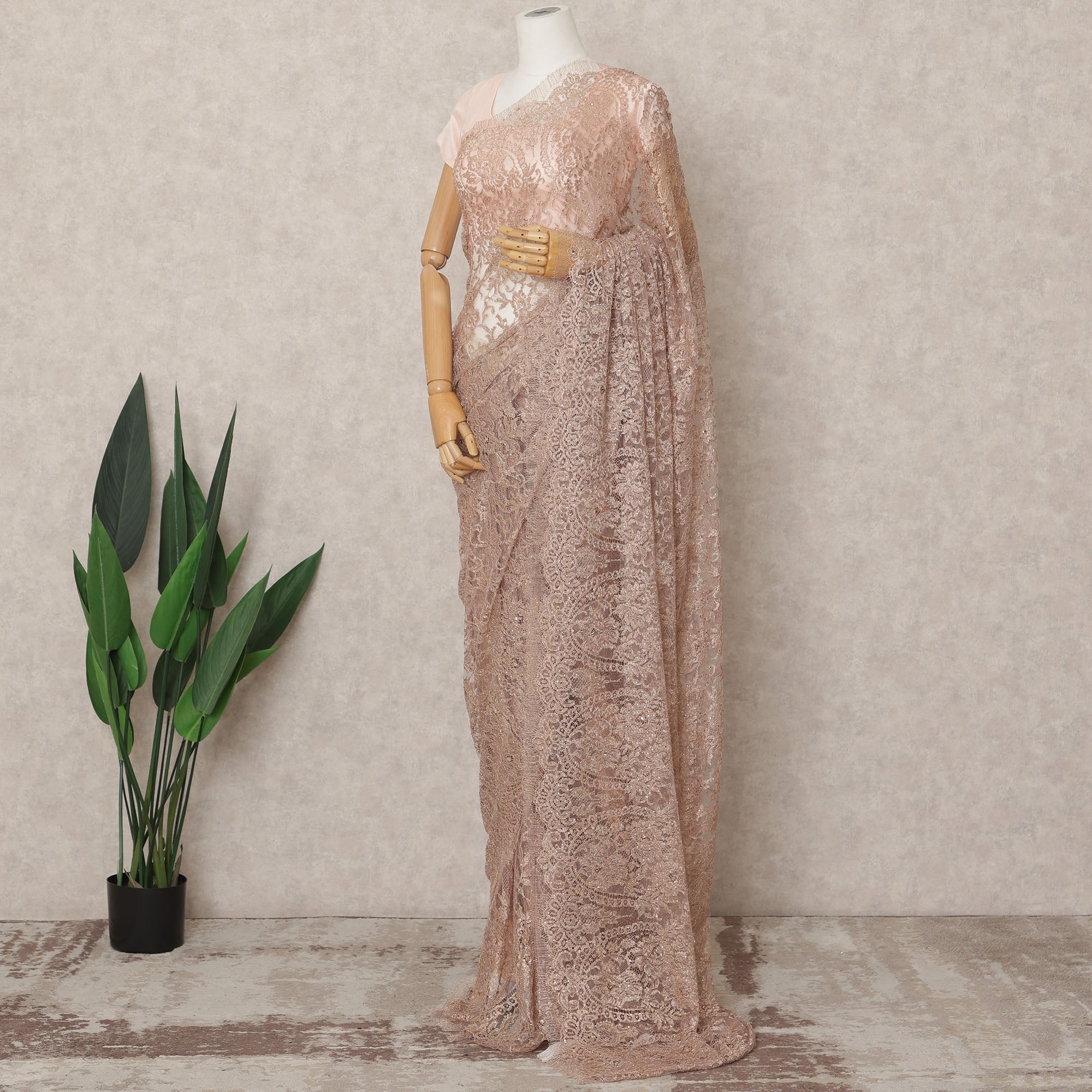 Rose Gold Premium Metallic Chantilly Lace Saree with Stone Work, 5.5 Meters Length, 110 Cms Width, Made in France-D23875