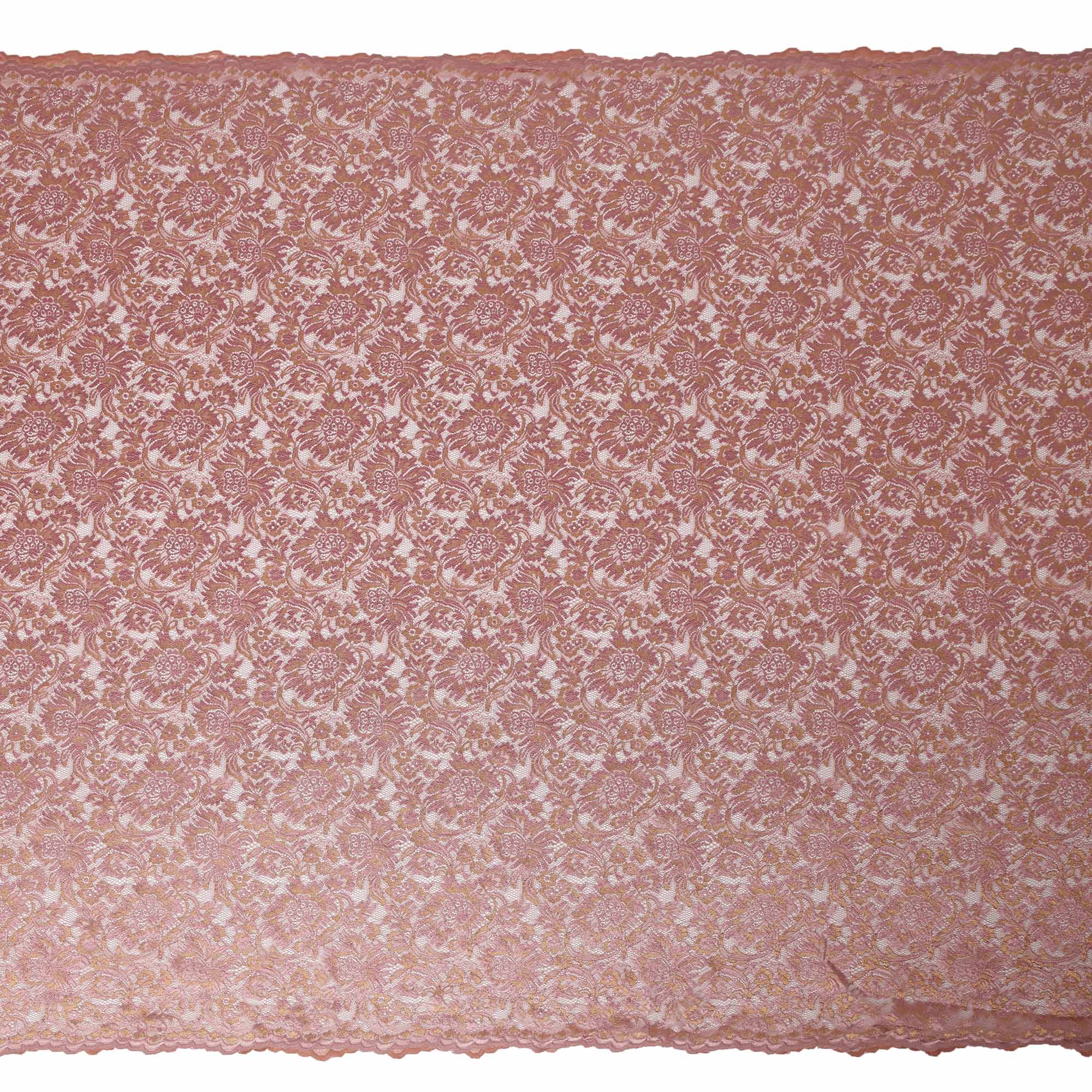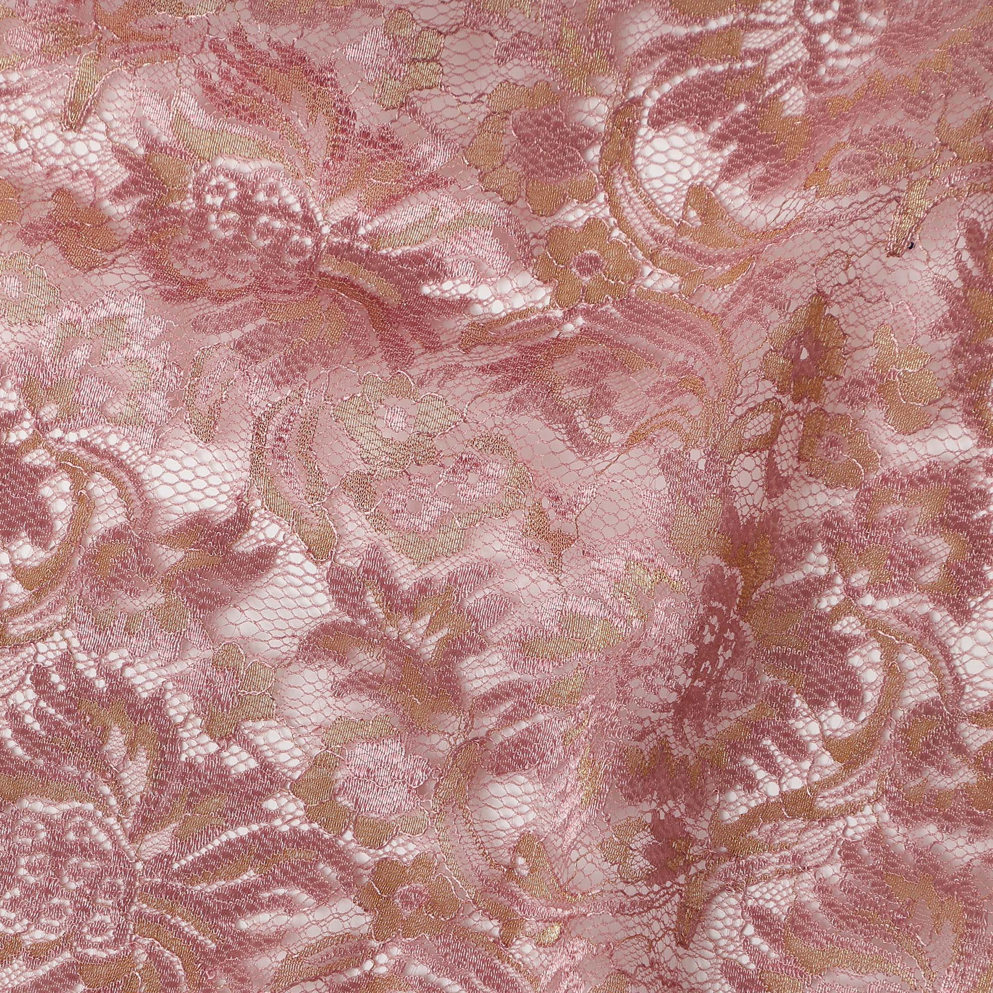 This rose pink synthetic metallic lace fabric features an exquisite floral embroidery design highlighted with a soft metallic shimmer that adds richness and refined elegance to the surface. The delicate lace base is intricately woven to create detailed patterns while remaining lightweight and breathable, making it comfortable and easy to style. The subtle shine enhances the floral motifs without overpowering the overall look, giving the fabric a graceful and premium appeal. Ideal for gowns, blouses, lehengas, saree borders, dupattas, overlays, and festive or bridal wear, this lace fabric elevates both traditional and contemporary designs. Its durable synthetic construction ensures shape retention and ease of handling, making it perfect for statement fashion pieces and layered couture creations.