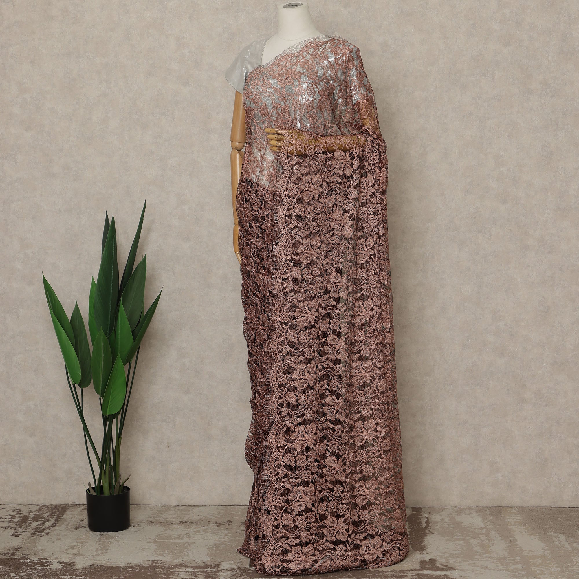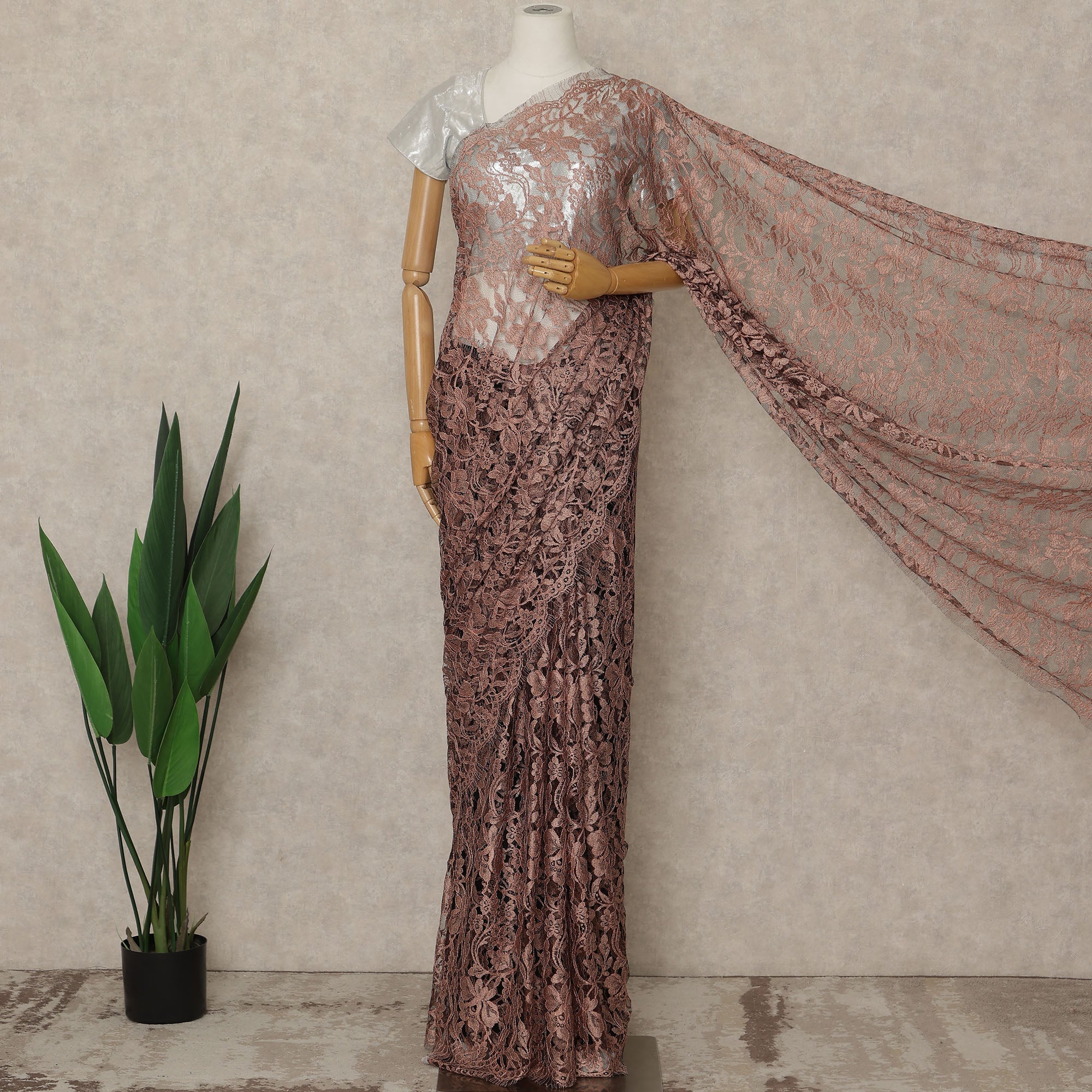 This Rose Pink Premium French 2 Tone Chantilly Saree Lace showcases an enchanting blend of soft rosy-brown tones merged with a delicate metallic sheen, creating a luxurious dual-tone effect that beautifully enhances the intricate floral patterns of authentic French Chantilly craftsmanship; crafted in France with refined lace-weaving expertise, this approximately 5.5-meter saree lace offers an elegant, airy transparency and smooth, fluid drape ideal for haute couture sarees, bridal ensembles, festive wear, and designer creations, while its fine texture, rich detailing, and lightweight structure ensure a graceful fall and sophisticated finish—blouse not included.
