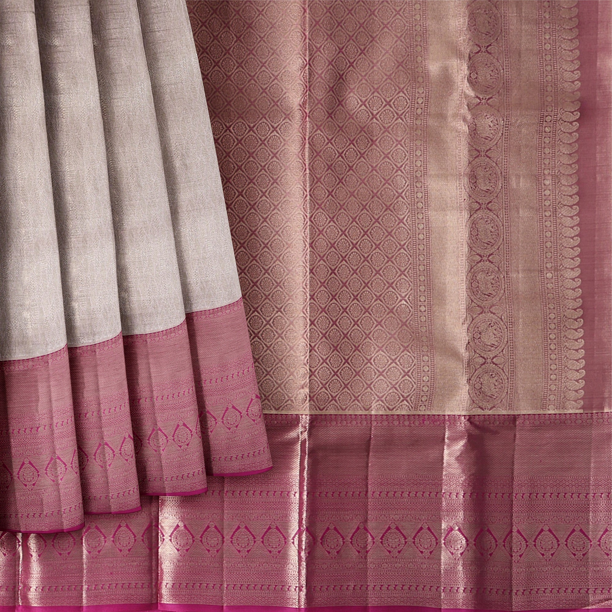 A tribute to tradition and grace, this Rose Pink Pure Silk Kanjeevaram Saree narrates a story of heritage through its radiant dual tone. Handwoven over 48 meticulous hours, its lustrous ivory body reflects timeless elegance, while the rich rose pink border gleams with intricate geometric zari patterns, reminiscent of temple engravings and artistic murals. Crafted by master weavers using premium mulberry silk, this saree drapes effortlessly and elevates your presence with regality. Each fold captures the essence of tradition and luxury, making it a perfect choice for weddings, rituals, and festive grandeur. Shop online to bring home an heirloom of handloom excellence.